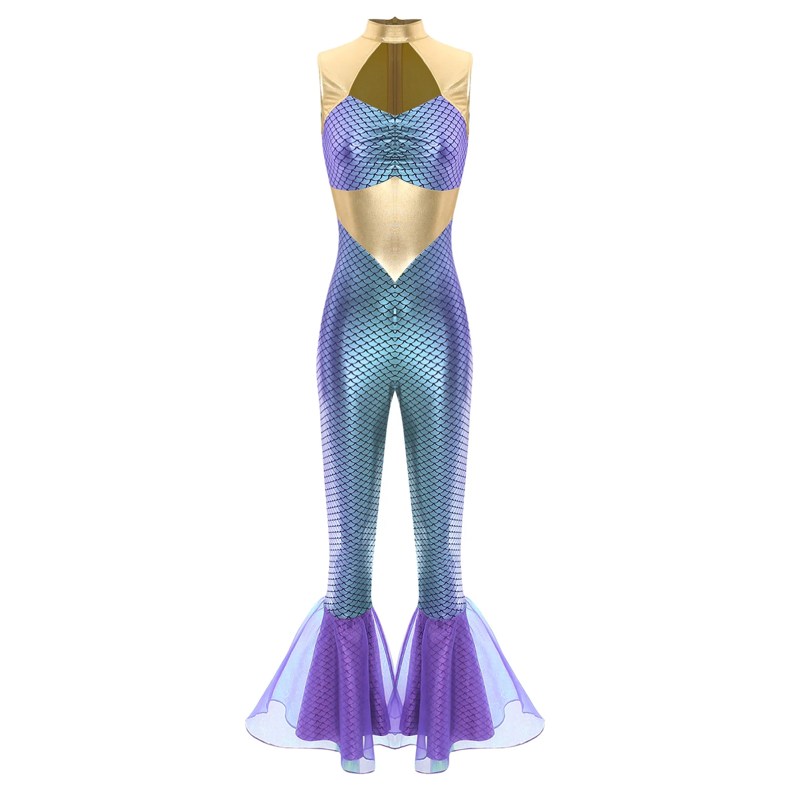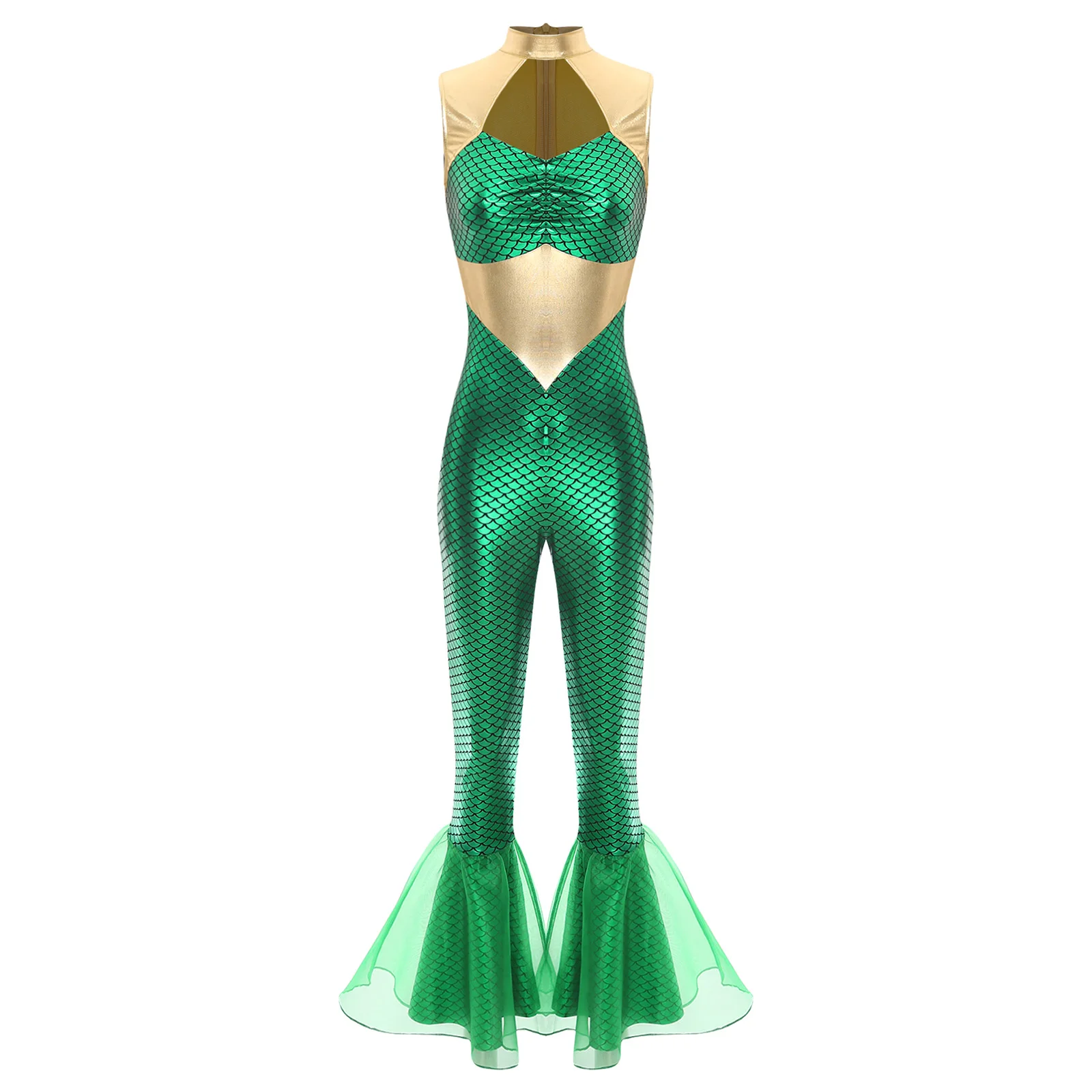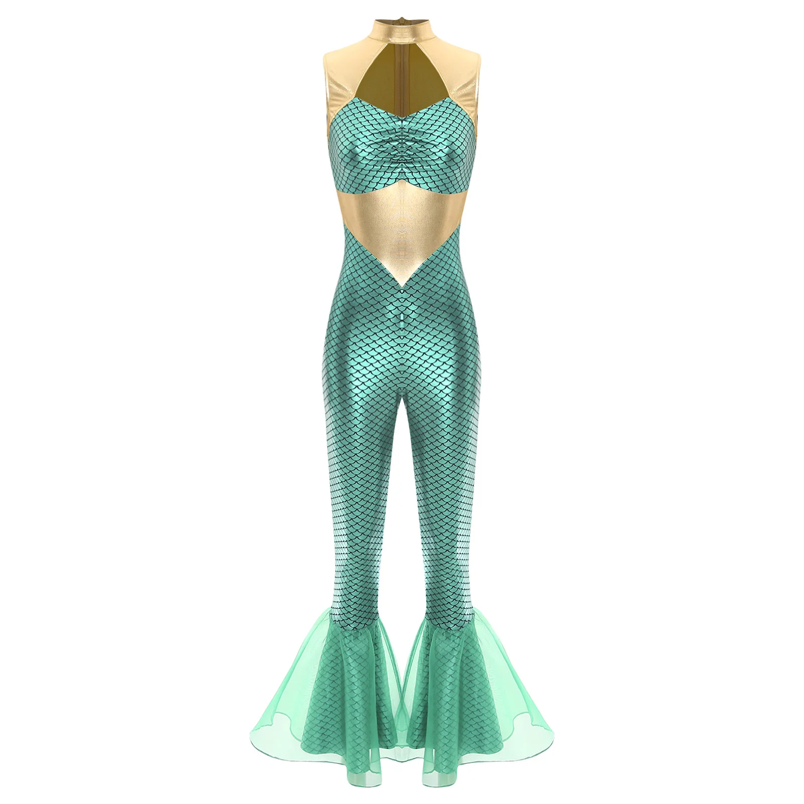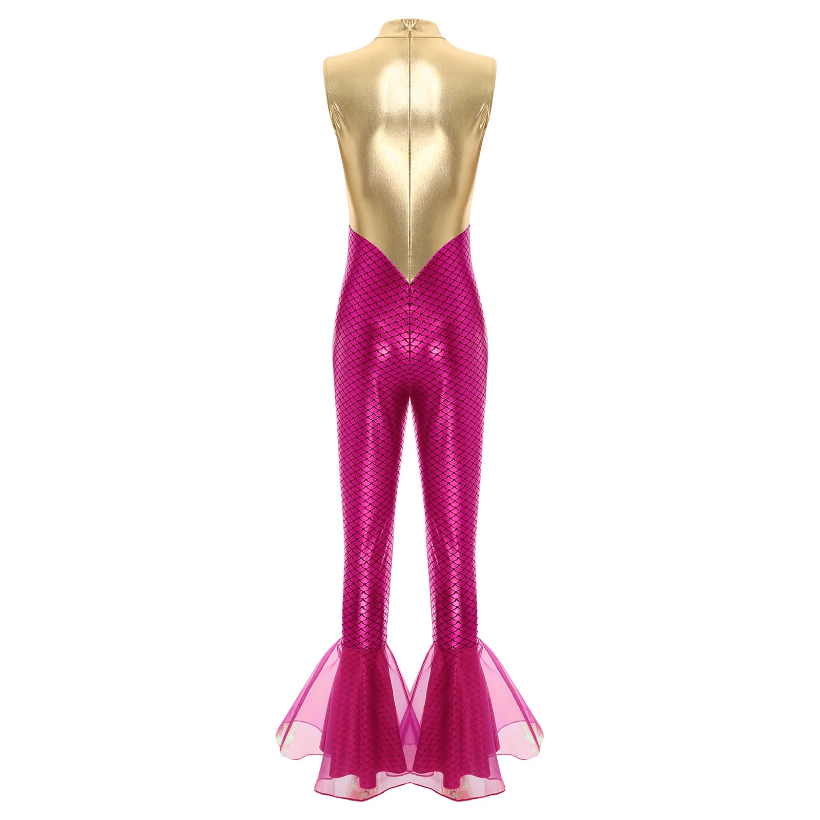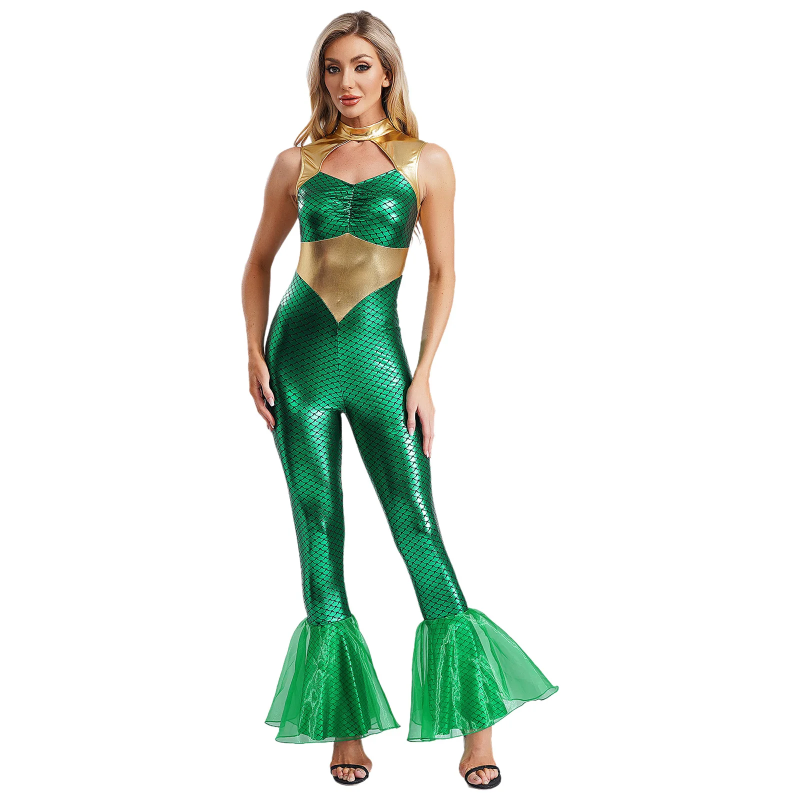 Women Mermaid Cosplay Performance Theme Party Costume Cutout Front Metallic Fish Scales Pattern Patchwork Flared Hem Jumpsuit