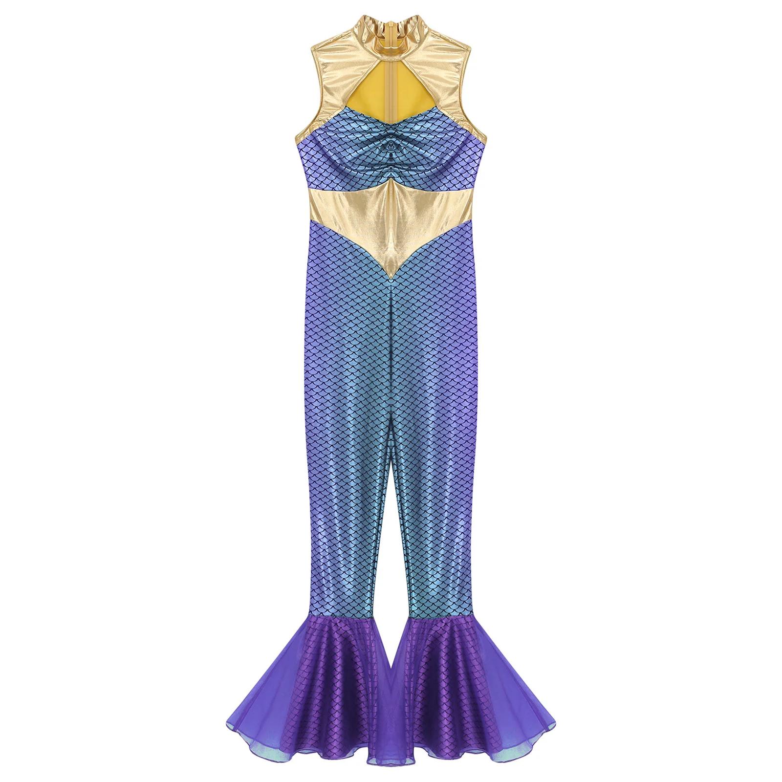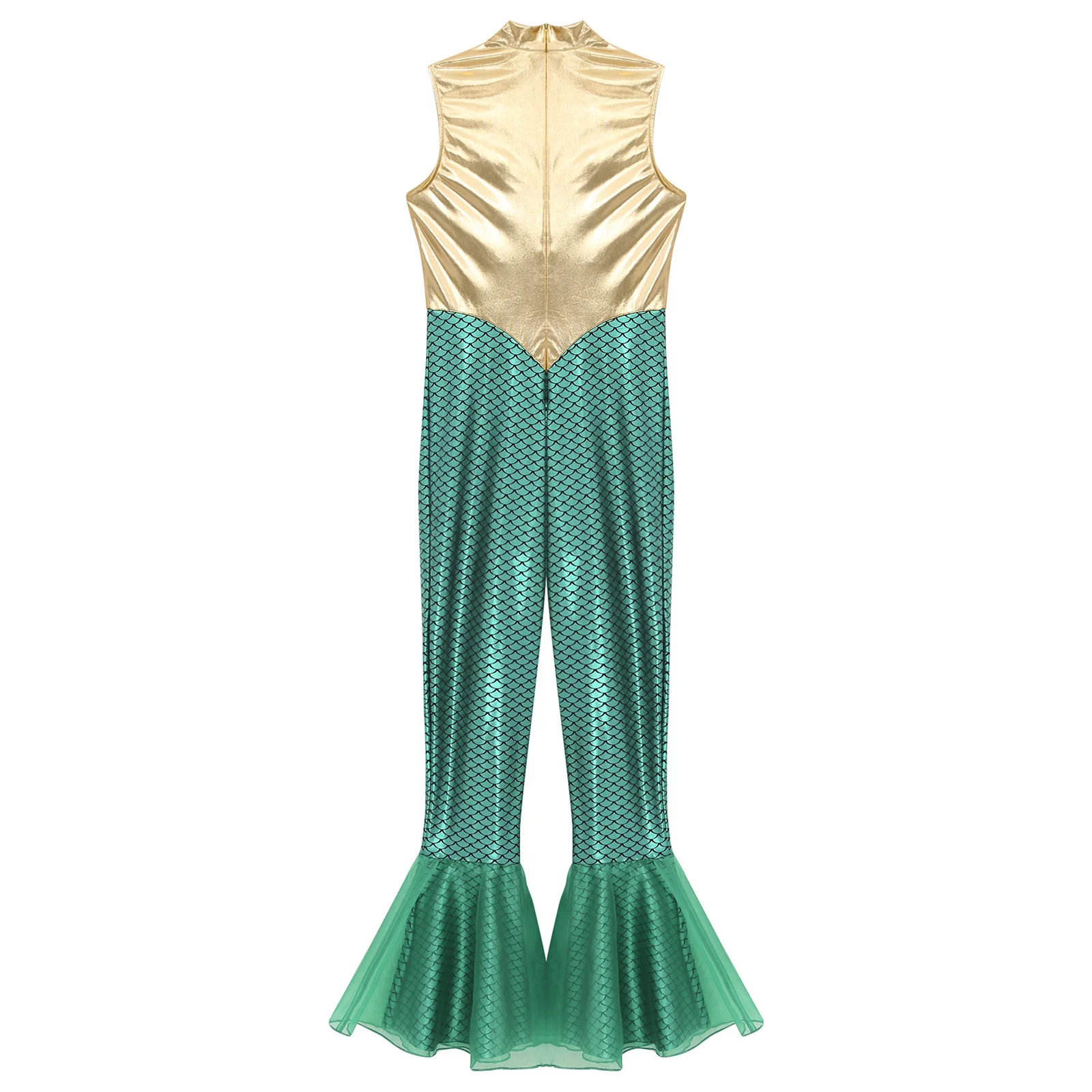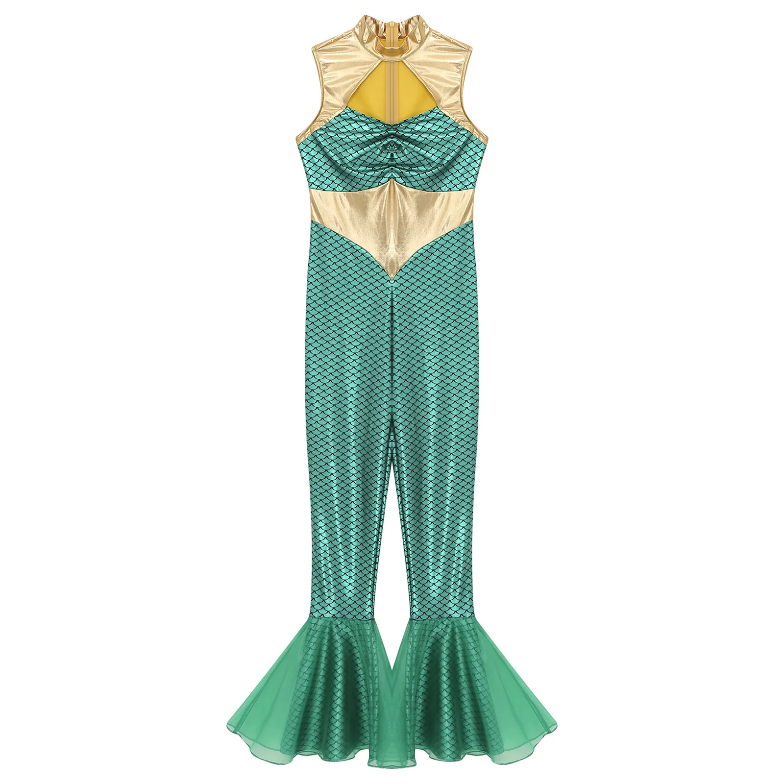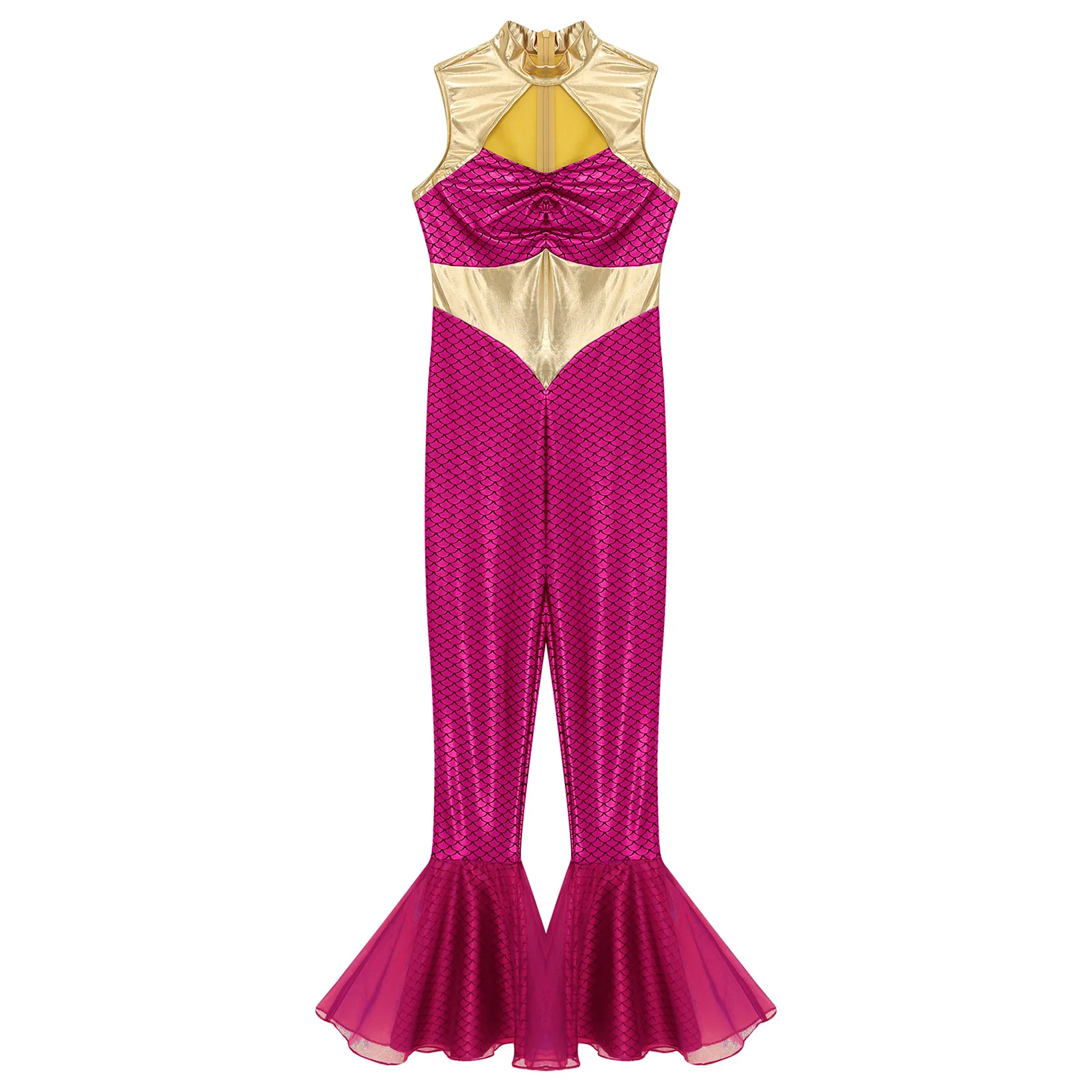 Women Mermaid Cosplay Performance Theme Party Costume Cutout Front Metallic Fish Scales Pattern Patchwork Flared Hem Jumpsuit