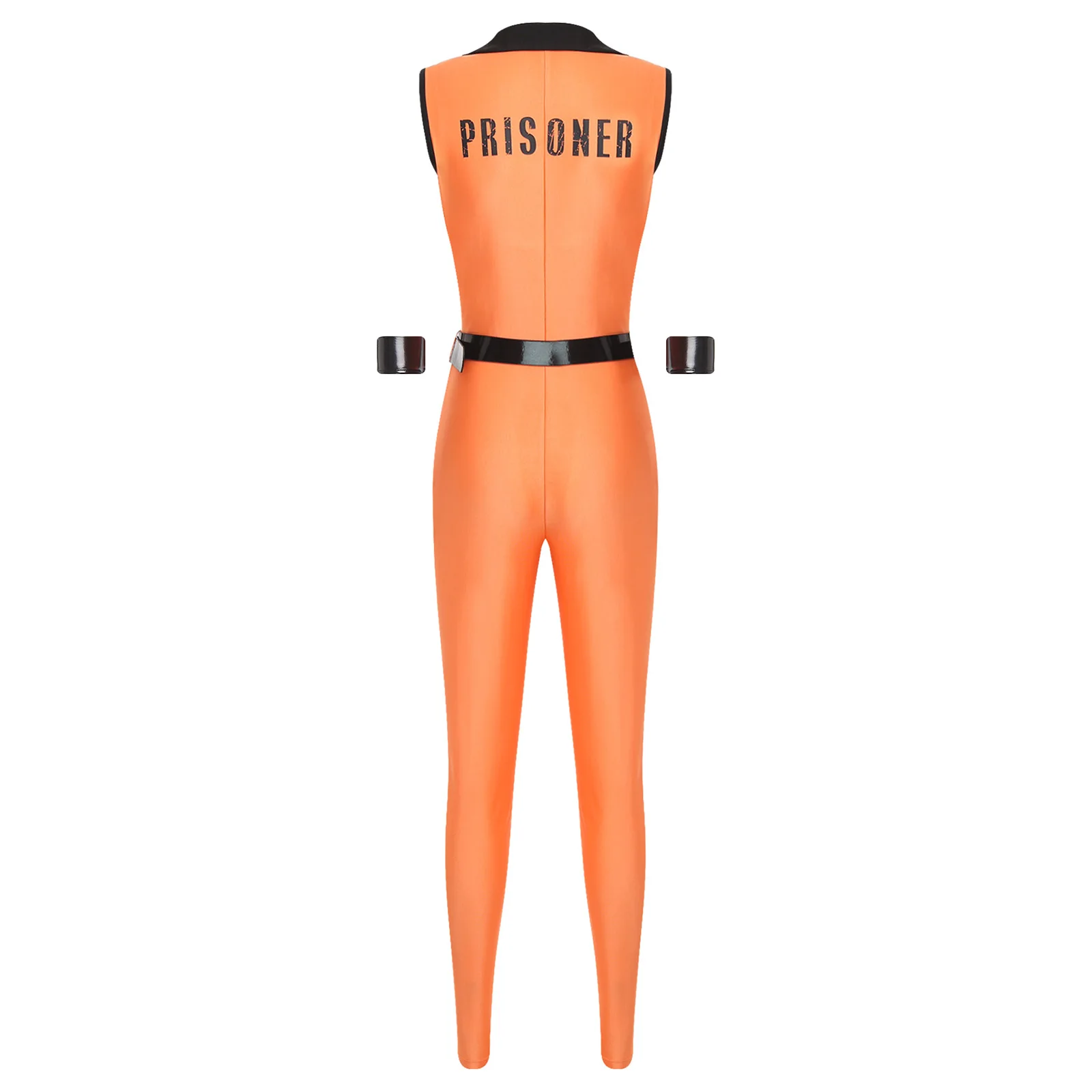 Women Orange Jail Convict Prisoner Cosplay Costume Theme Party Outfit Prison Uniform Jumpsuit with Faux Leather Belt and Cuffs
