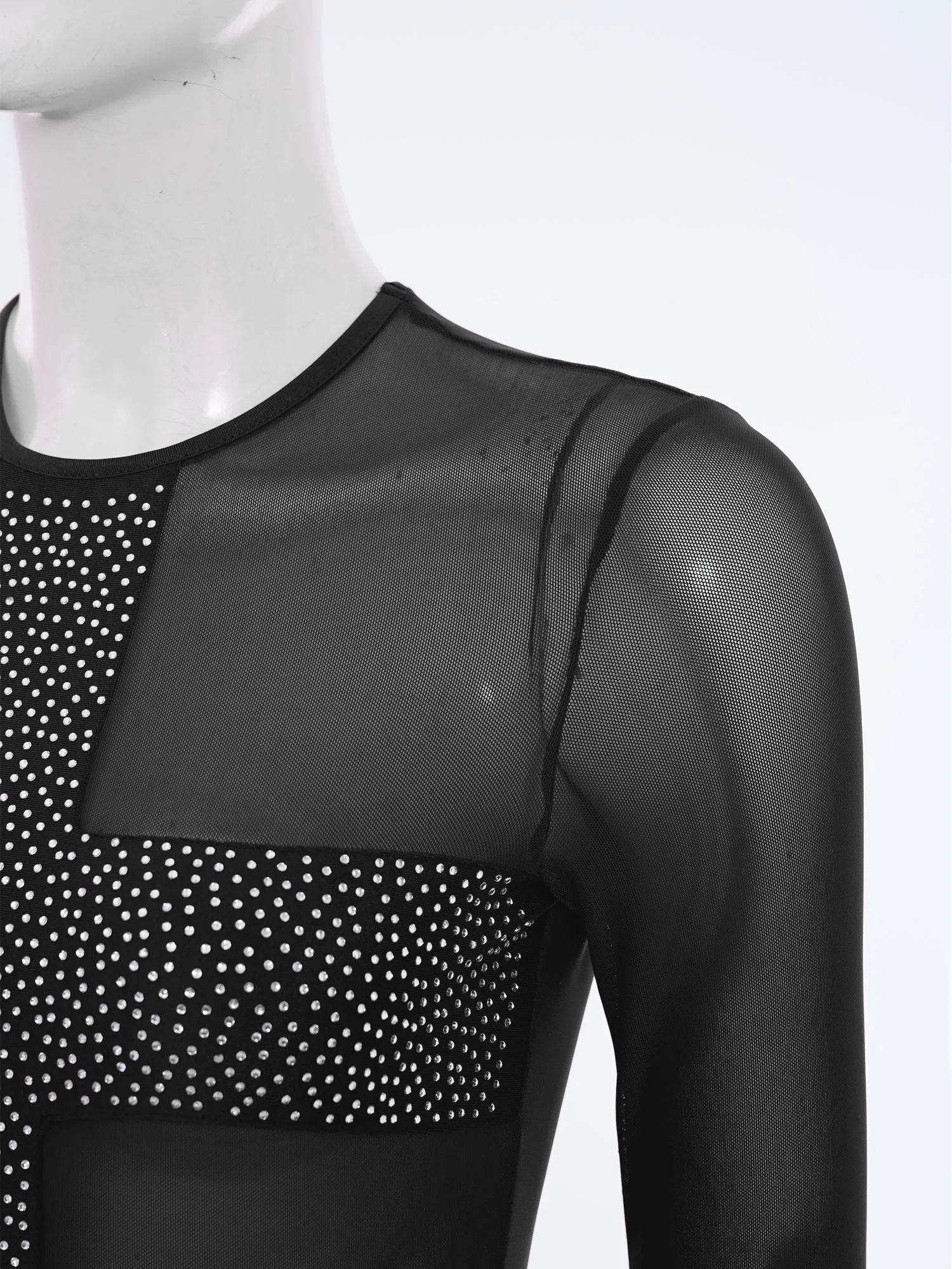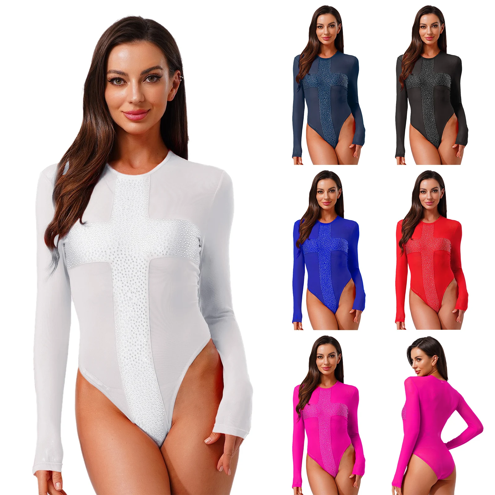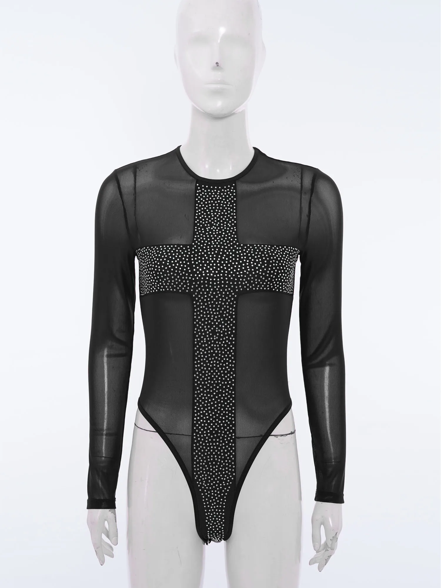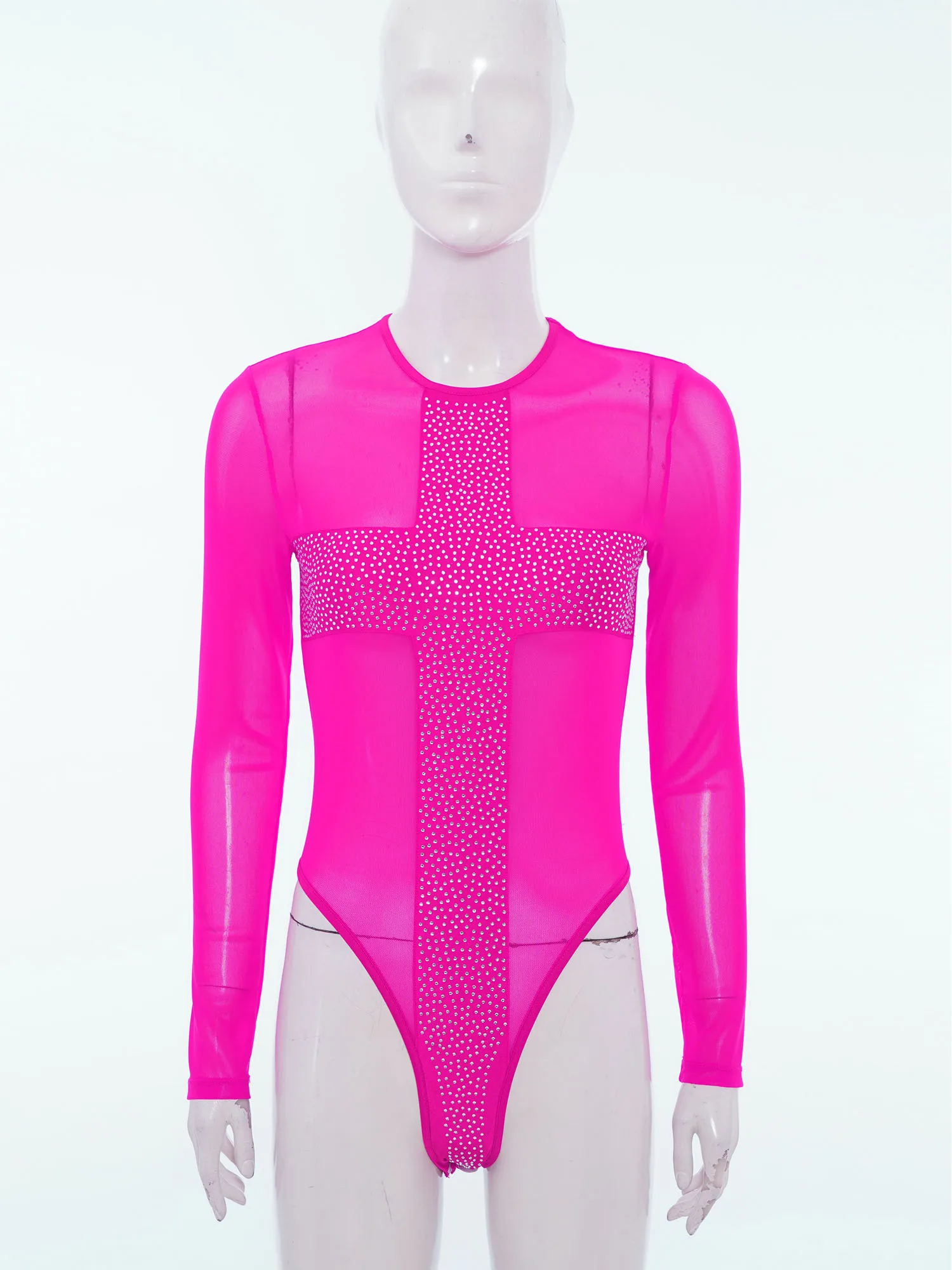 Women Rhinestones Sheer Mesh Bodysuits Dance Raves Party Clubwear Crew Neck Long Sleeve Buttons Crotch Leotard Swimwear Cover Up