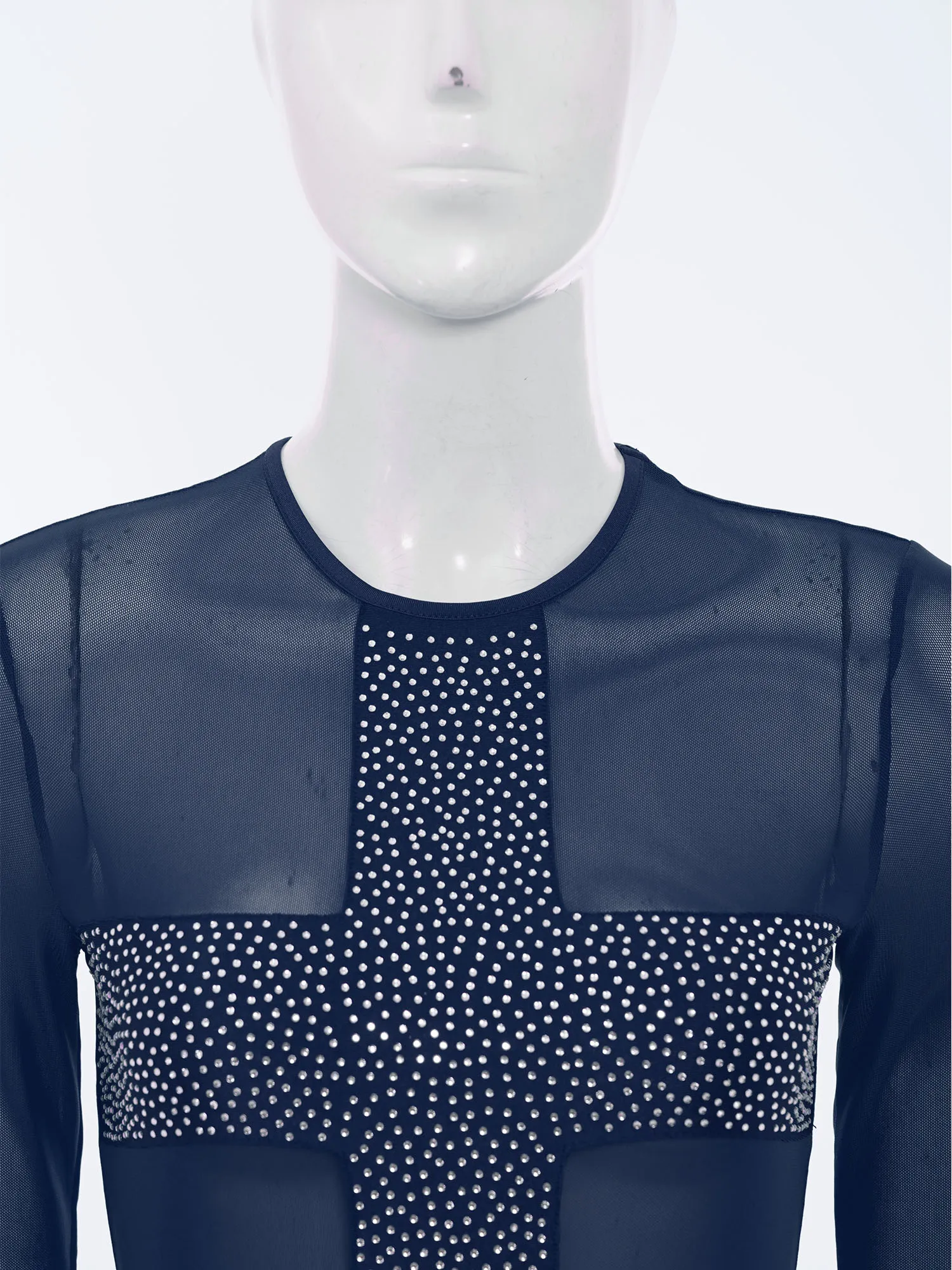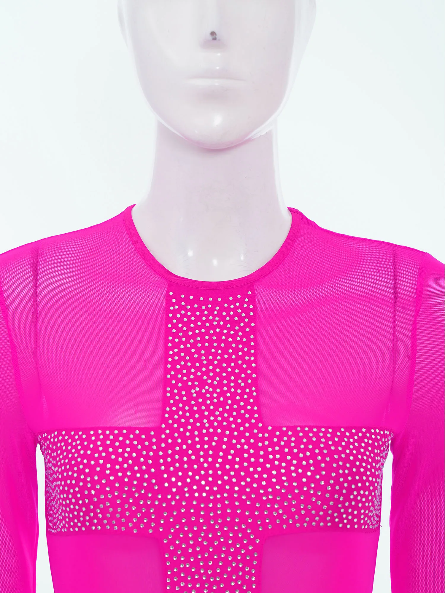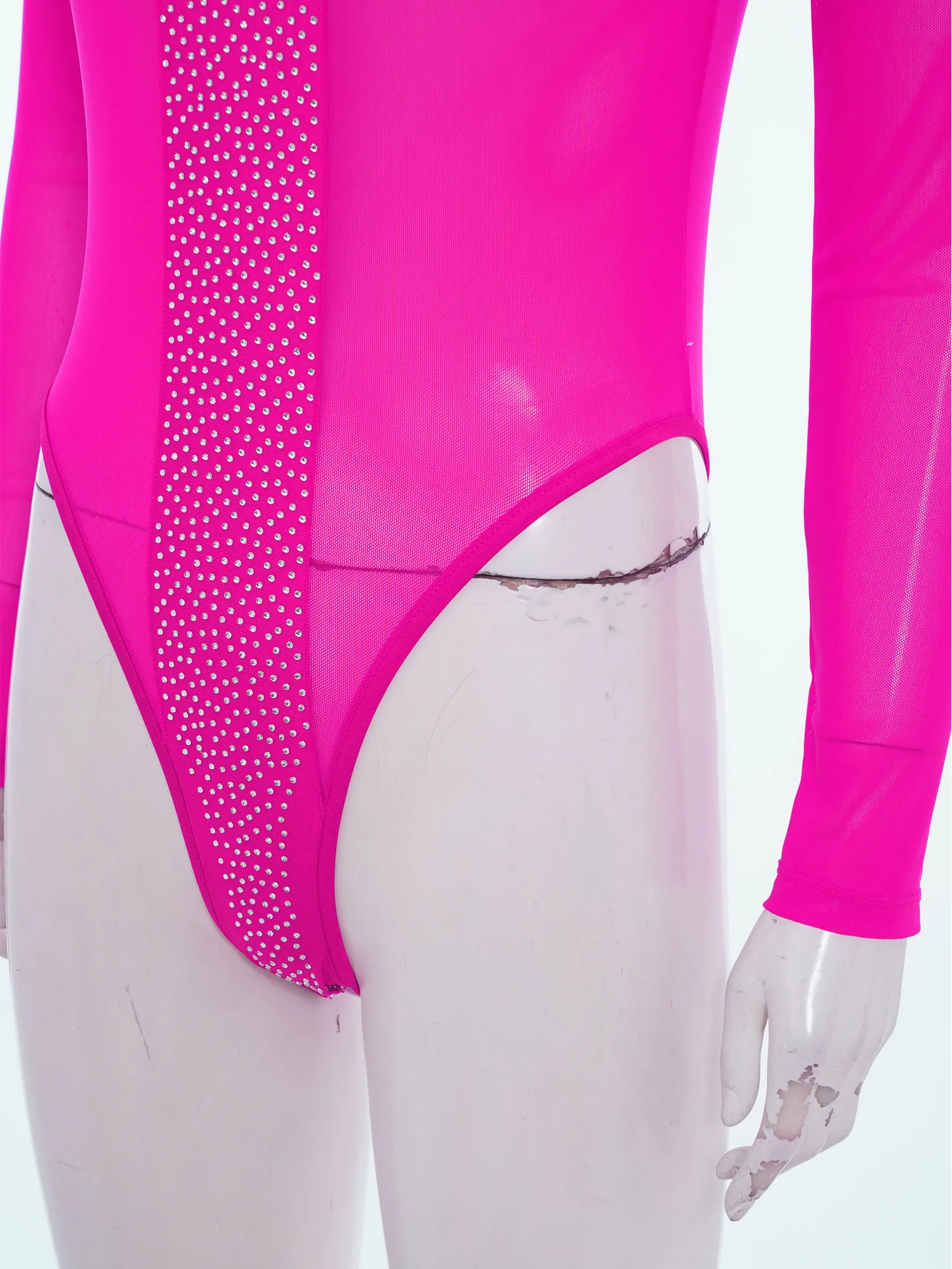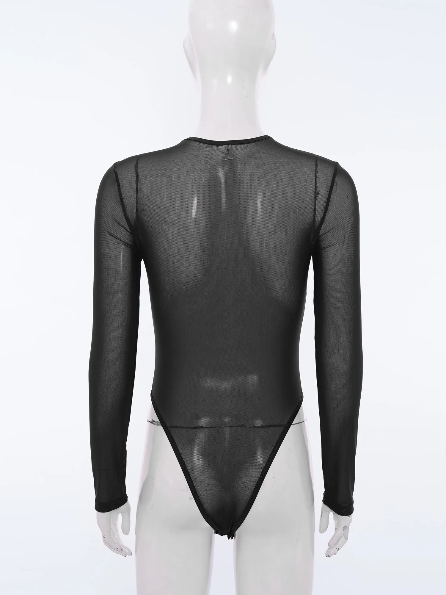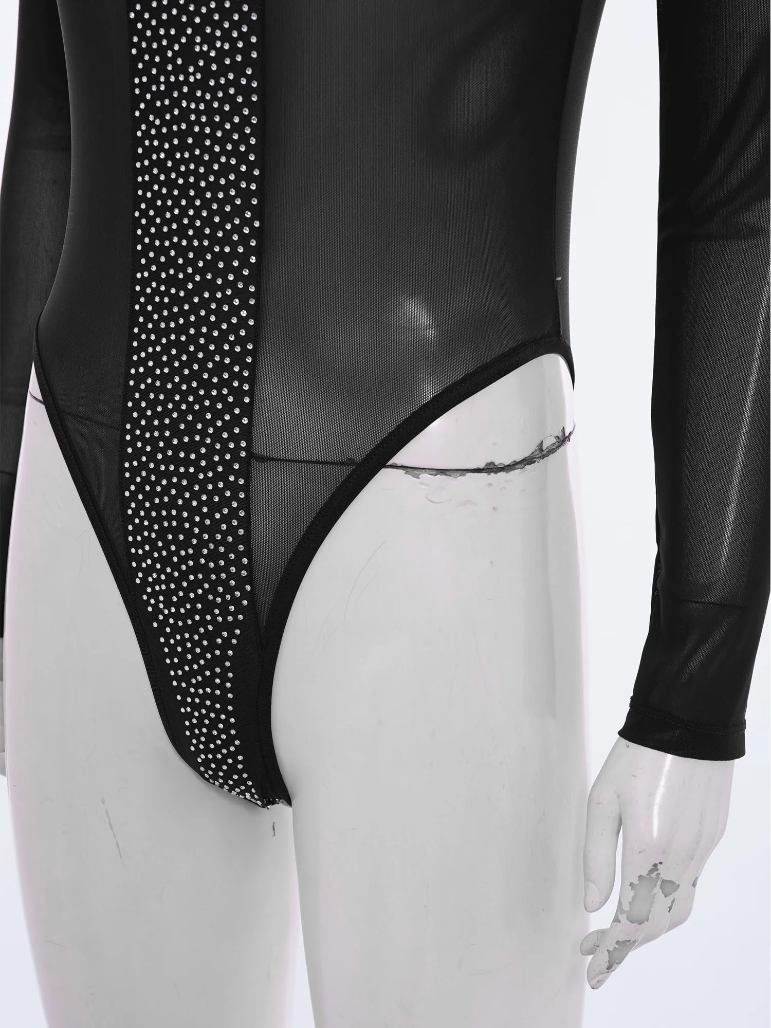 Women Rhinestones Sheer Mesh Bodysuits Dance Raves Party Clubwear Crew Neck Long Sleeve Buttons Crotch Leotard Swimwear Cover Up
