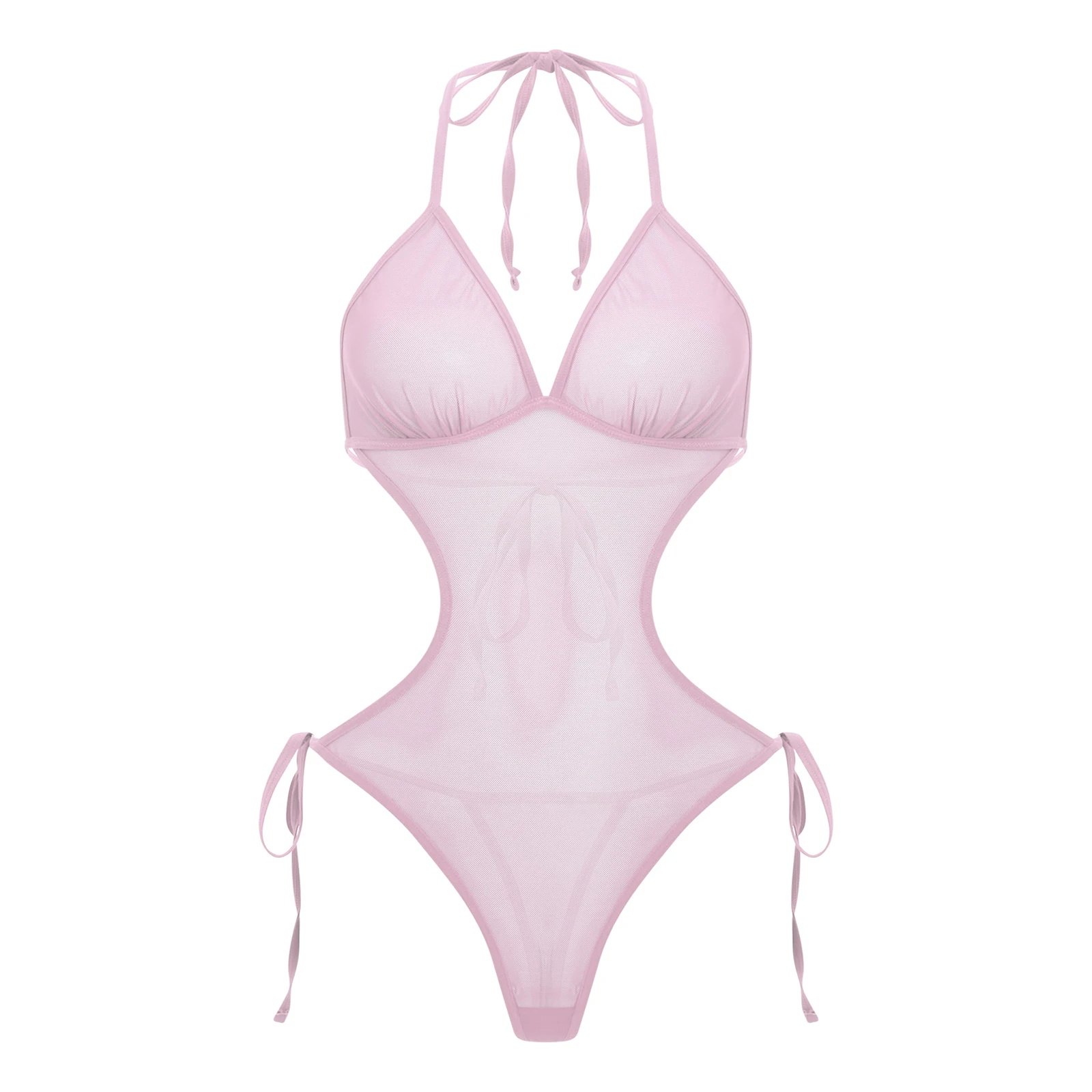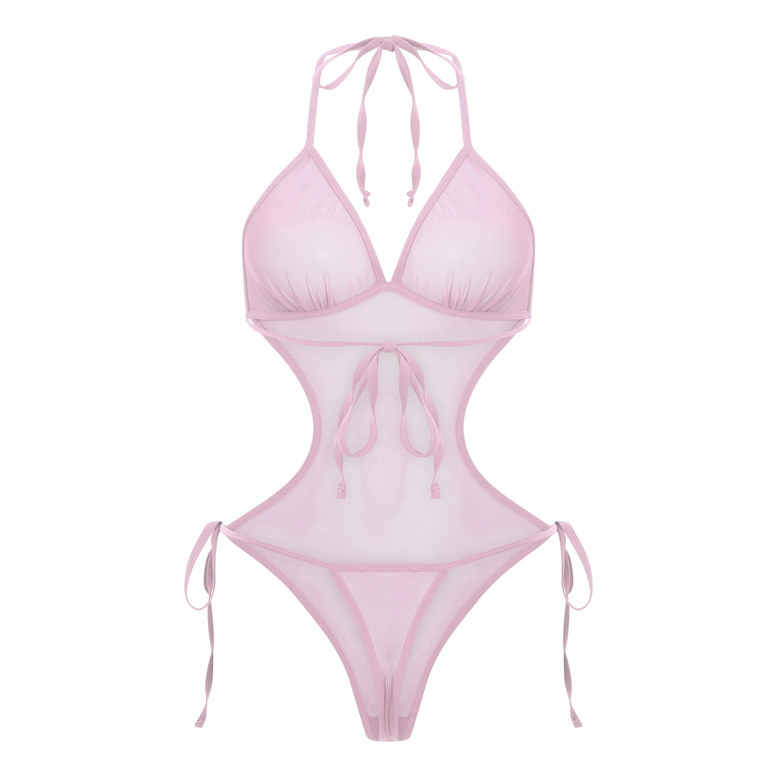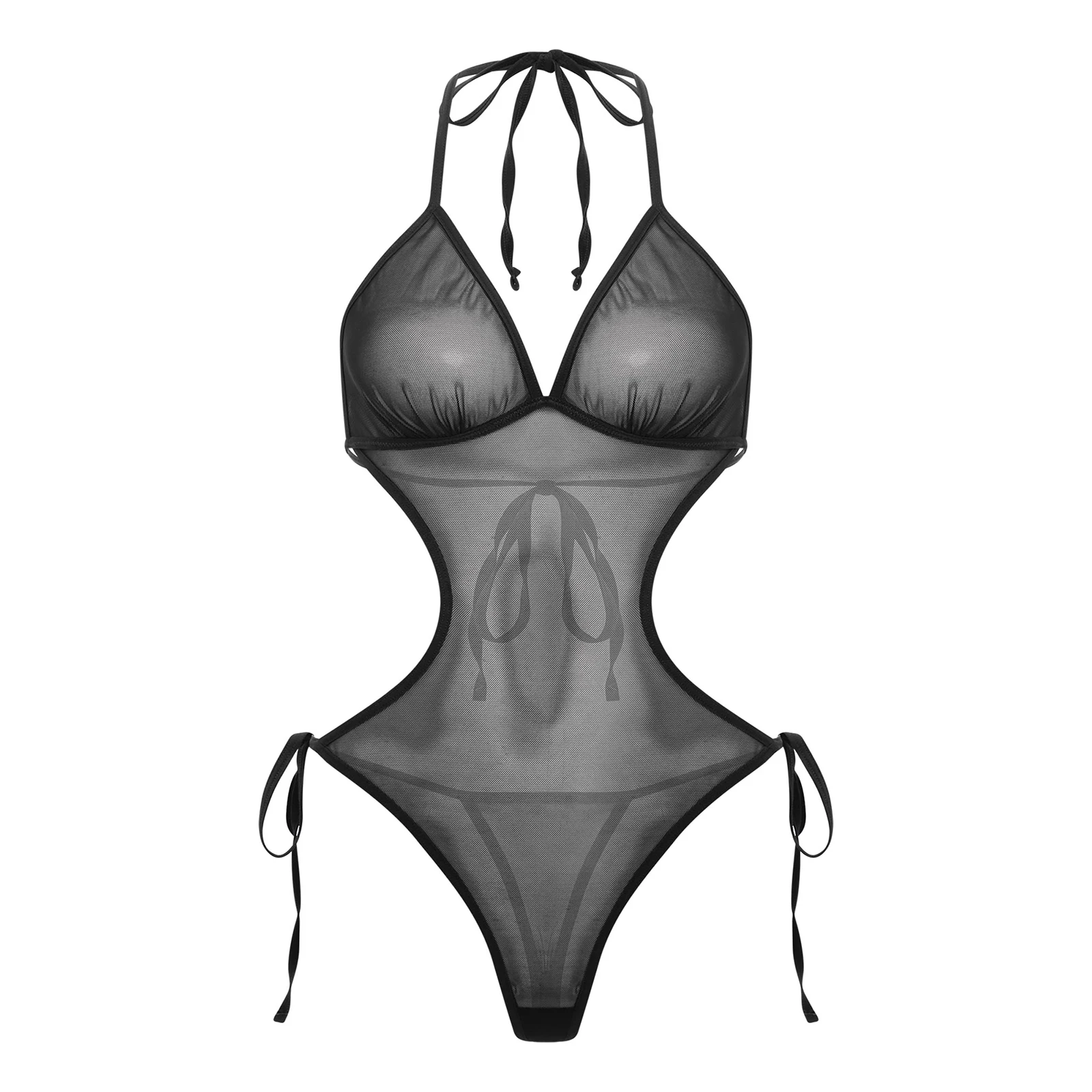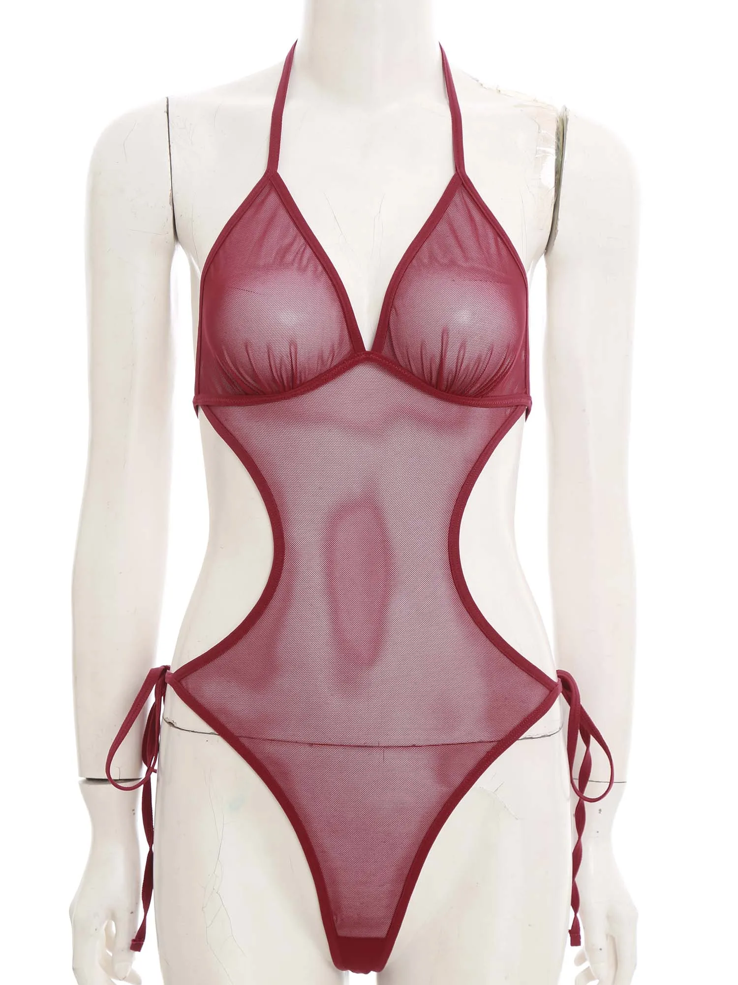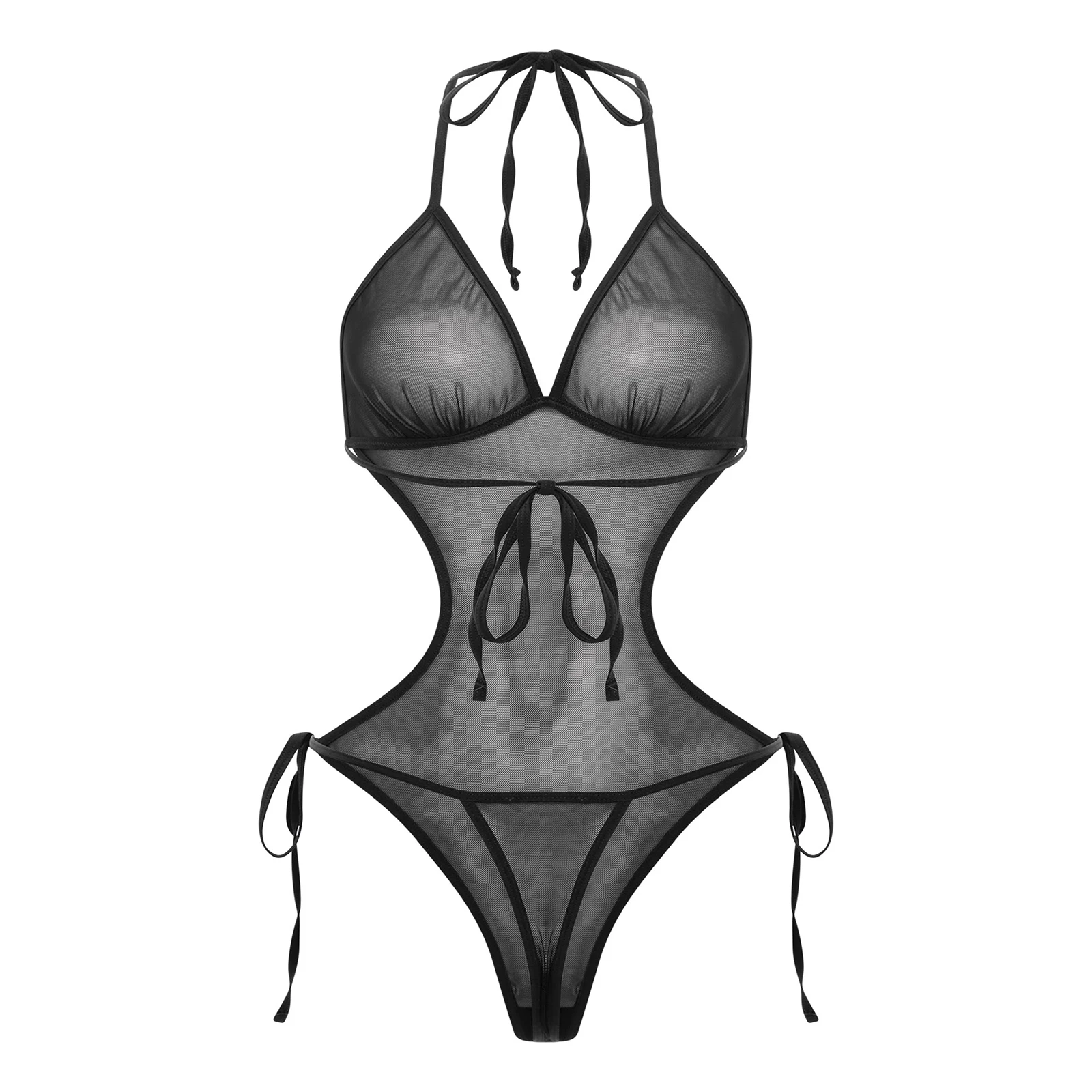 Women See Through Sheer Mesh One-piece Bodysuit Swimwear Halter T-back Lace-up Leotard One Piece Nightwear Jumpsuit Bathing Suit