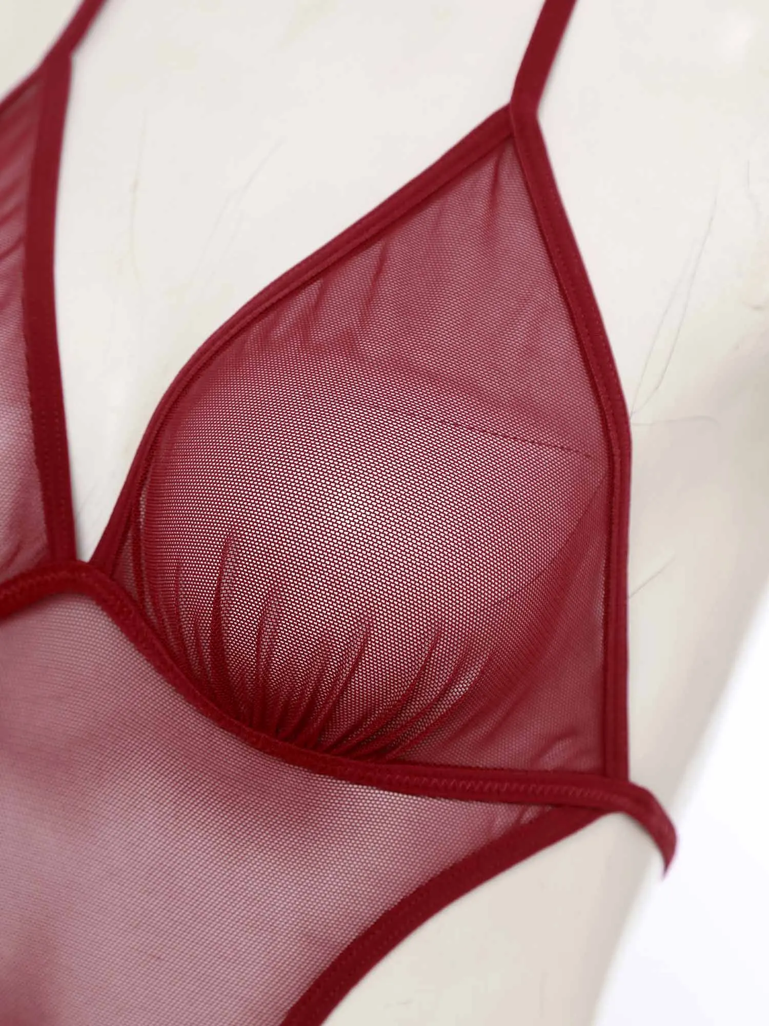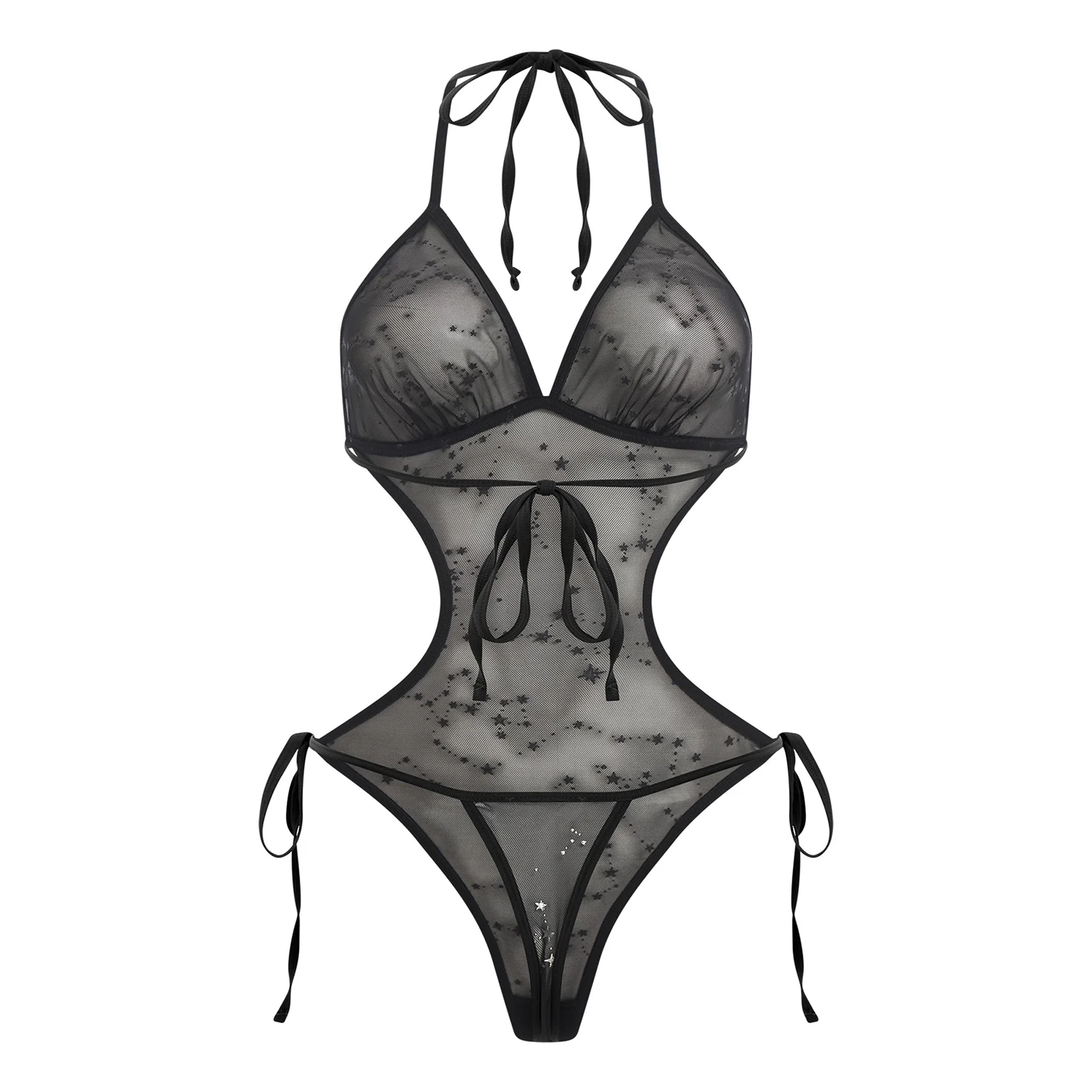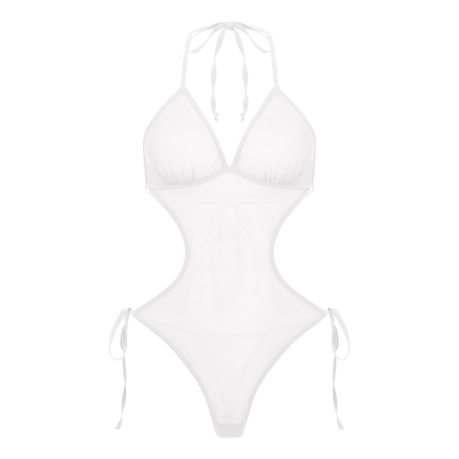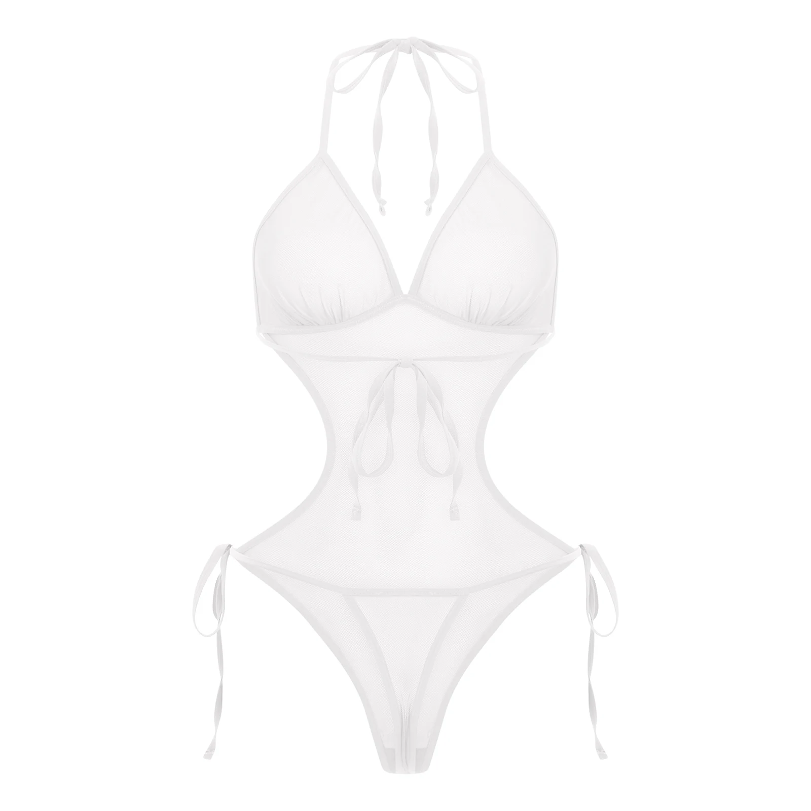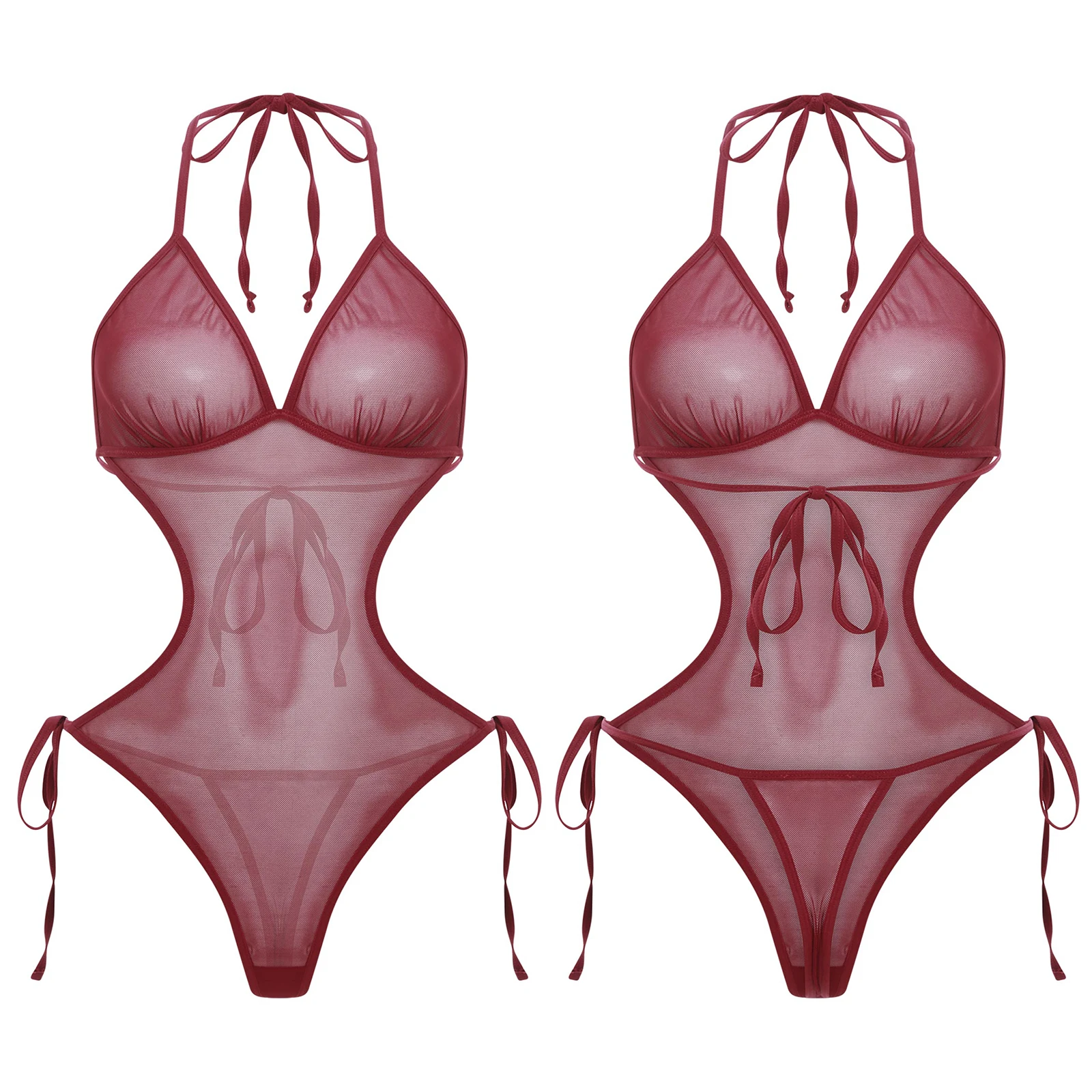 Women See Through Sheer Mesh One-piece Bodysuit Swimwear Halter T-back Lace-up Leotard One Piece Nightwear Jumpsuit Bathing Suit