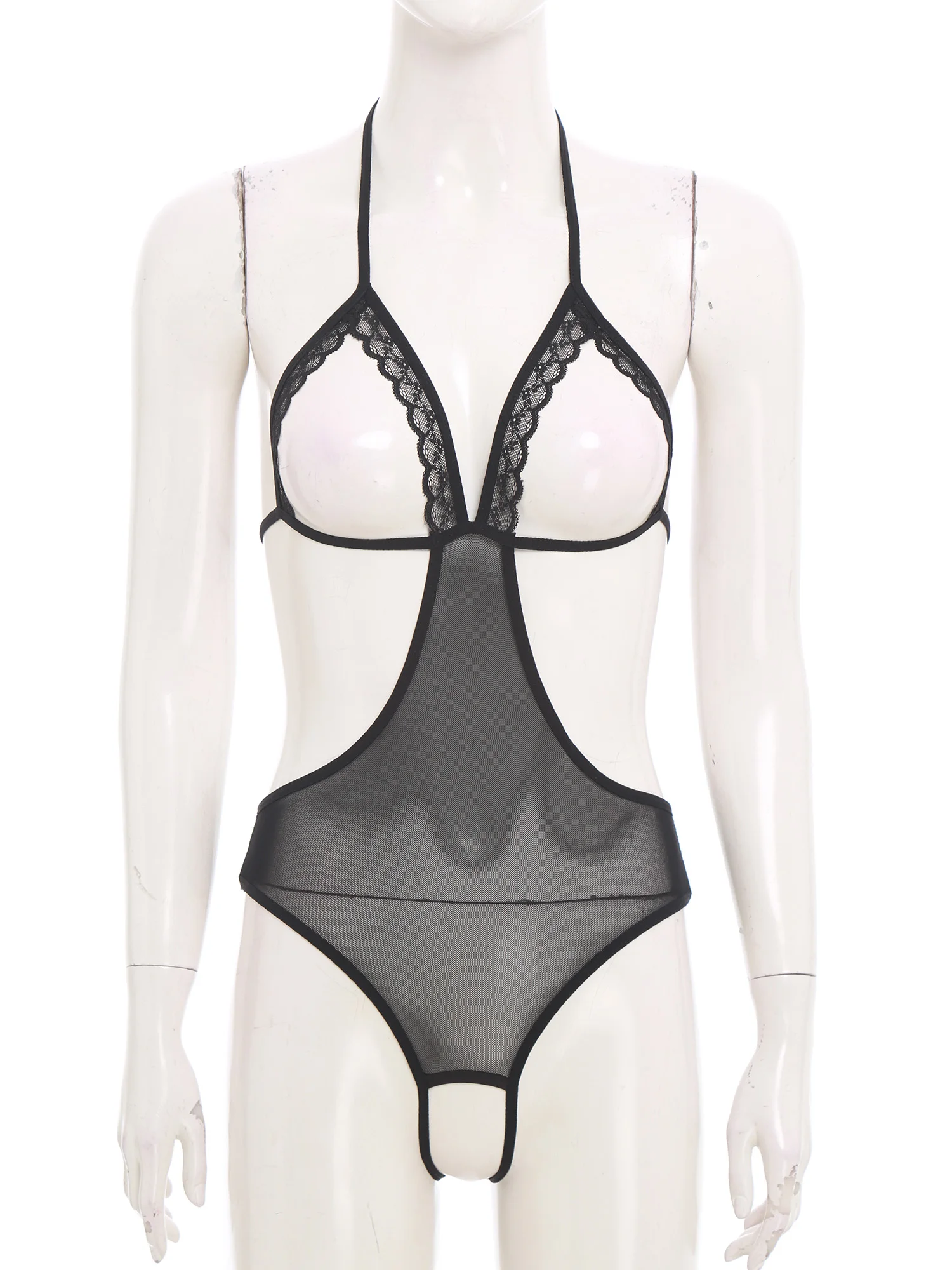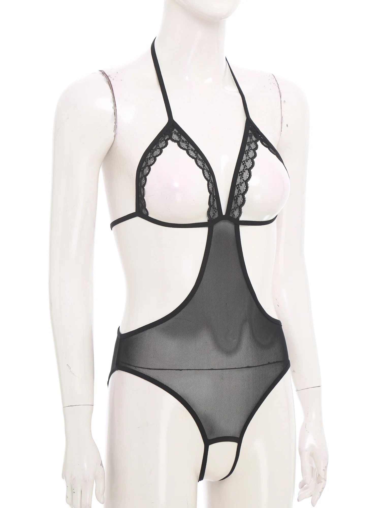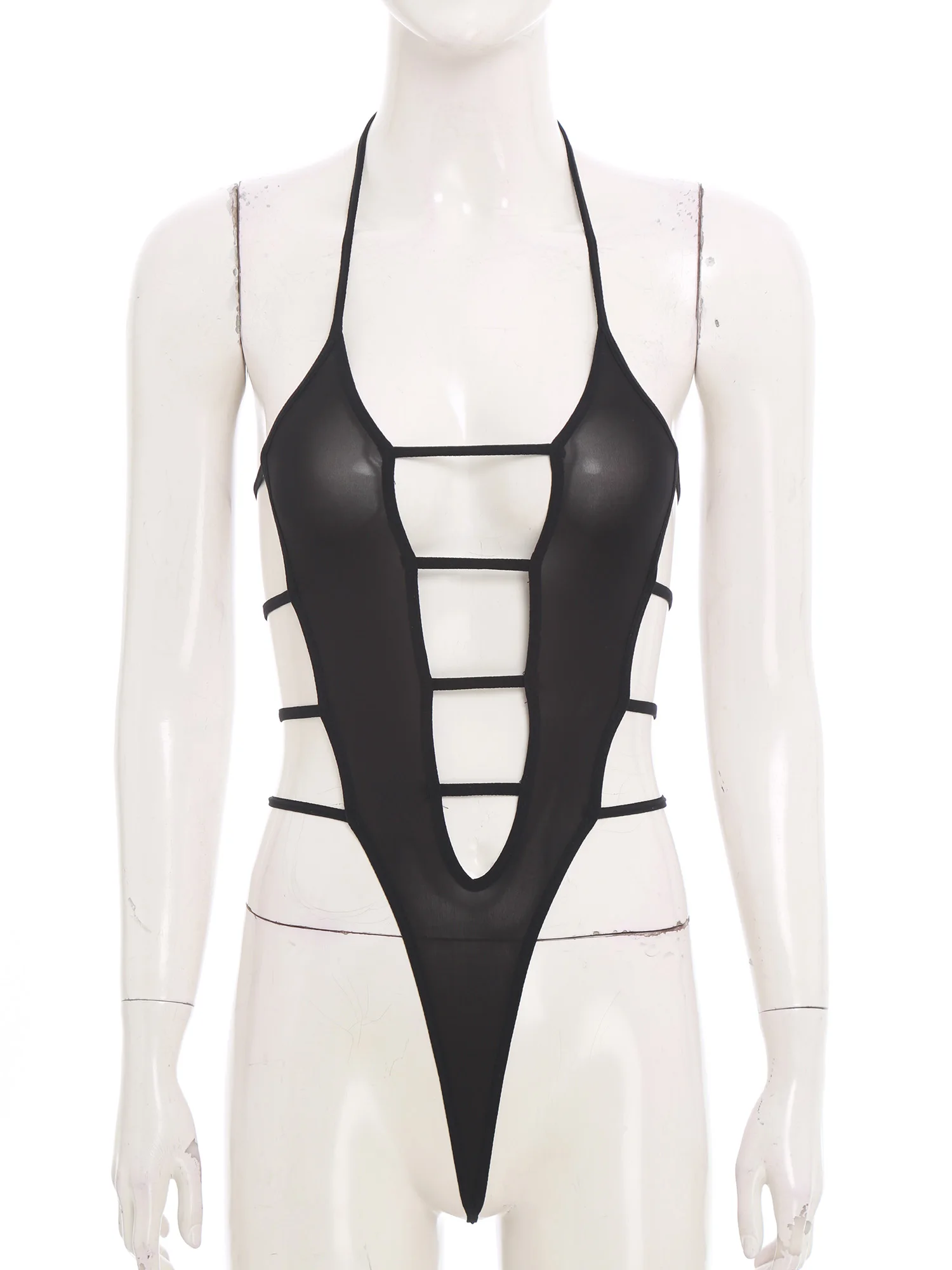 Women Sheer Hollow Out Bodysuit Swimwear See-through Mesh Halter T-back Bikini Leotard One Piece Jumpsuit Nightwear Beachwear