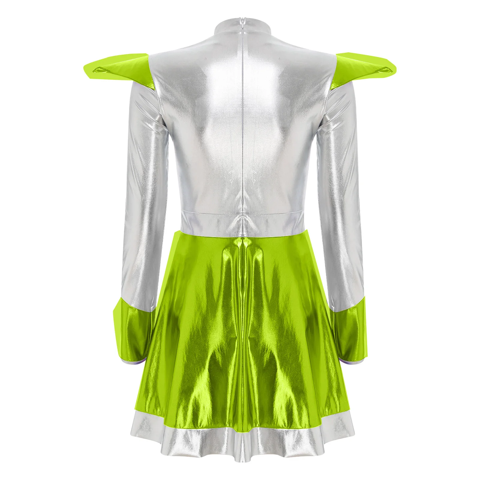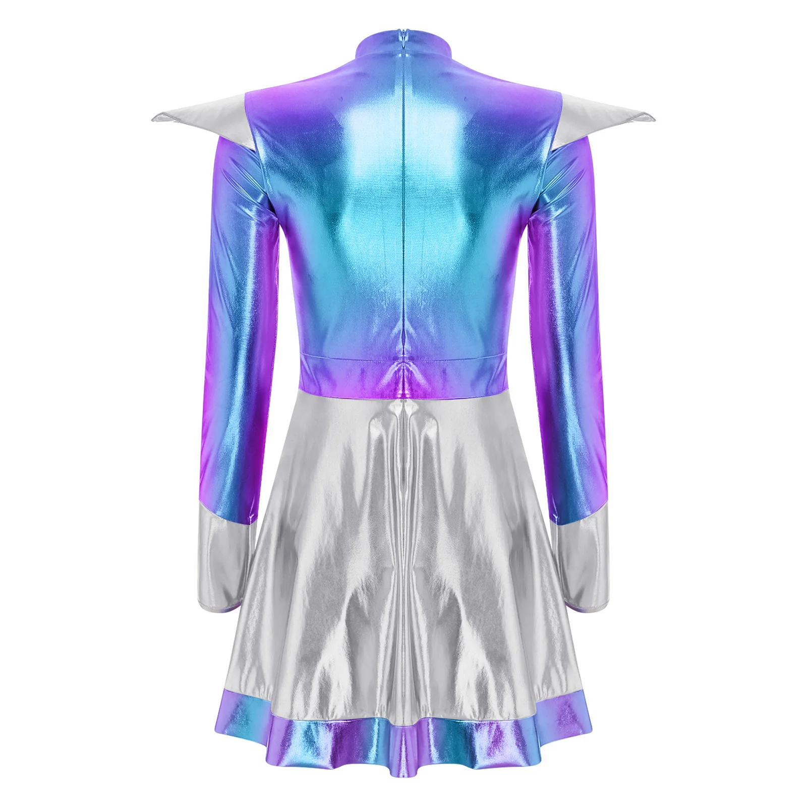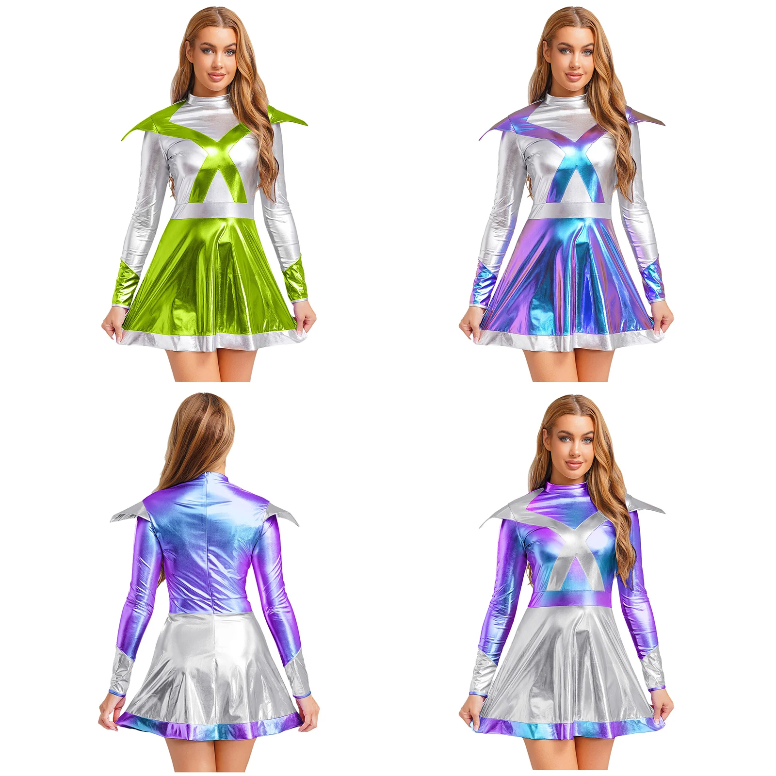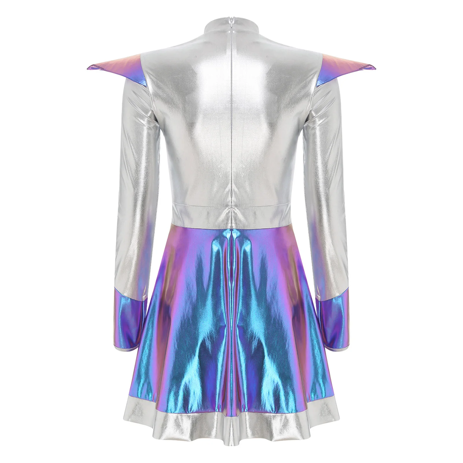 Women Shiny Alien Outerspace Astronaut Halloween Cosplay Costume Warrior Dress Long Sleeves Tutu Dance Dress for Carnival Party