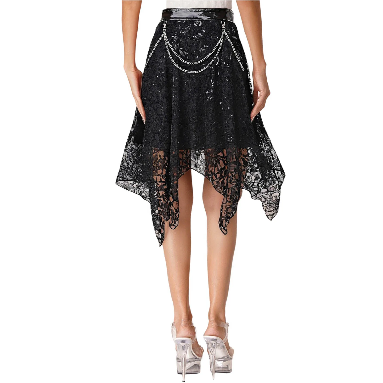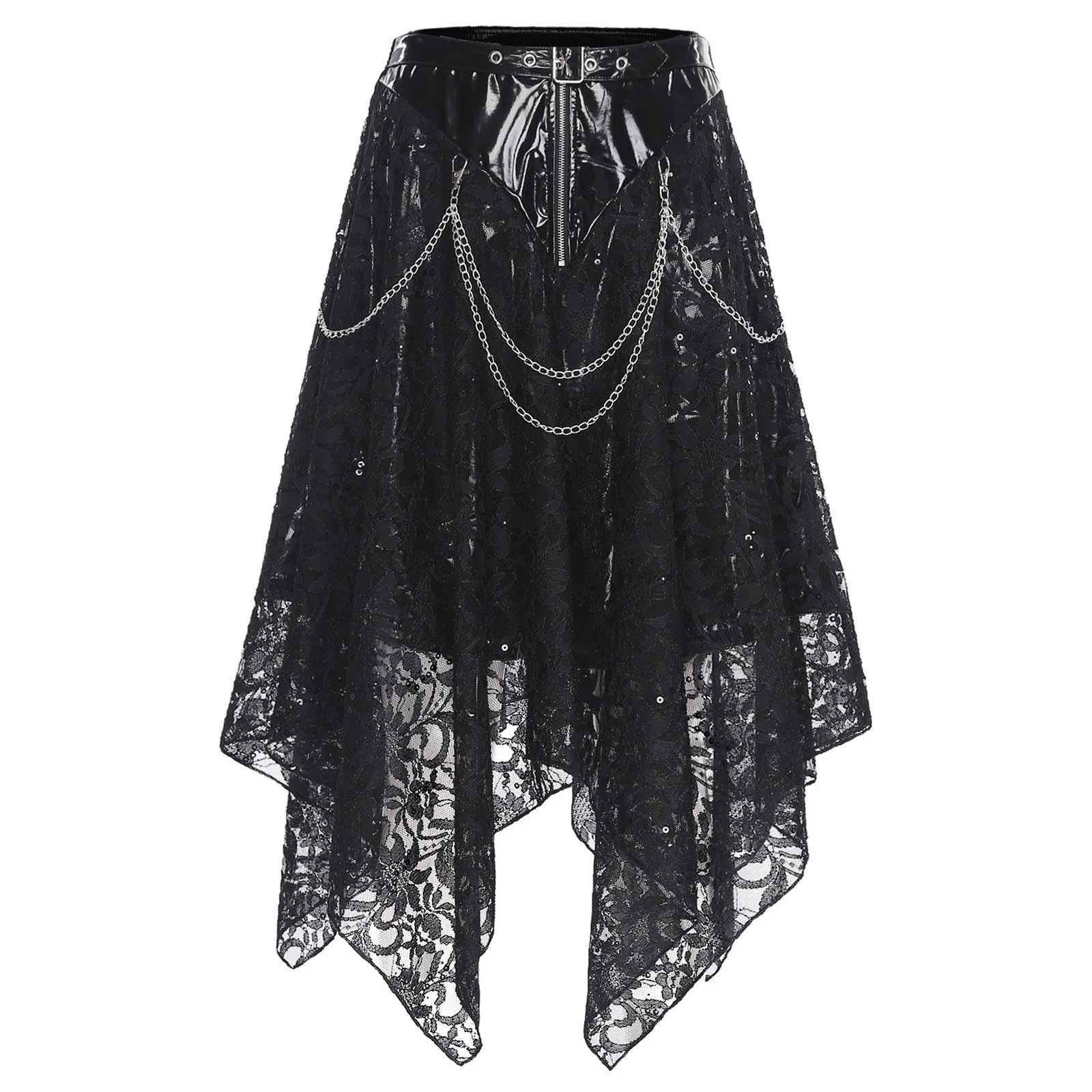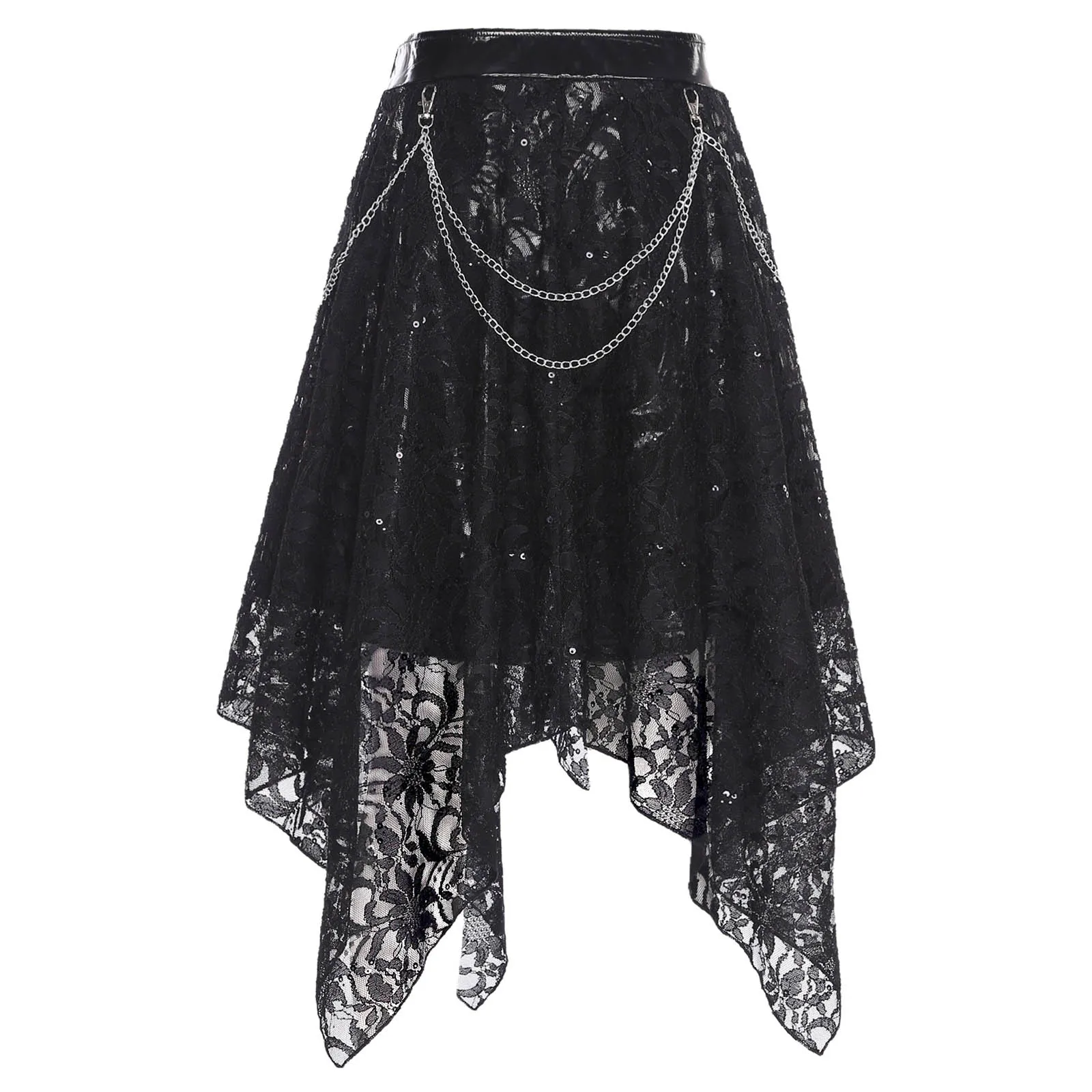 Women Steampunk Gothic Zipper Skirt with Built-In Shorts Sequins Waist Chains Floral Lace Rloral Skirt Halloween Cosplay Costume