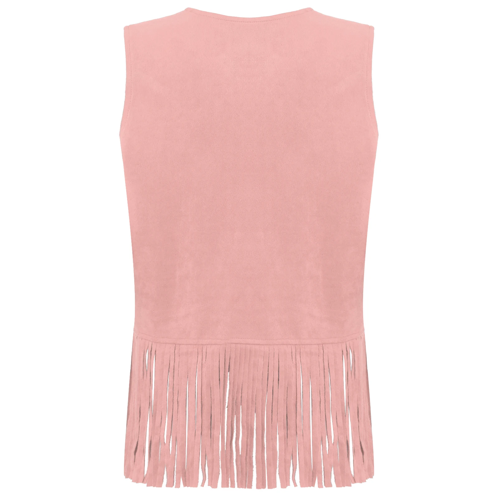 Women Western Cowgirl Vintage Fringe Vest Open Front Waistcoat Faux Suede Sleeveless Tassel Jacket For Halloween Theme Party