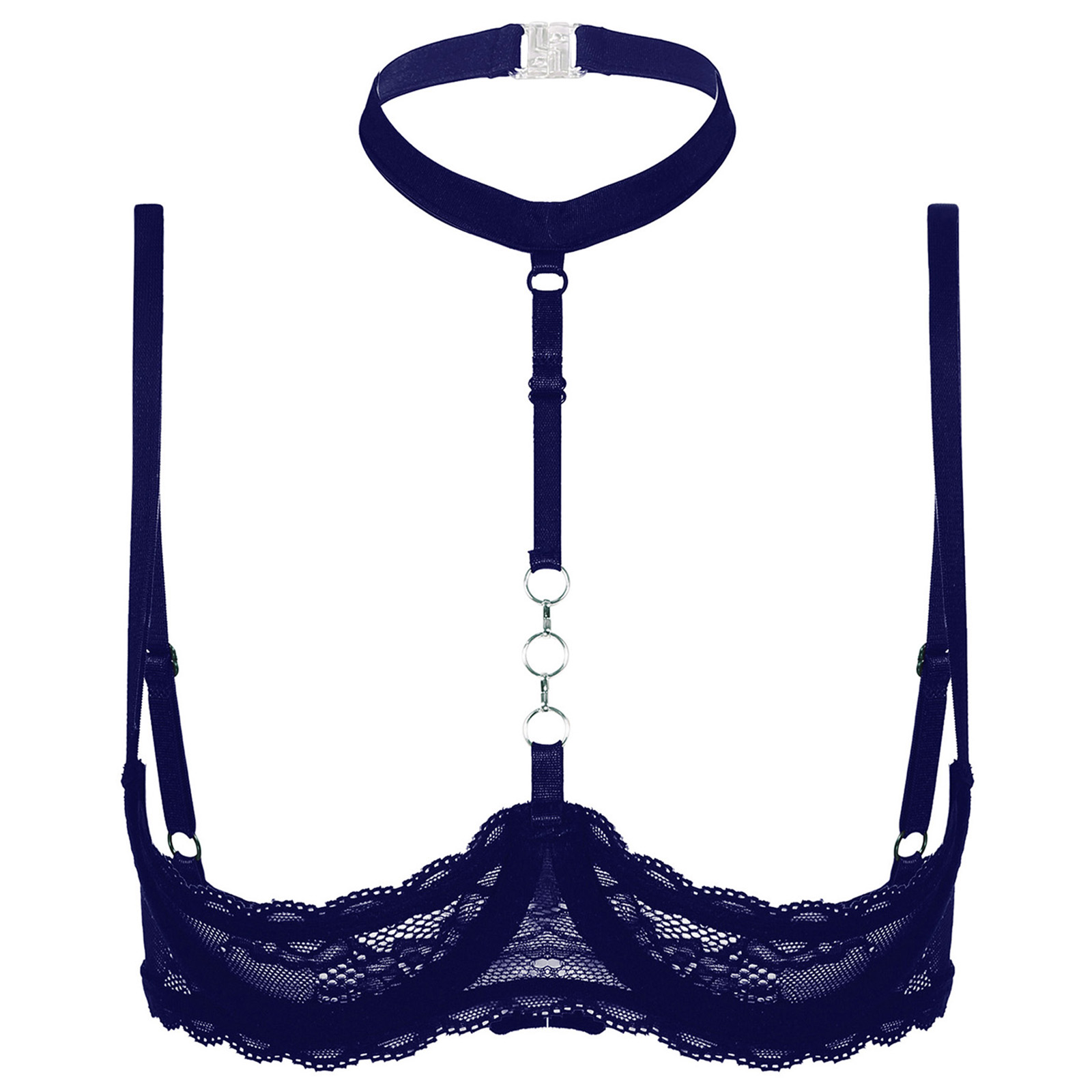 Womens 1/4 Cups Underwire Bra Halter Neck O Ring Sheer Lace Push Up Open Breast Cup Exposed Nipple Brassiere Lingerie Underwear