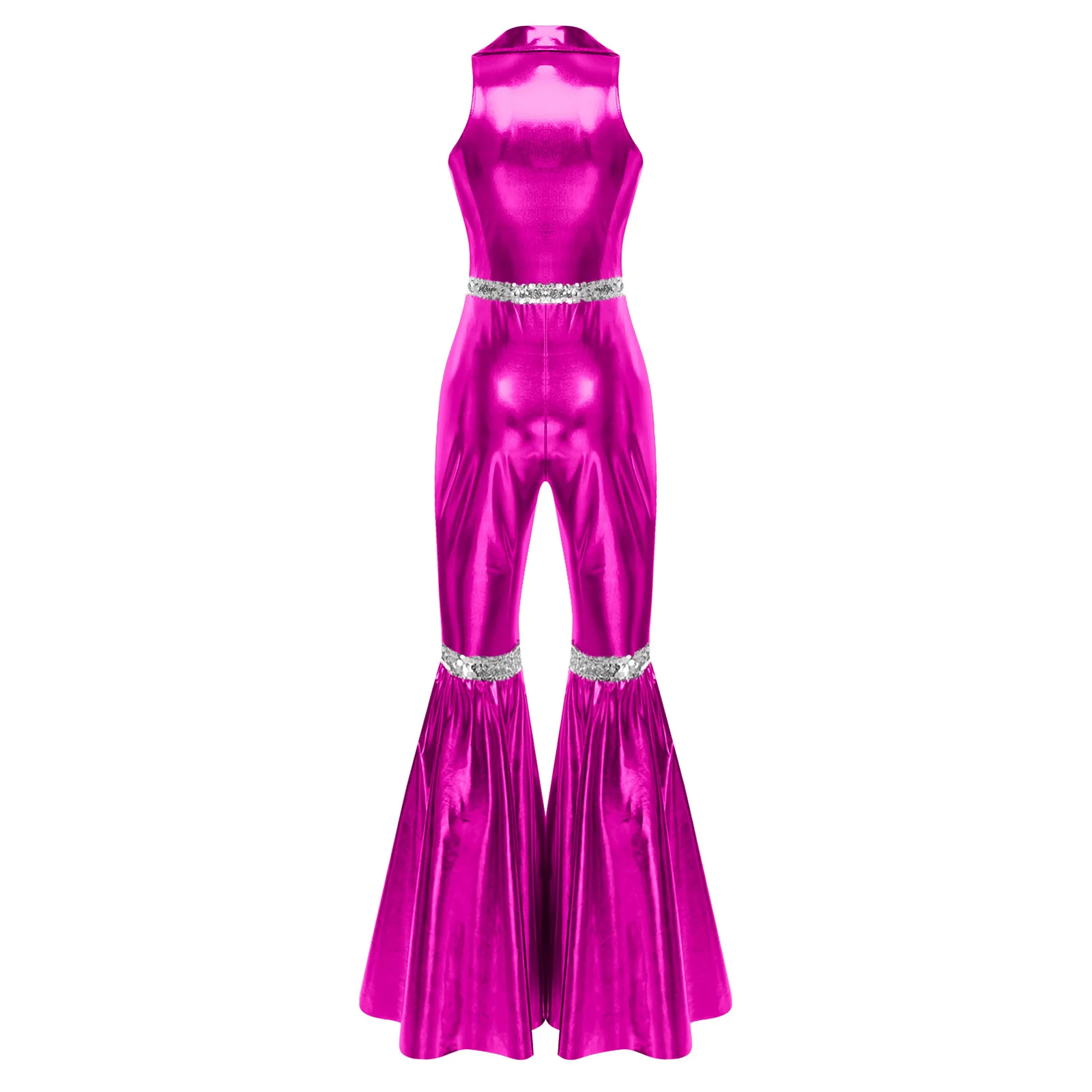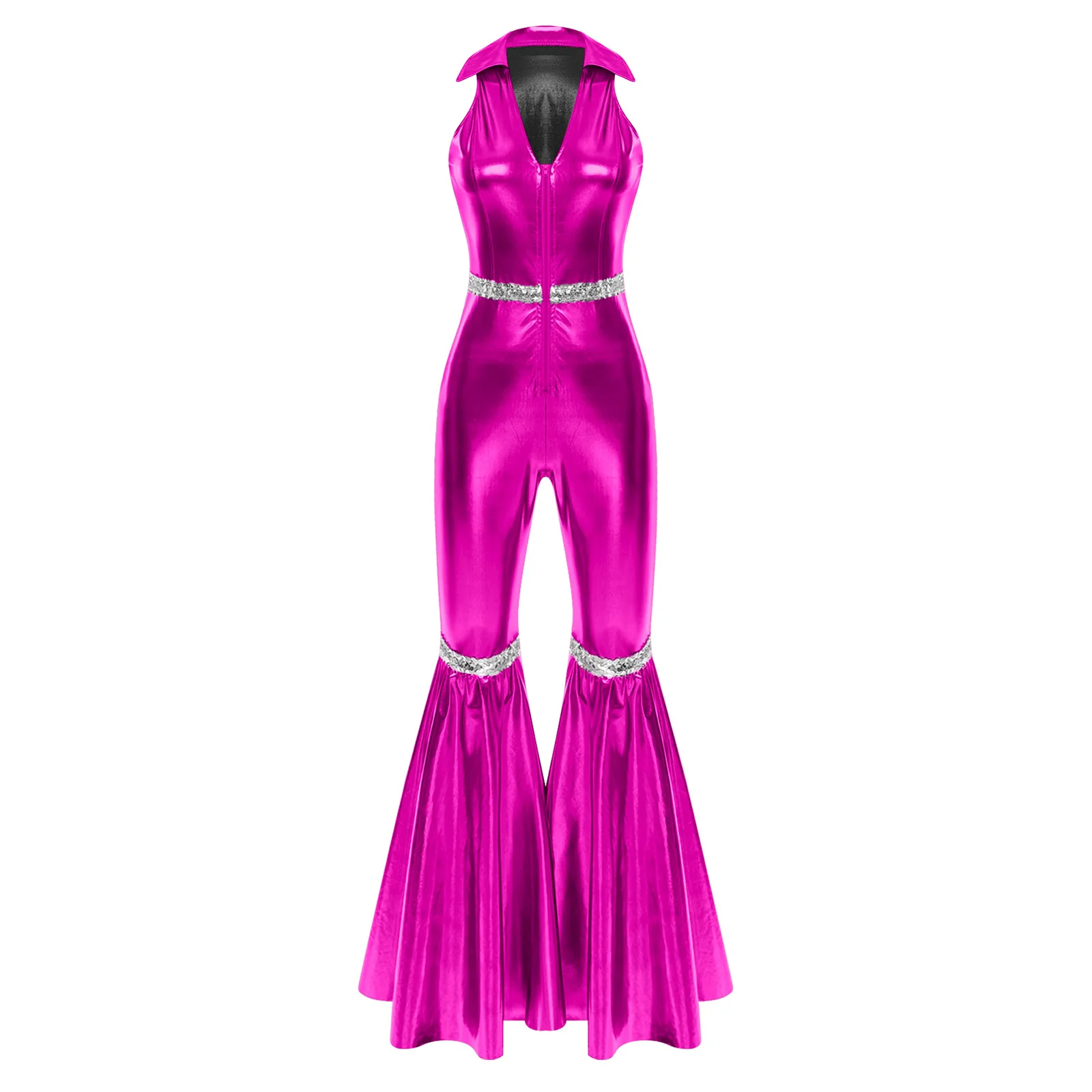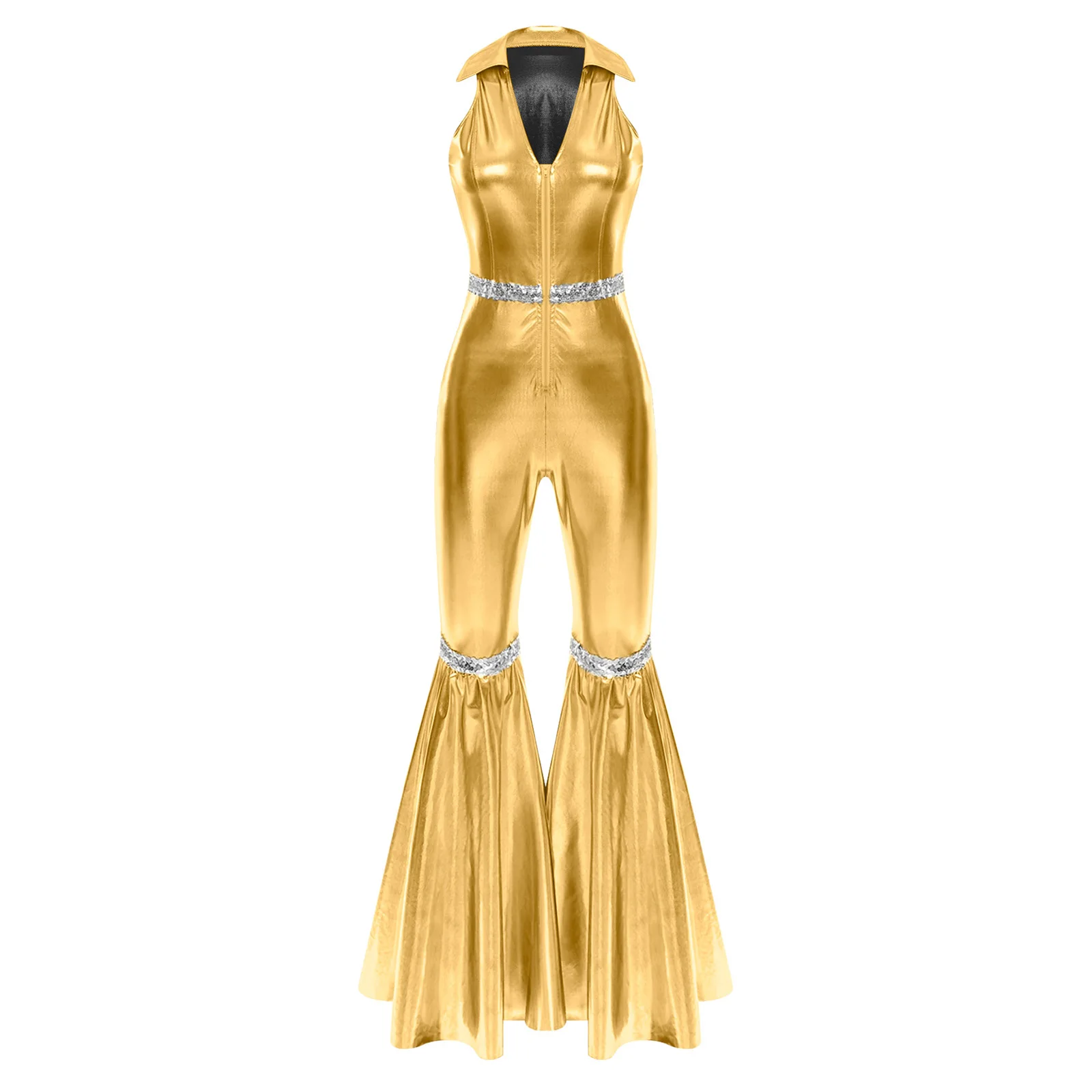 Womens 70s Disco Hippie Rompers Retro Jazz Ballroom Dance Costume Vintage Front Zipper Sequins Bell Bottom Long Pants Jumpsuit