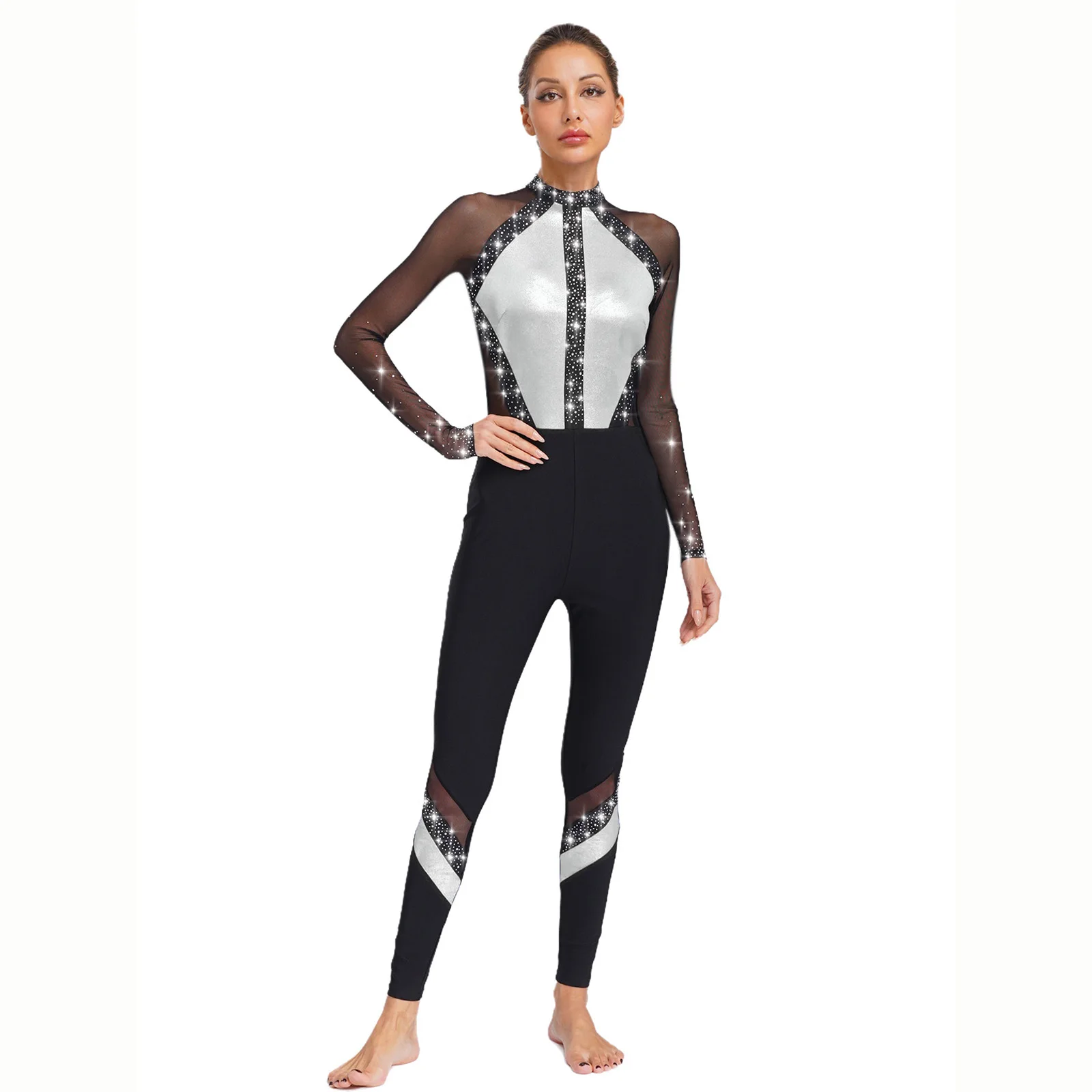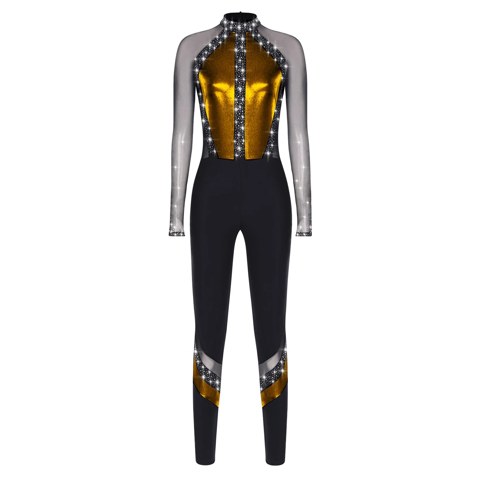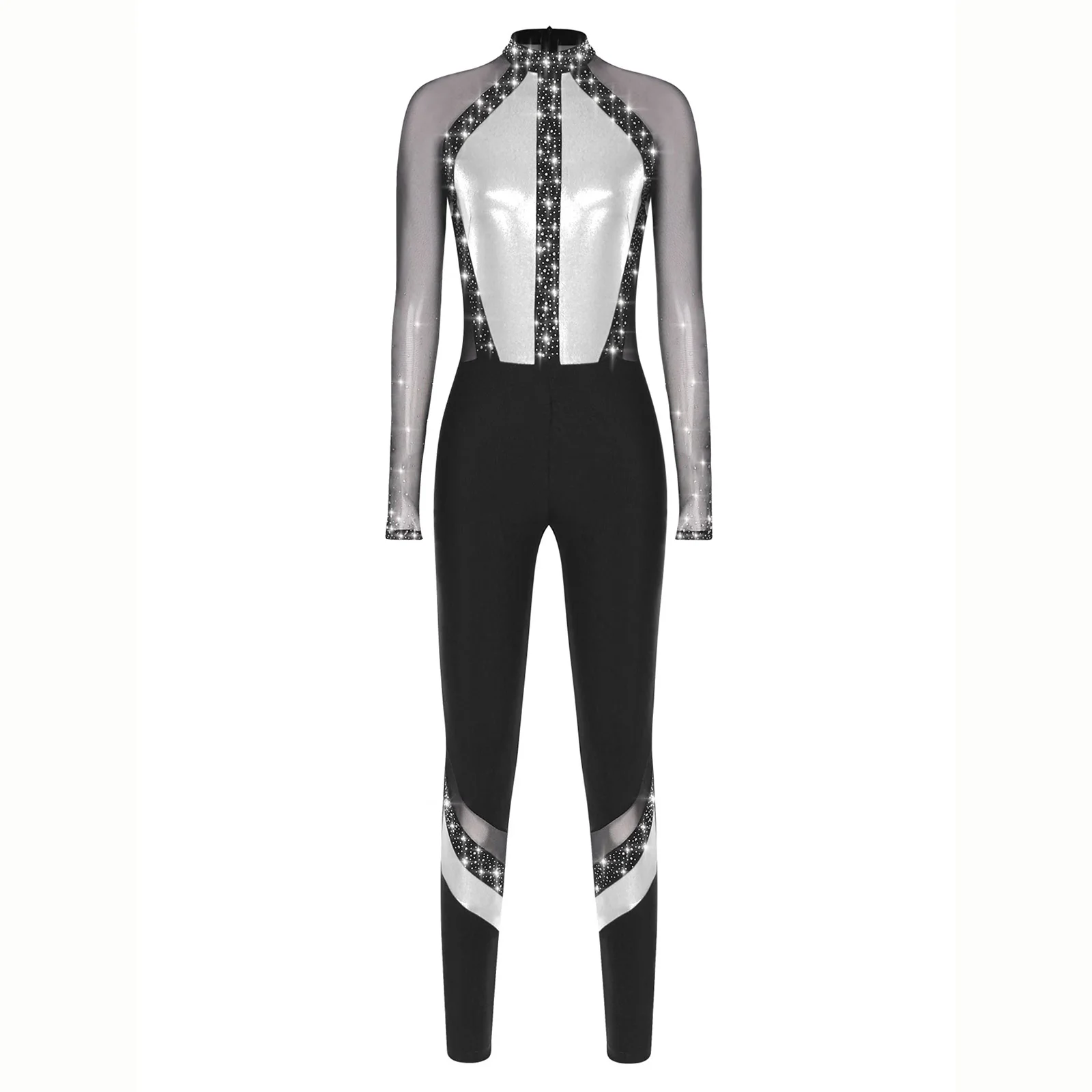 Metallic color block design and sheer mesh patchwork with rhinestones that sparkle under the light to brighten up any performance.