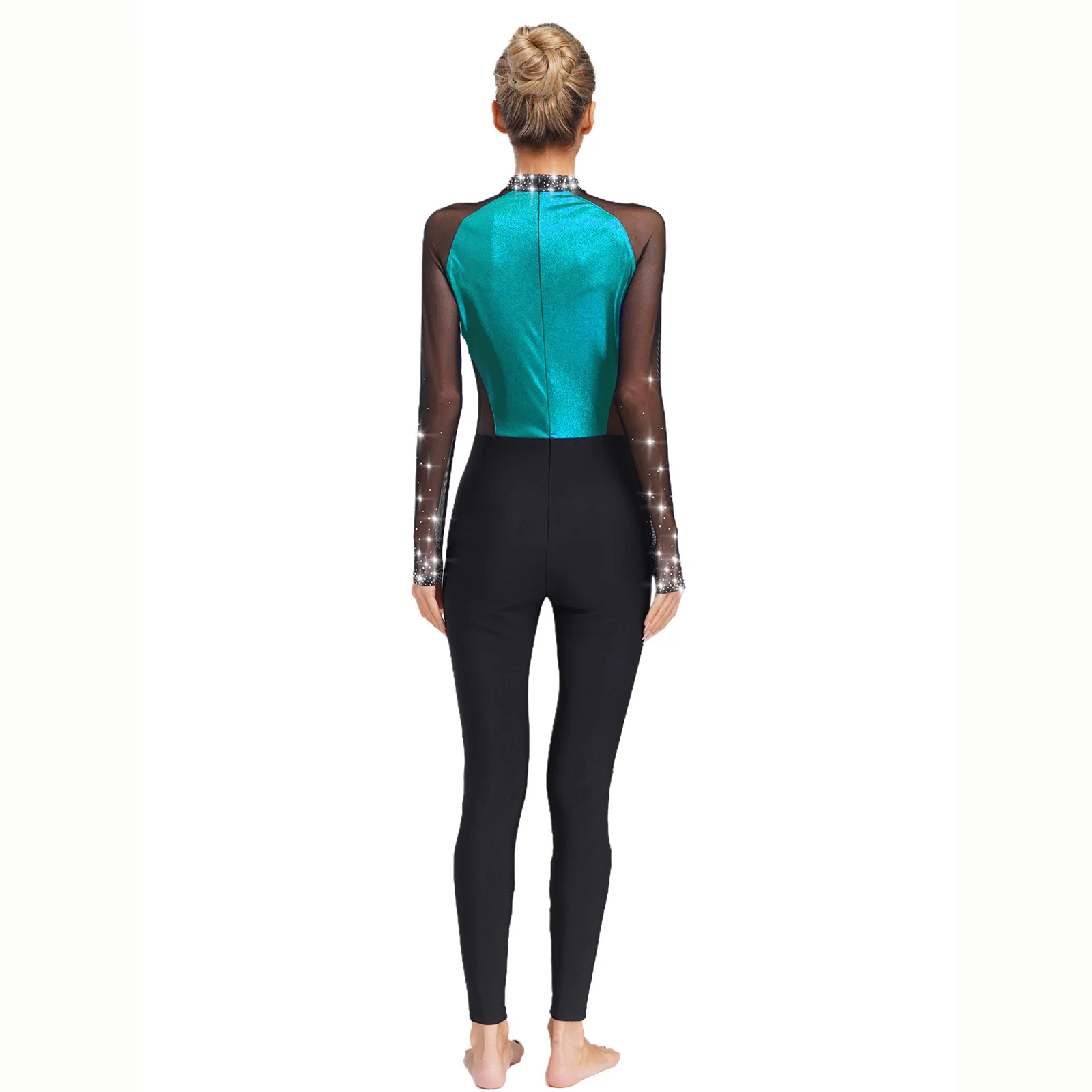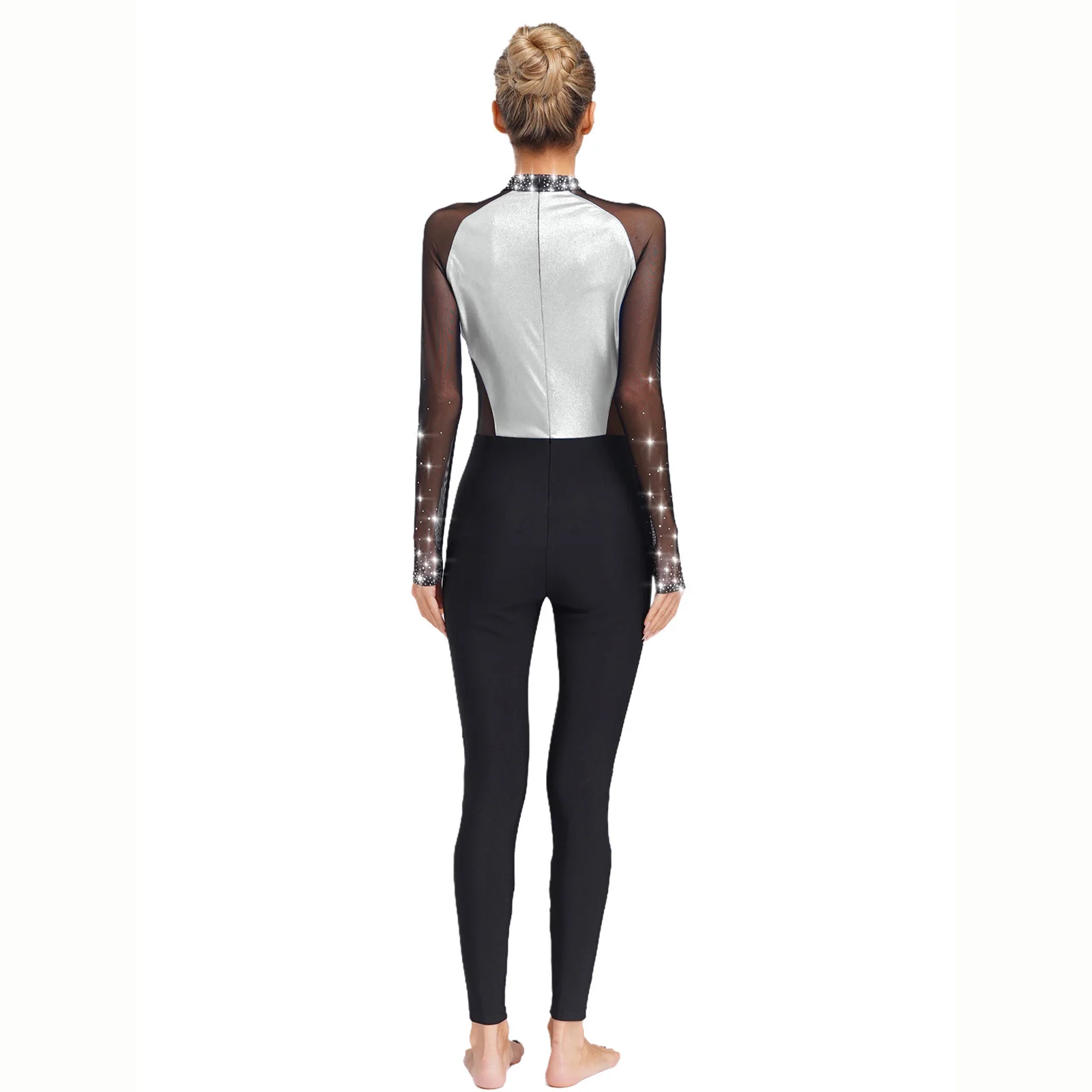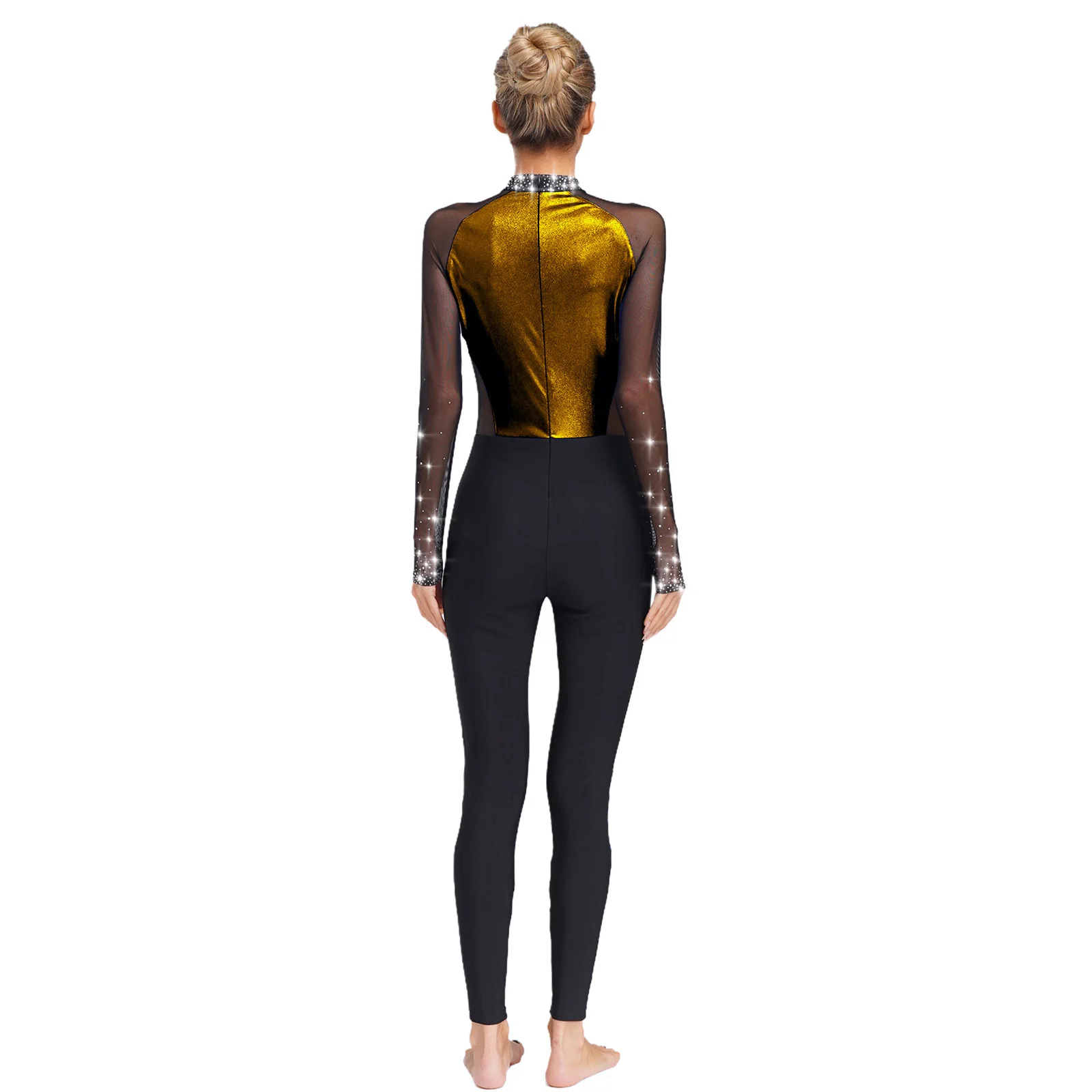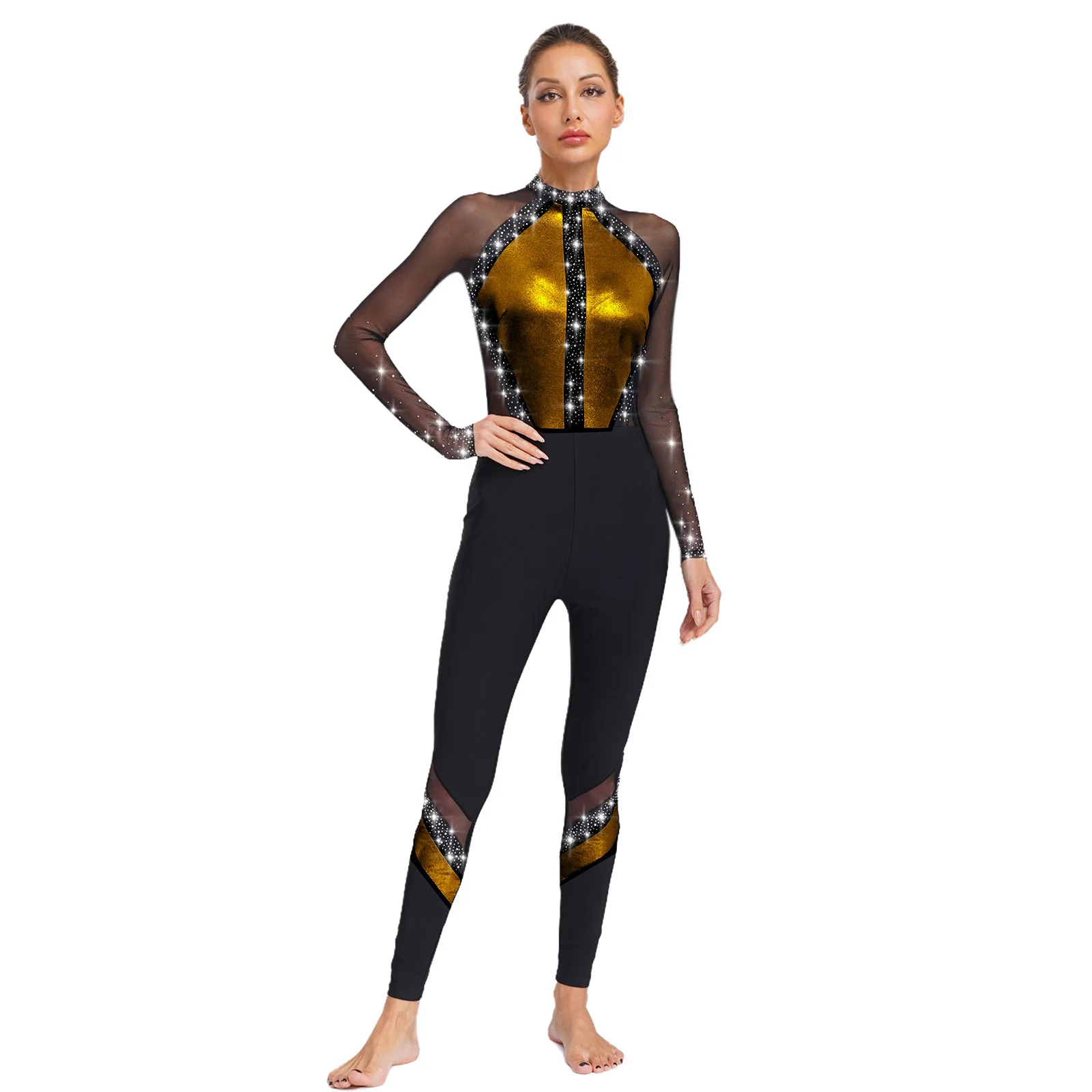 Metallic color block design and sheer mesh patchwork with rhinestones that sparkle under the light to brighten up any performance.