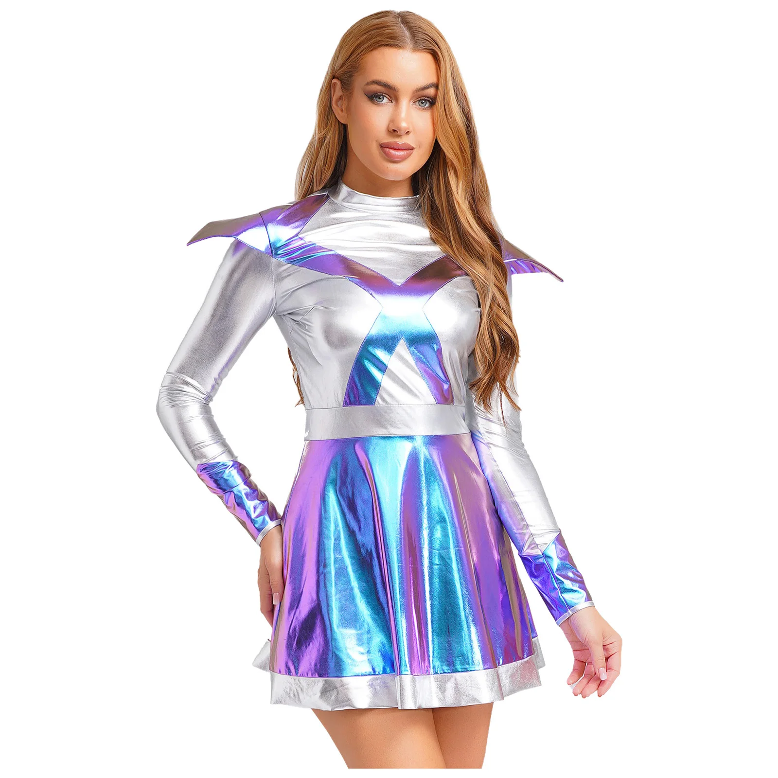 Womens Alien Outer Space Astronaut Robot Cosplay Costume Halloween Outfits Metallic Shiny A-line Cutie Fighter Robot Dress
