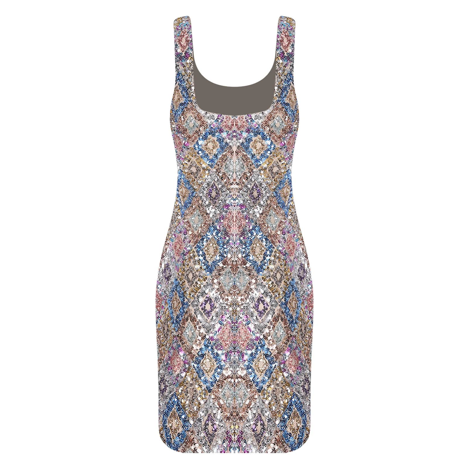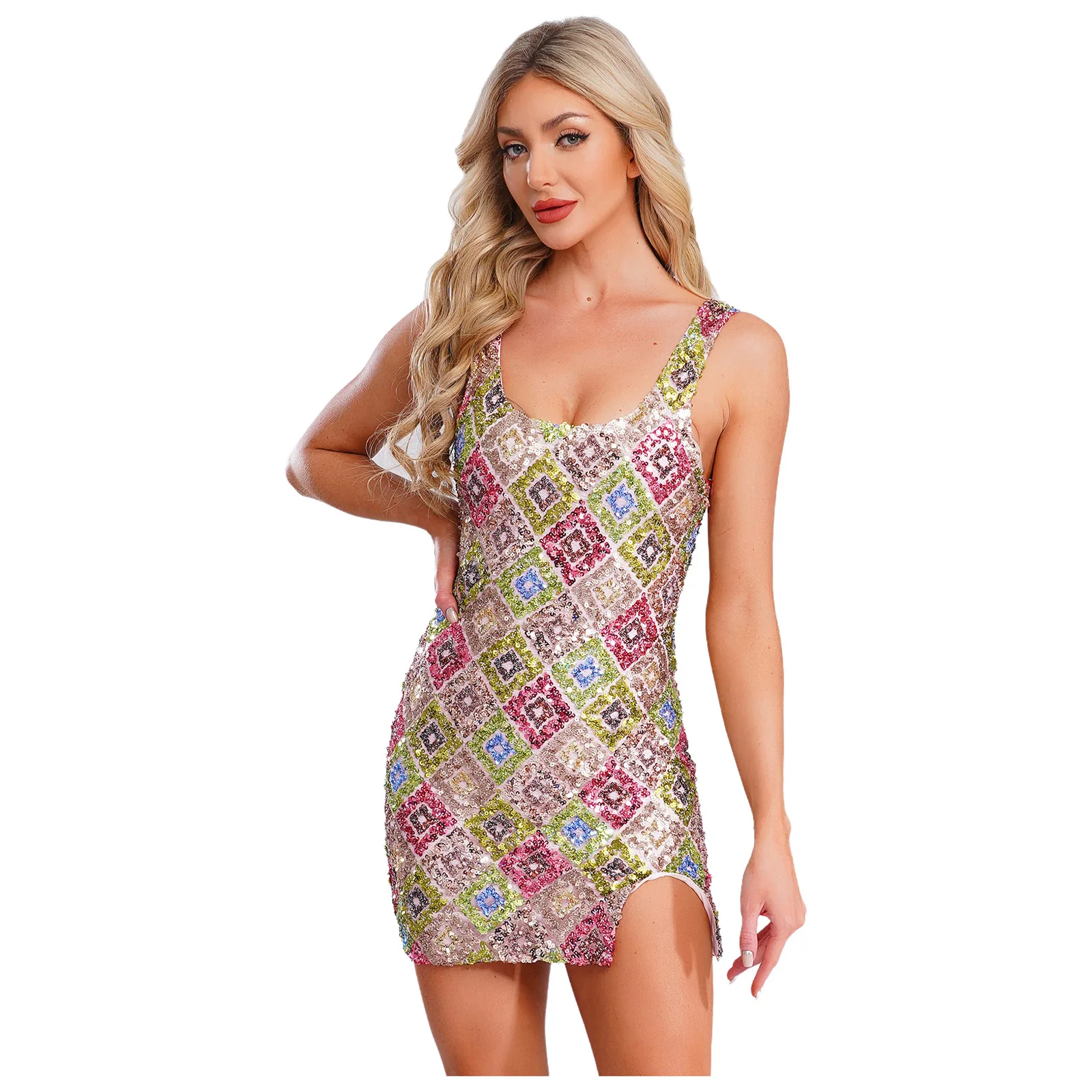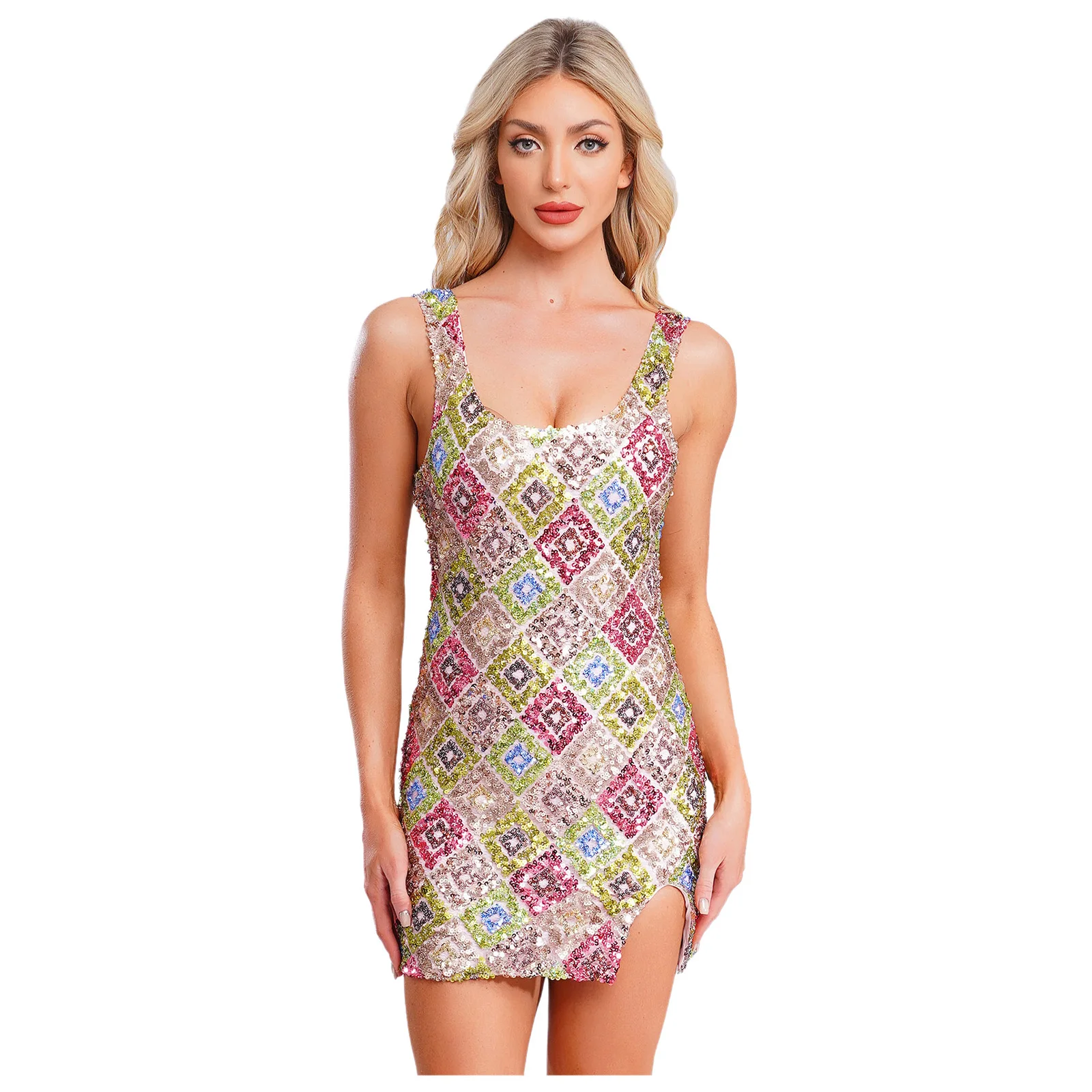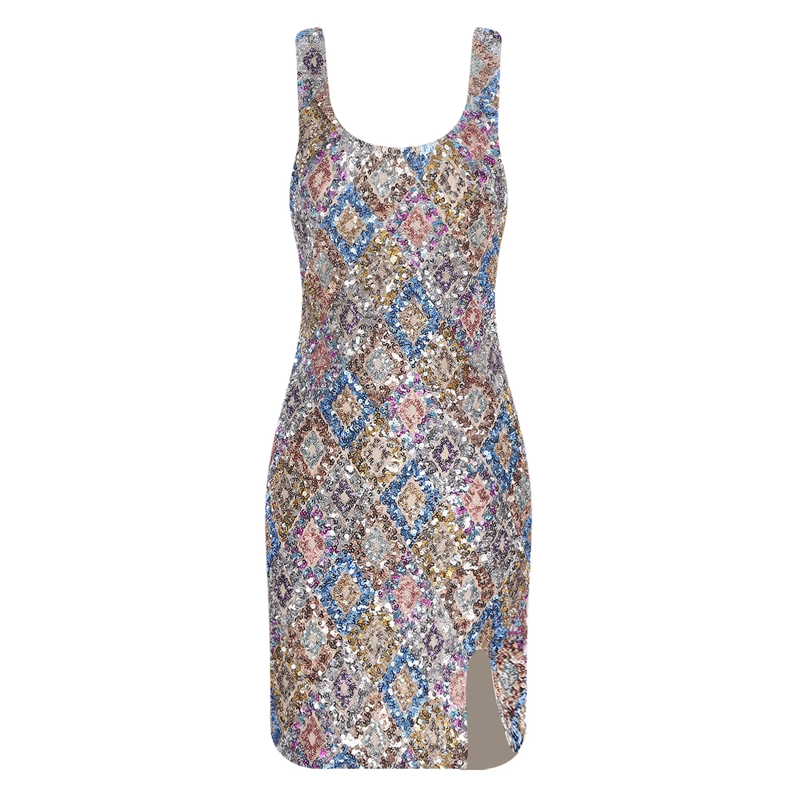 Womens Allover Sequin Bodycon Mini Dress Scoop Neck Slit Hem Fully Lining Glittery Argyle High Slit Short Dresses Party Vestidos