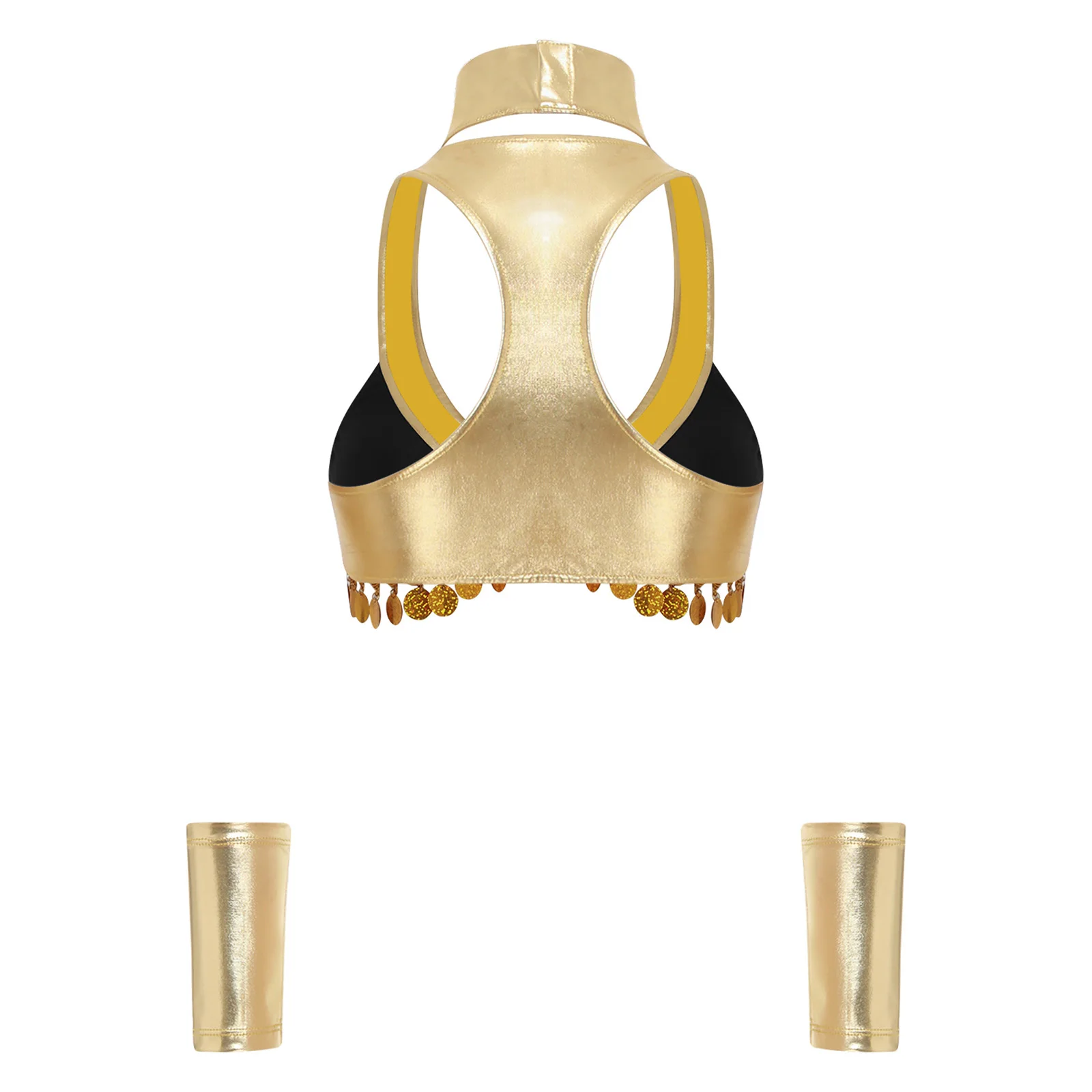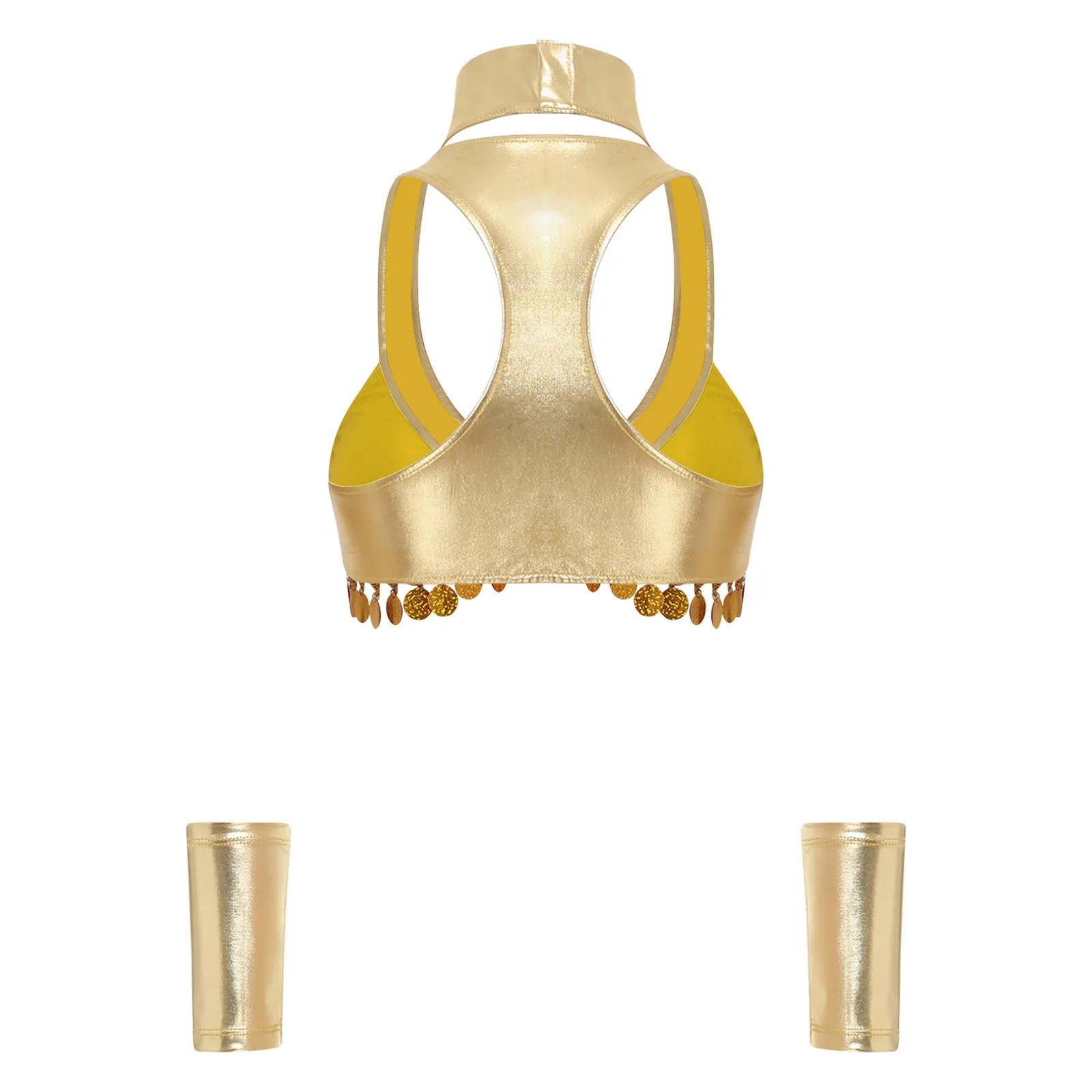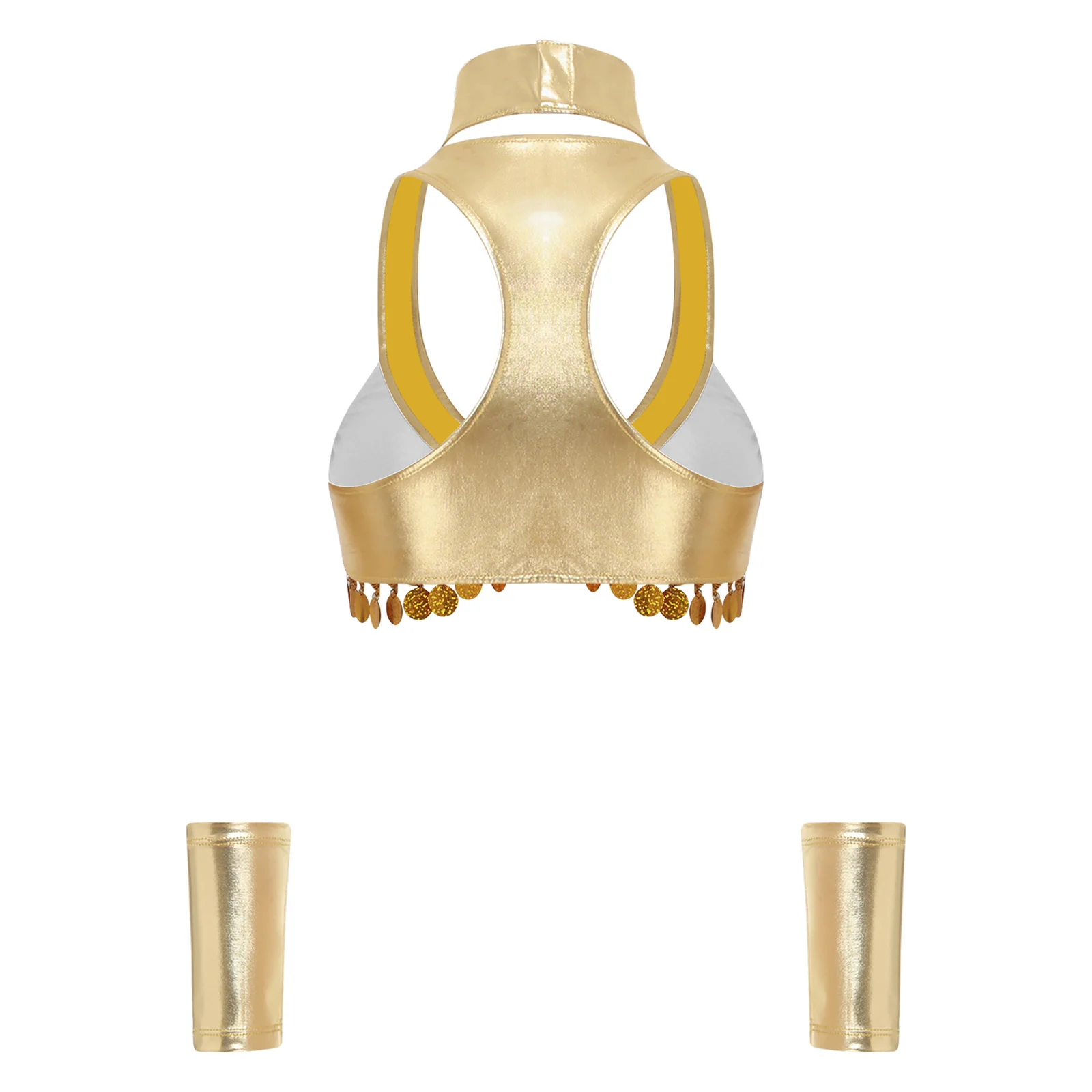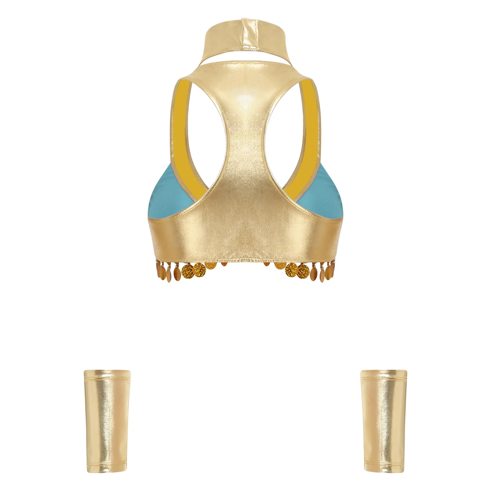 Womens Ancient Egyptian Queen Cosplay Crop Top Collar And Wristlets Metallic Shiny Tassel Fringe Bra Top Halloween Party Costume