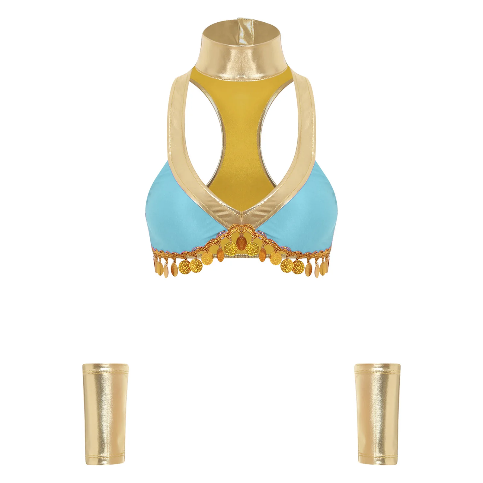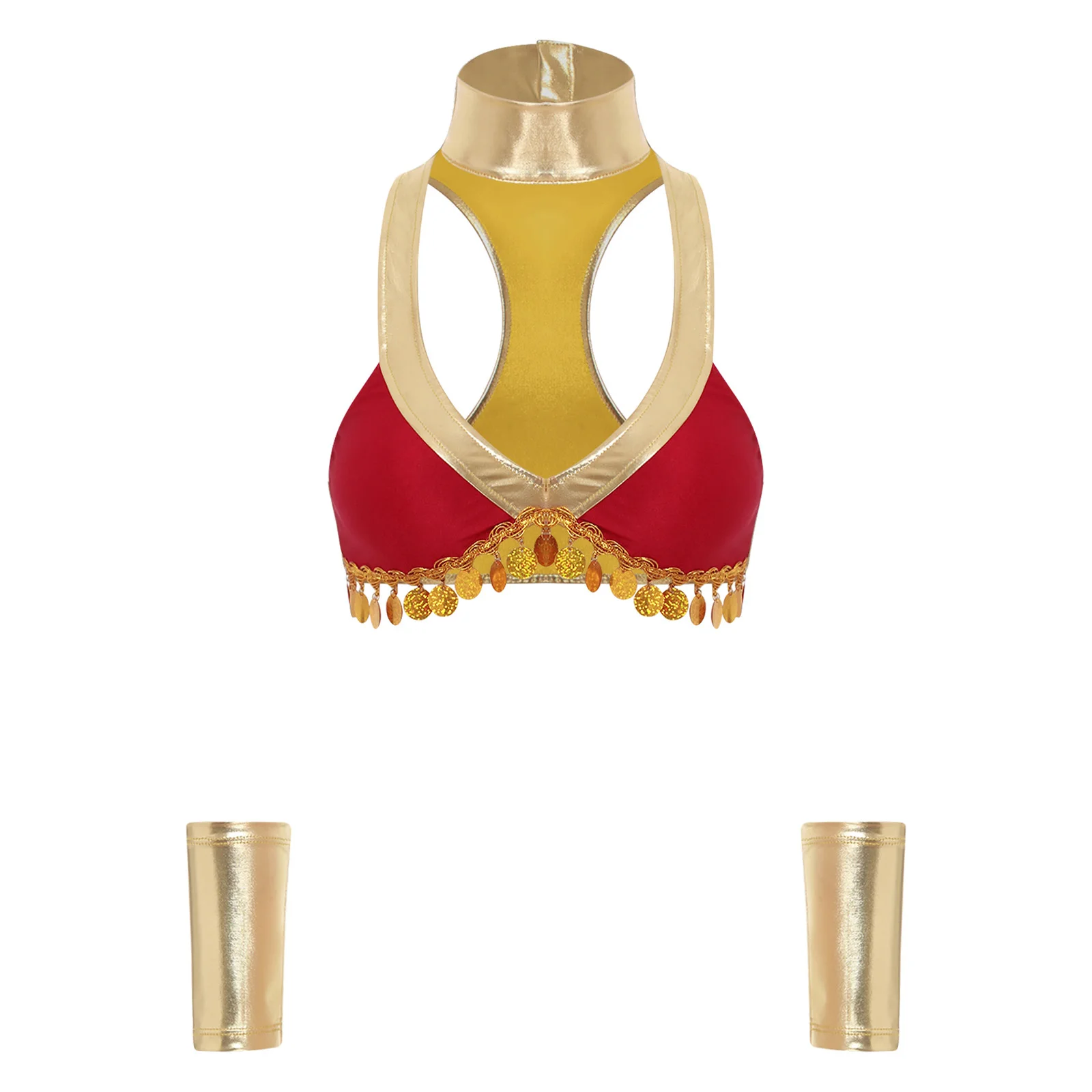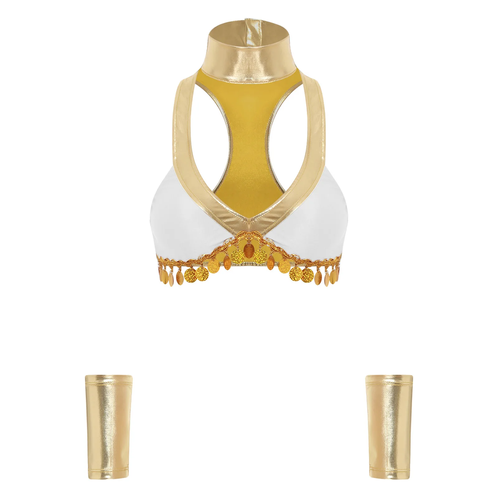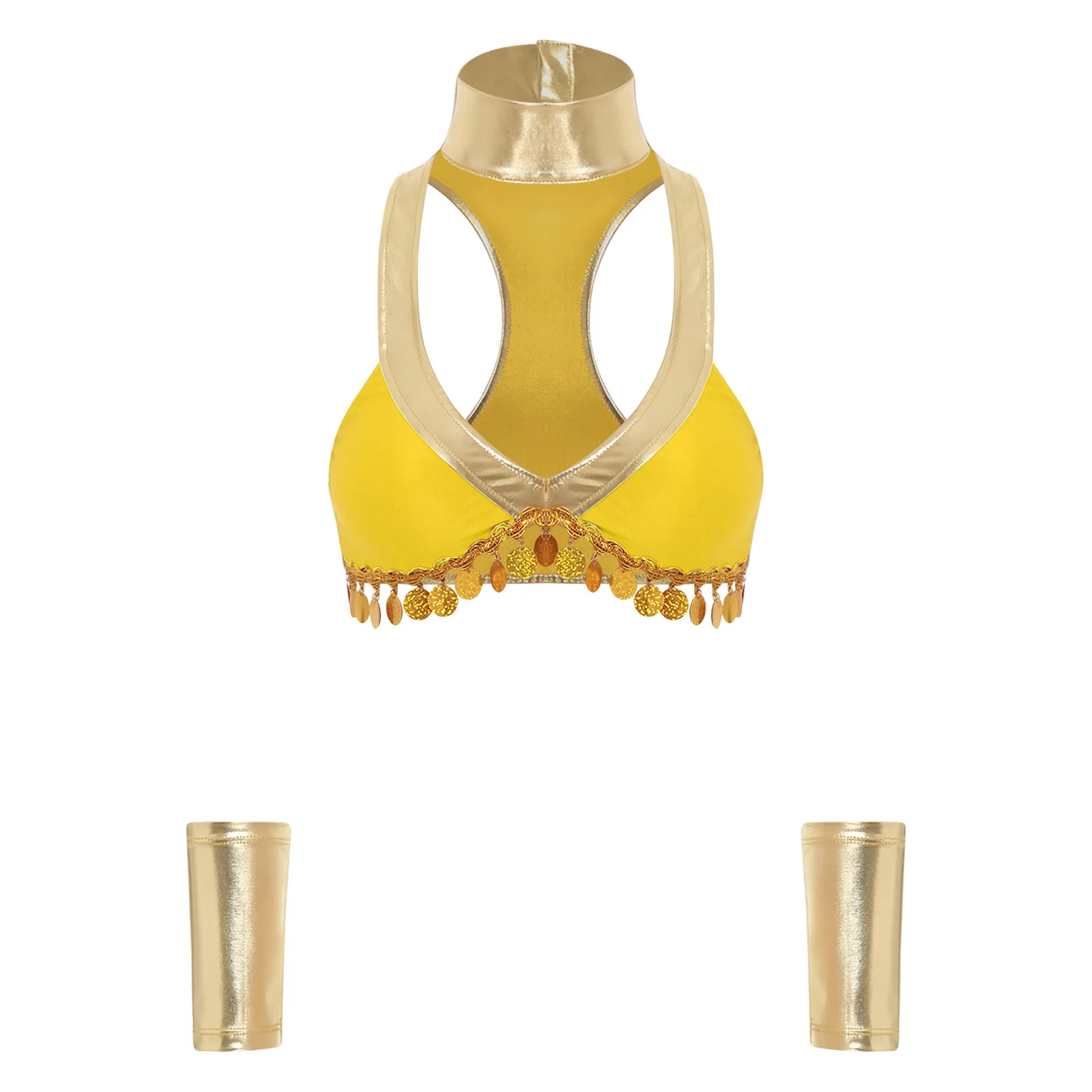 Womens Ancient Egyptian Queen Cosplay Crop Top Collar And Wristlets Metallic Shiny Tassel Fringe Bra Top Halloween Party Costume
