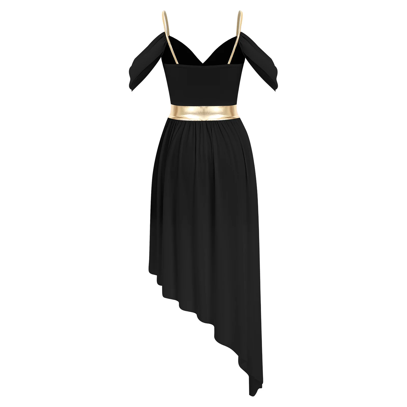 The asymmetrical hem brings a unique and dynamic look, adding a sense of movement and modernity to the dress.