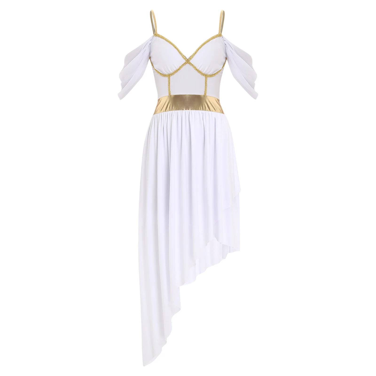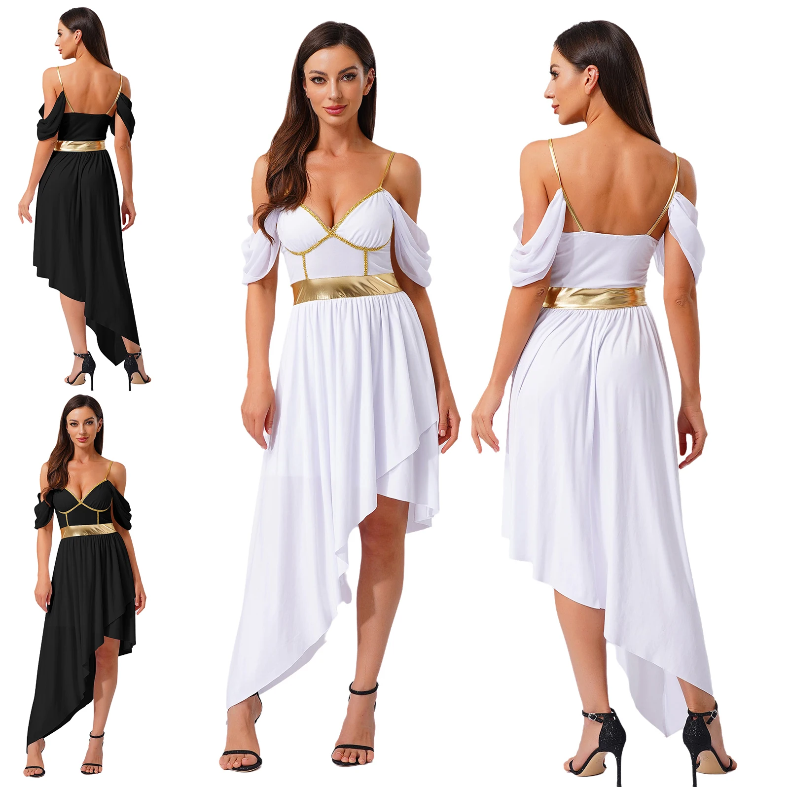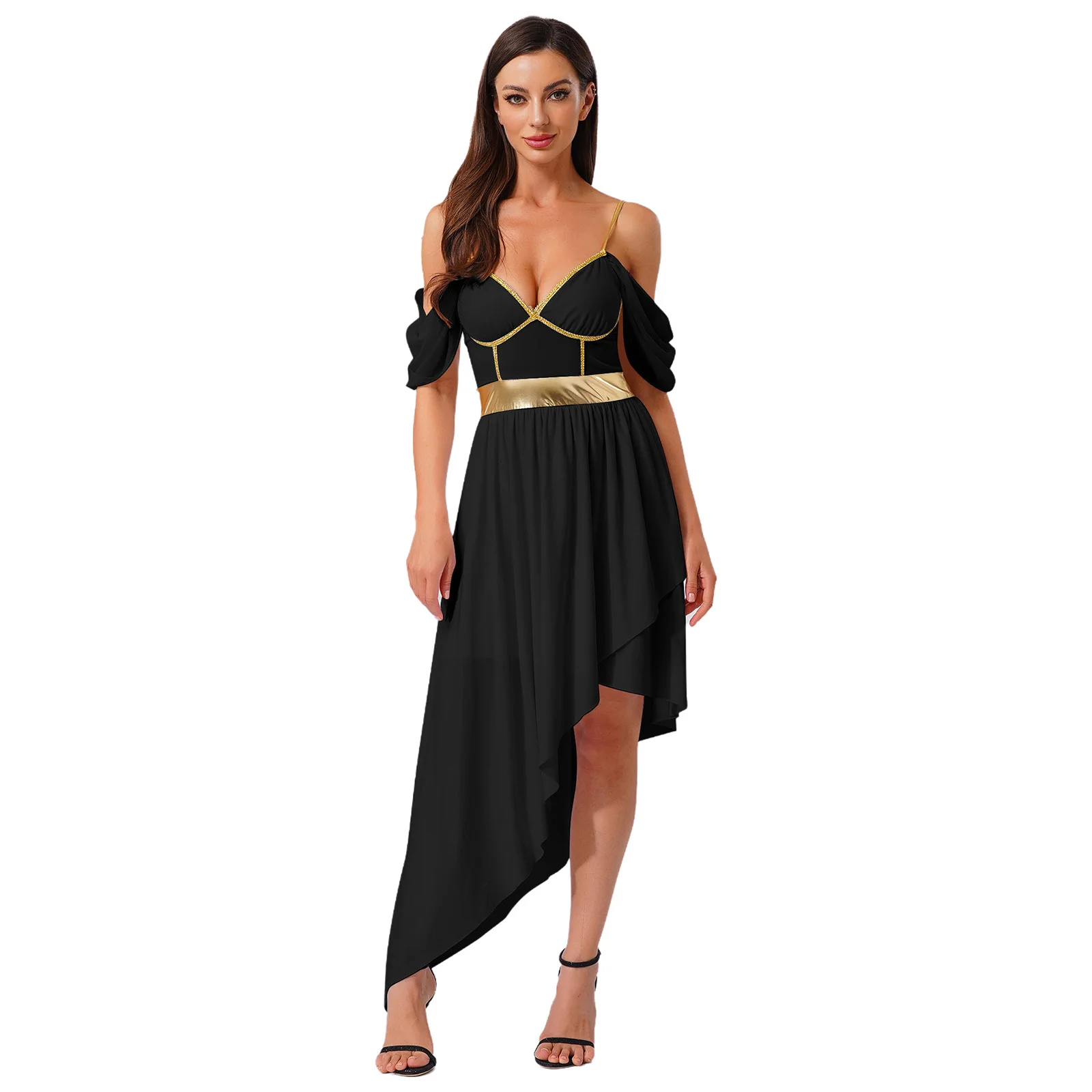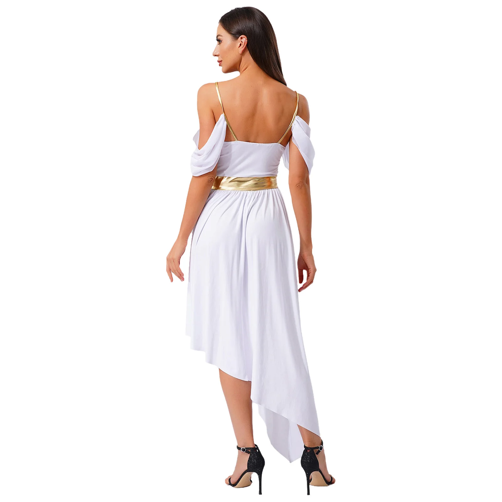Womens Ancient Greek Roman Deity Queen Cosplay Outfit Metallic Shiny Off Shoulder Sling Arabic Roman Dress Halloween Costume