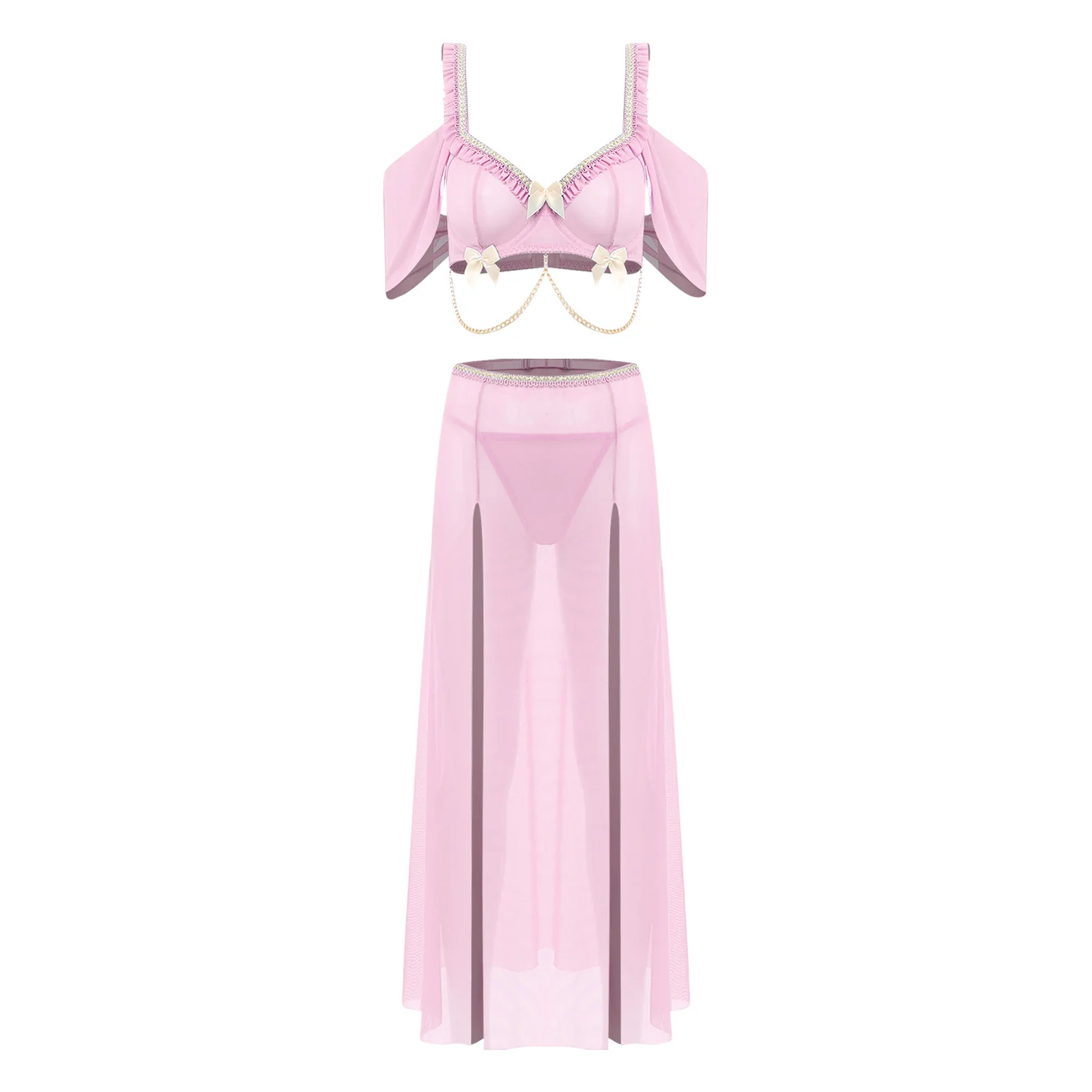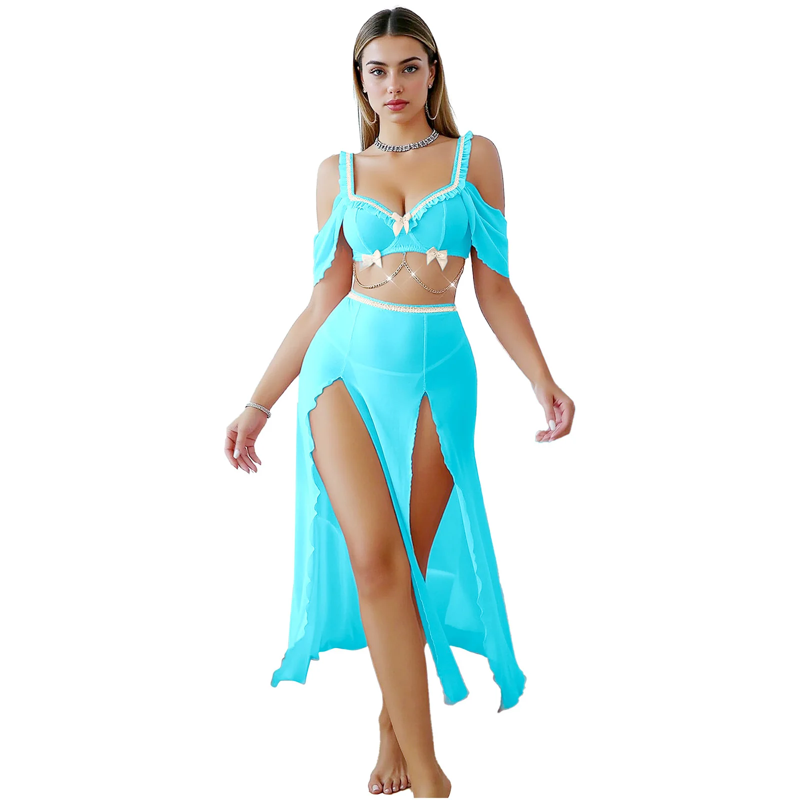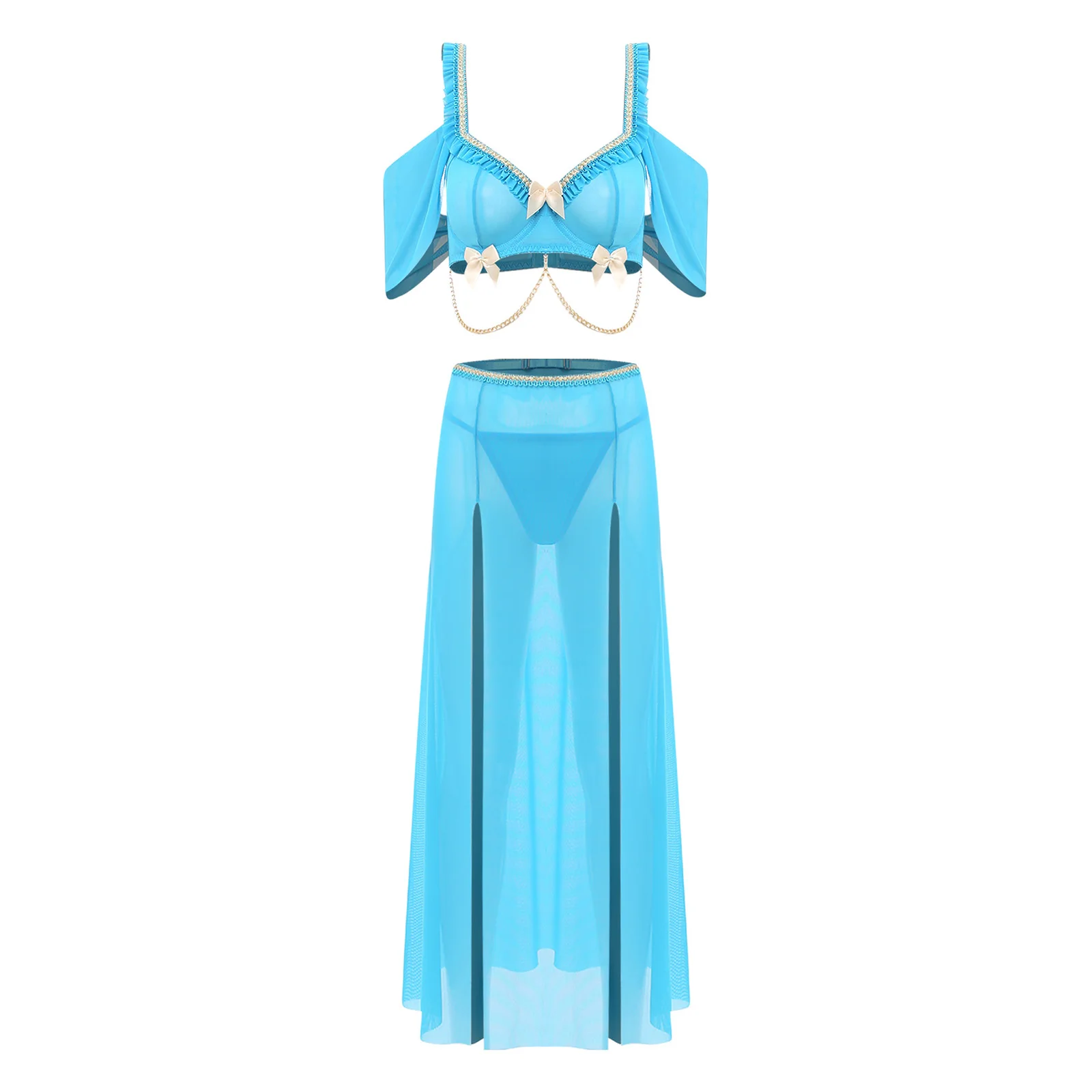 Womens Arab Princess Belly Dance Cosplay Costume Bow Underwire Bra Crop Top Waist Chain High Slit Mesh Skirt And T-back Thong