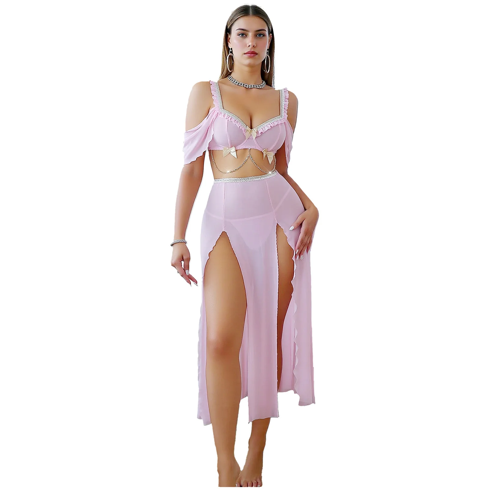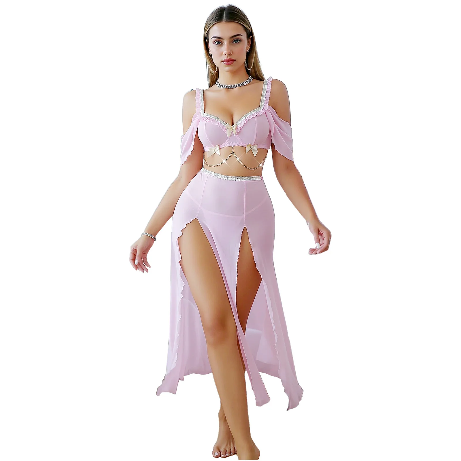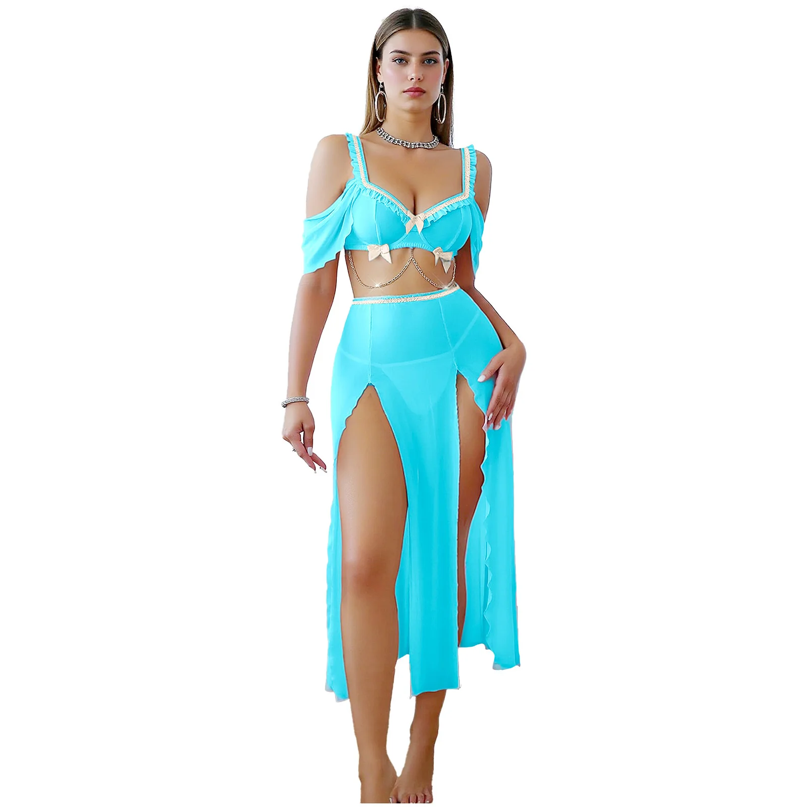 Womens Arab Princess Belly Dance Cosplay Costume Bow Underwire Bra Crop Top Waist Chain High Slit Mesh Skirt And T-back Thong