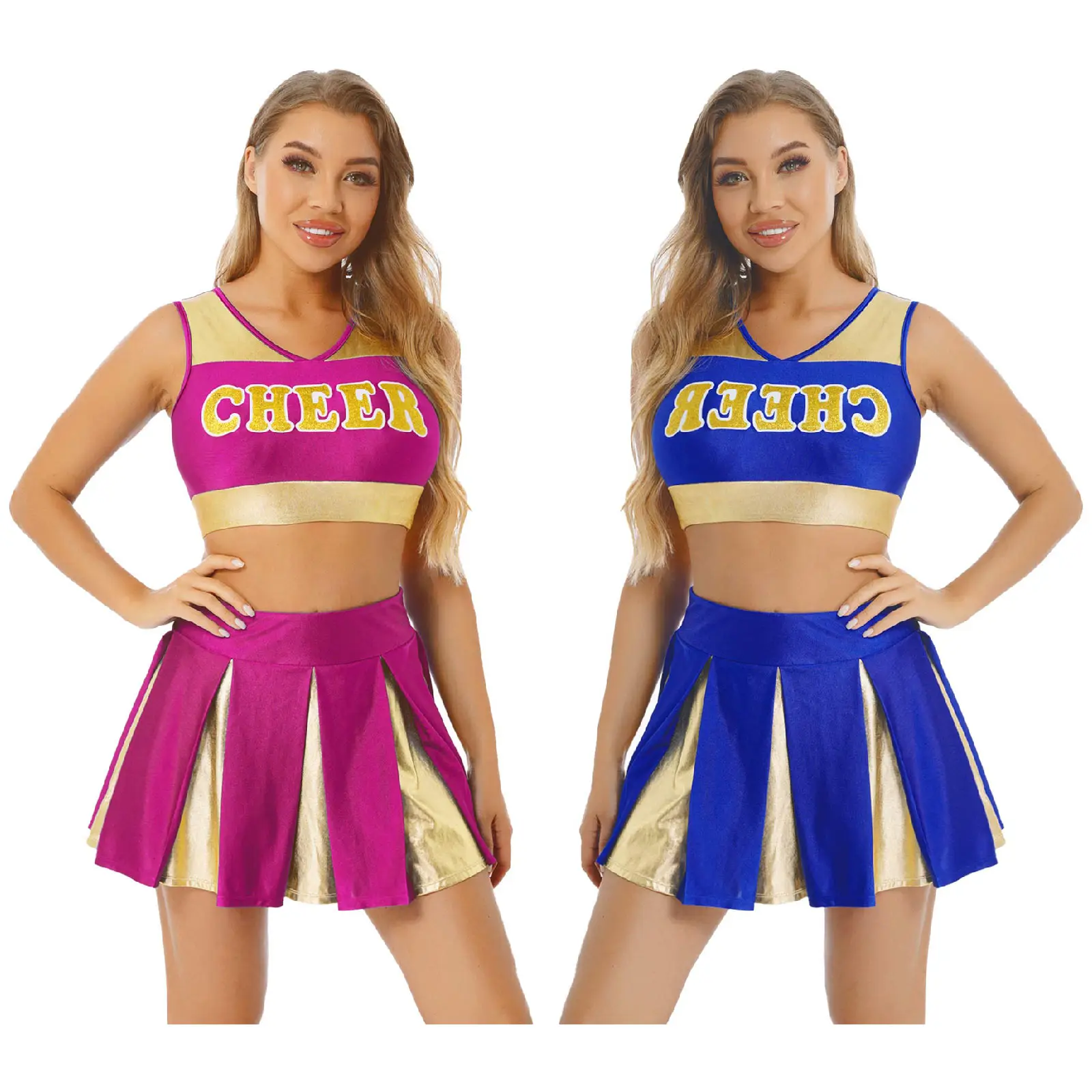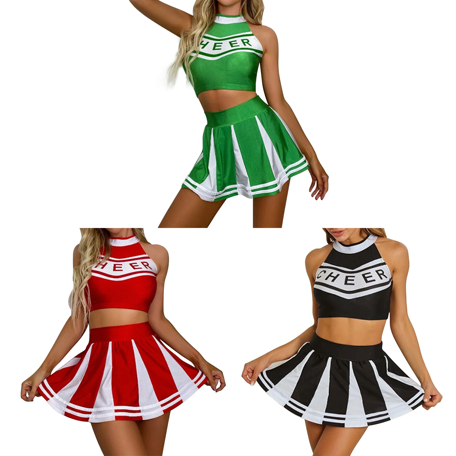 Womens Cheerleader Costume Uniform Lingerie Cheerleading School Girls Cosplay Clubwear Crop Top with Mini Pleated Mini Skirt