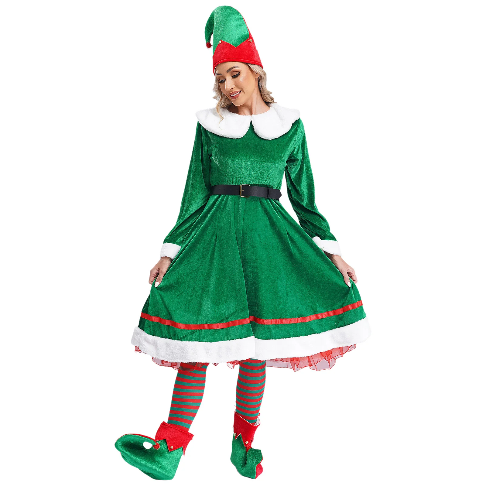 Womens Christmas Elf Costume Dress Elf Hat Elf Shoes Stockings Set anta Claus Cosplay Outfits New Year Helper Dress with Belt