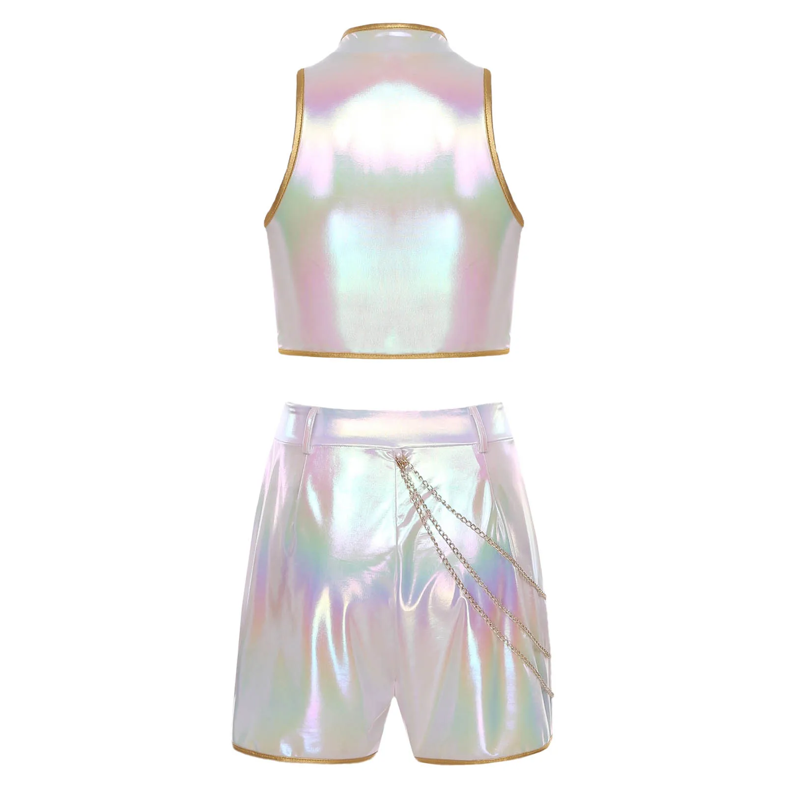 Womens Demon Hunters Cosplay Glossy Outfit Front Zipper Crop Top And Chain Shorts Cosplay Theme Parties Halloween Party Costume