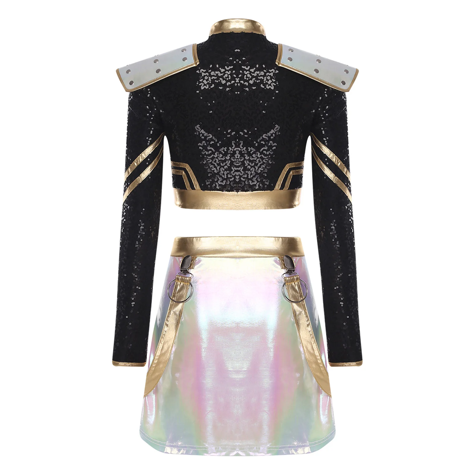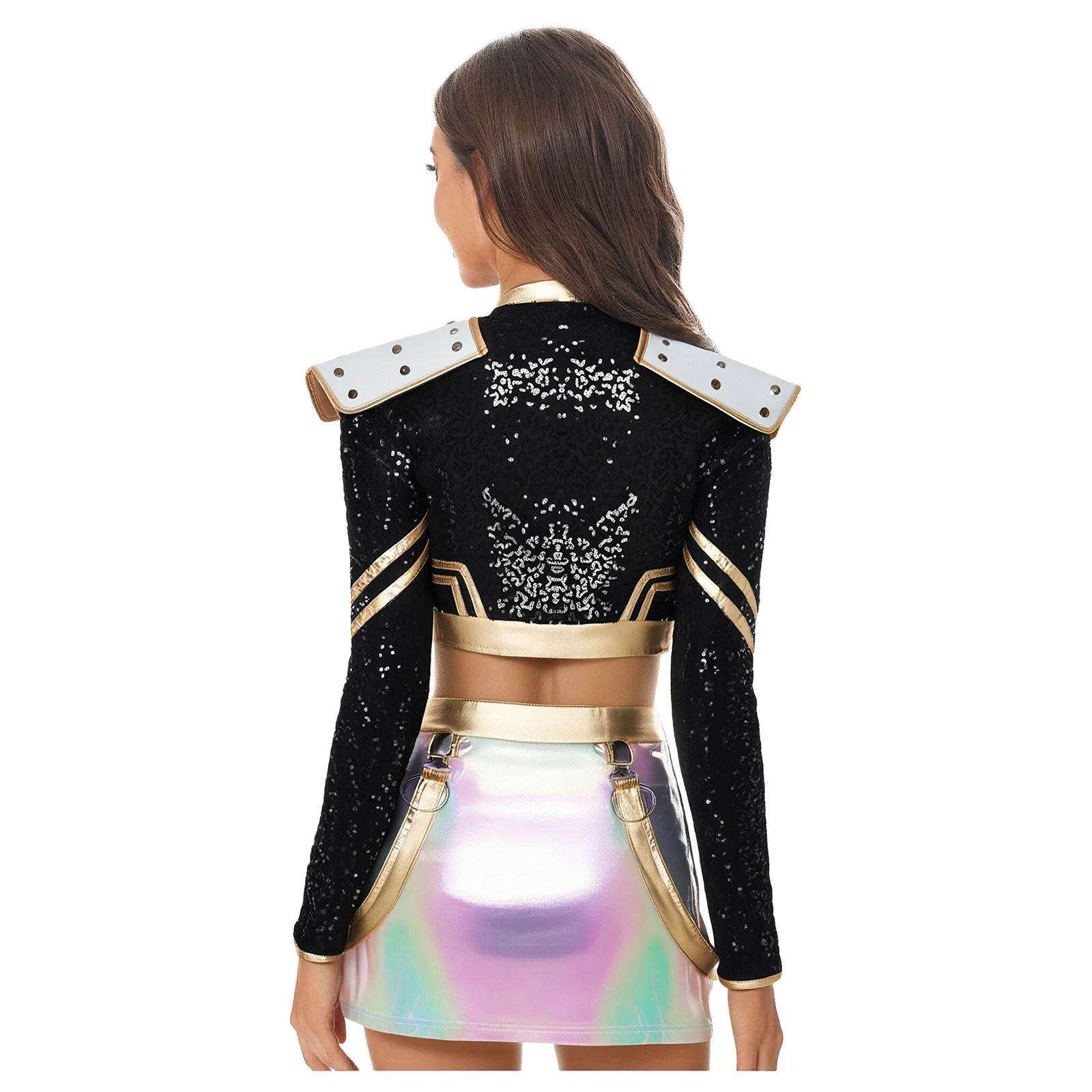 Womens Demon KPop Halloween Hunter Cosplay Outfit Rivet Sequined Crop Jacket Top Metallic Shiny Mini Skirt Rave Party Costumes