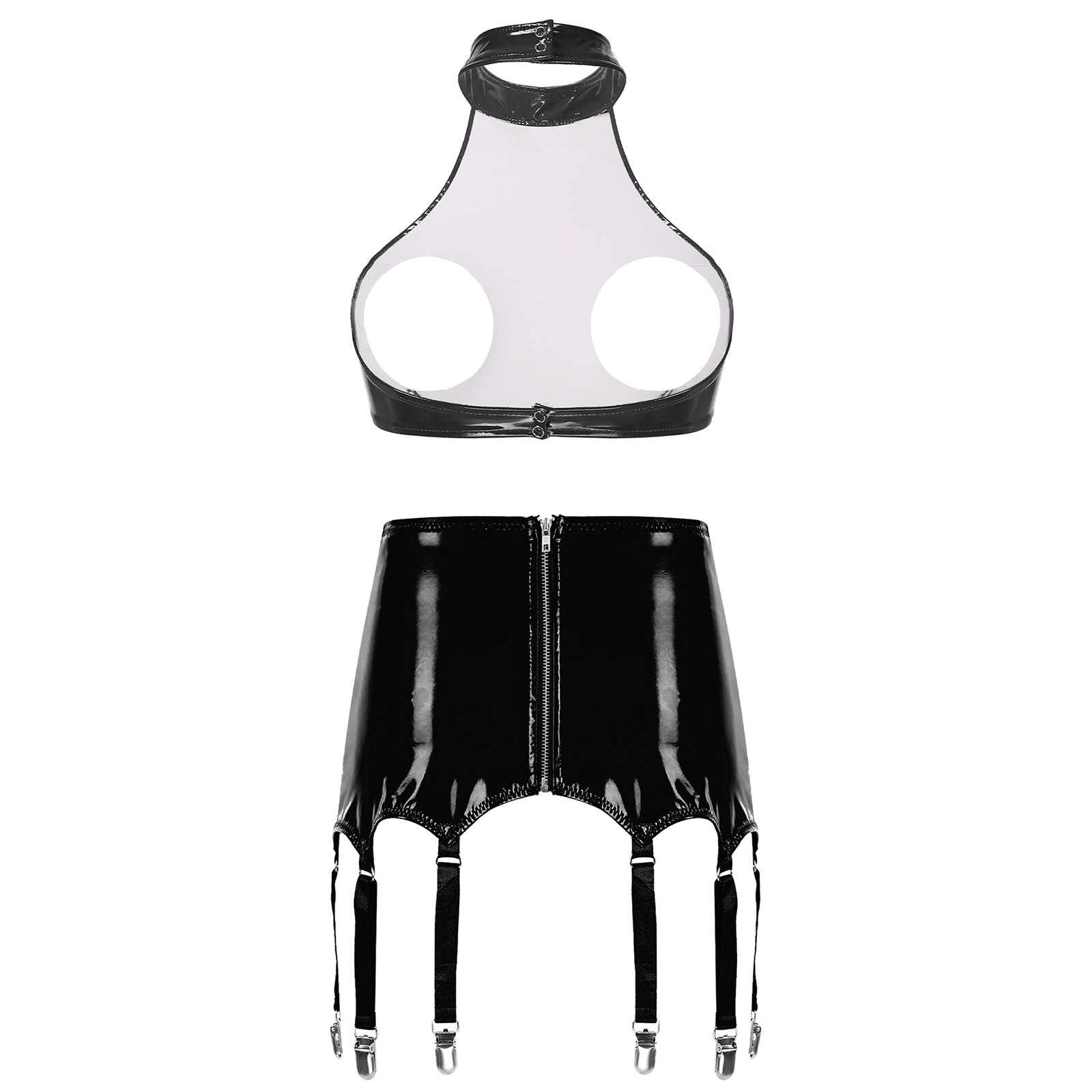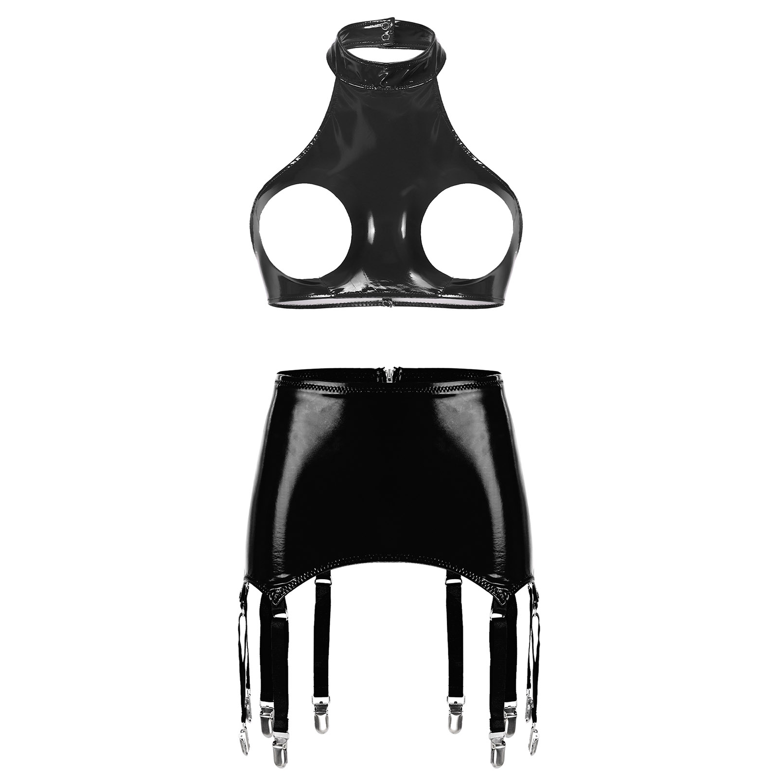 Womens Erotic Lingerie Set Halter Backless Bra Tops Open Cups Wire-free Brassiere with Zipper Garters Patent Leather Clubwear