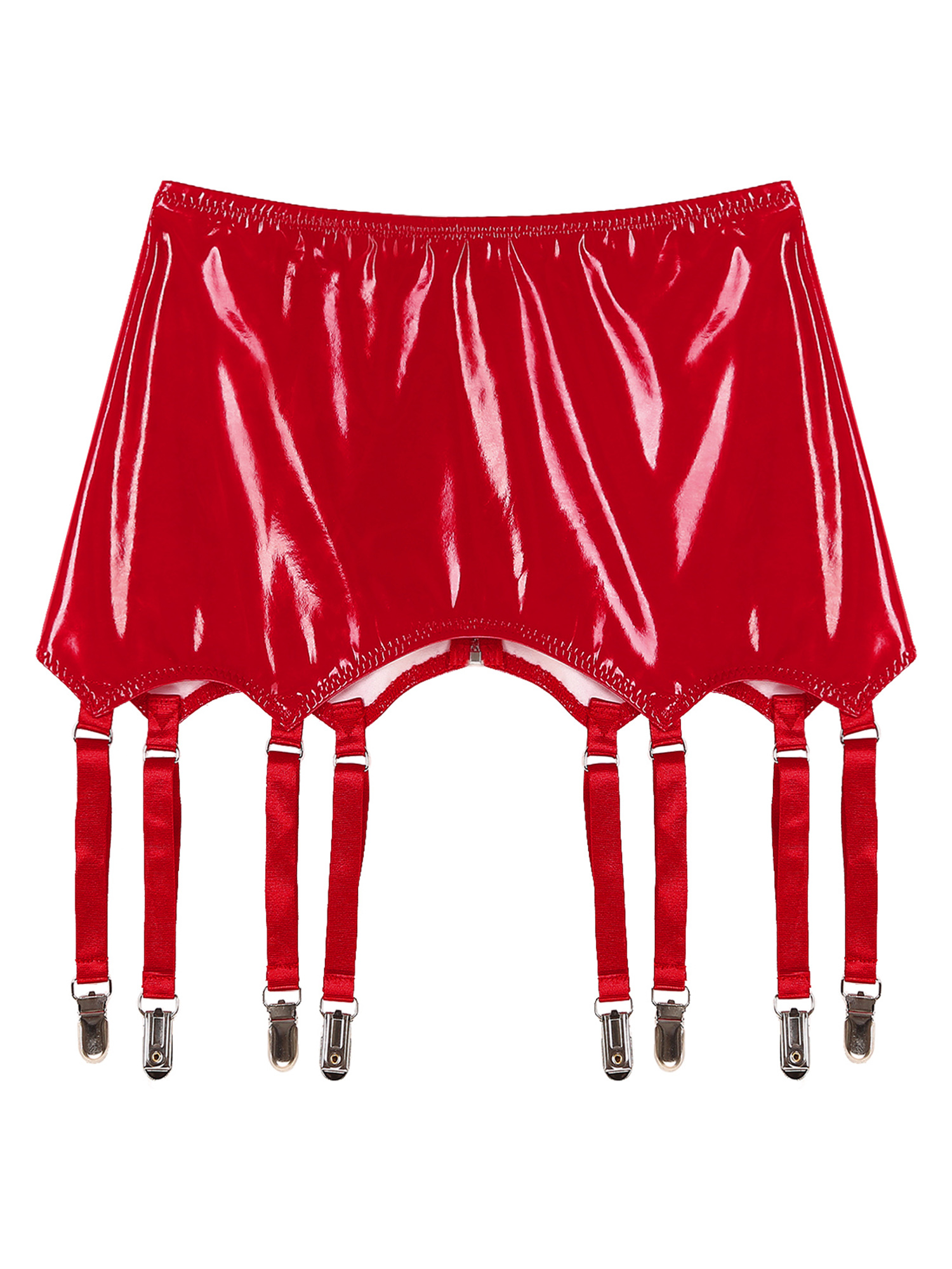 Patent leather garters with metal clips keep stockings from slipping. Back with zipper closure, easy to put on and take off.