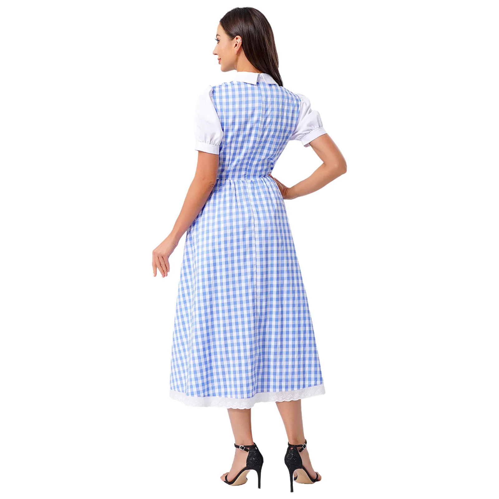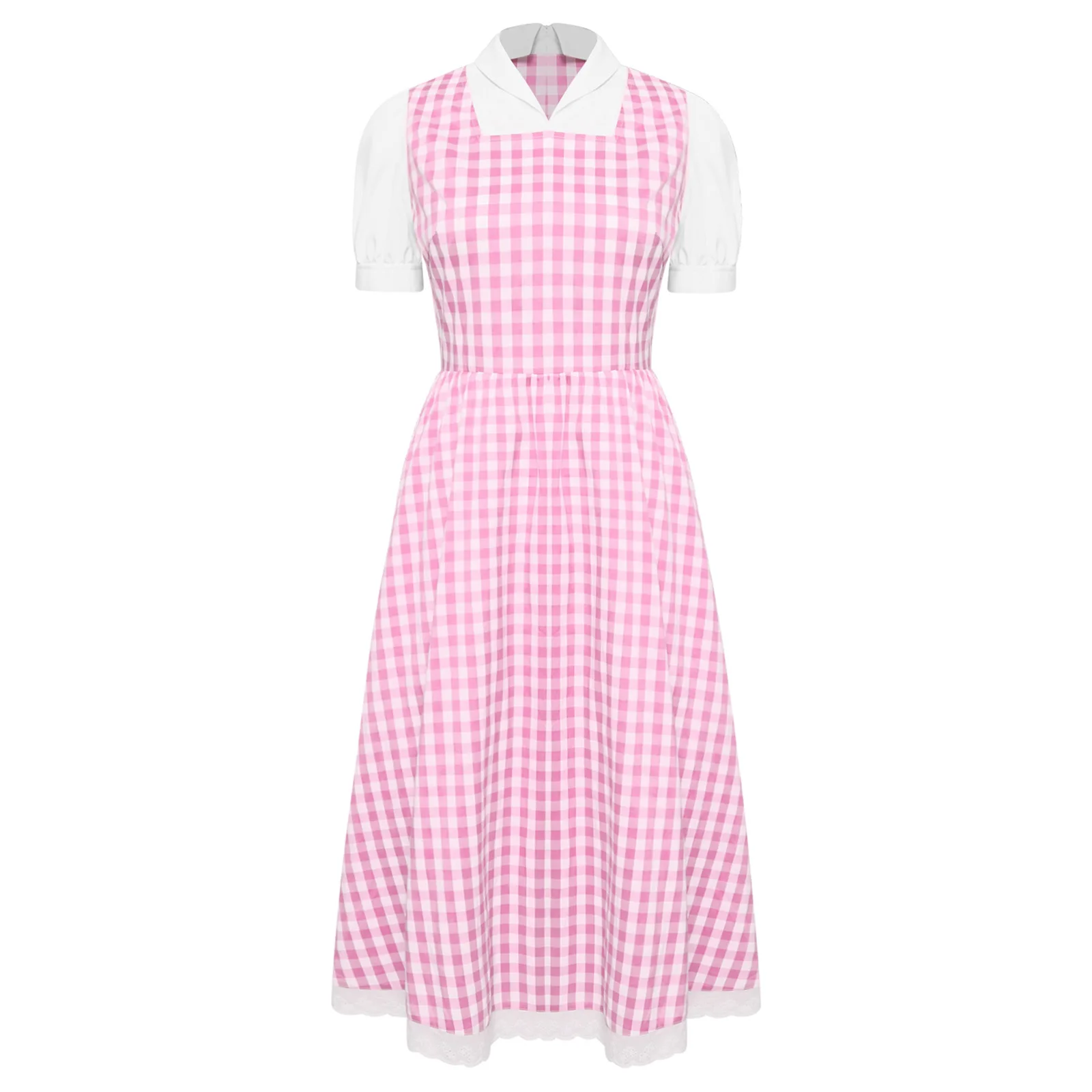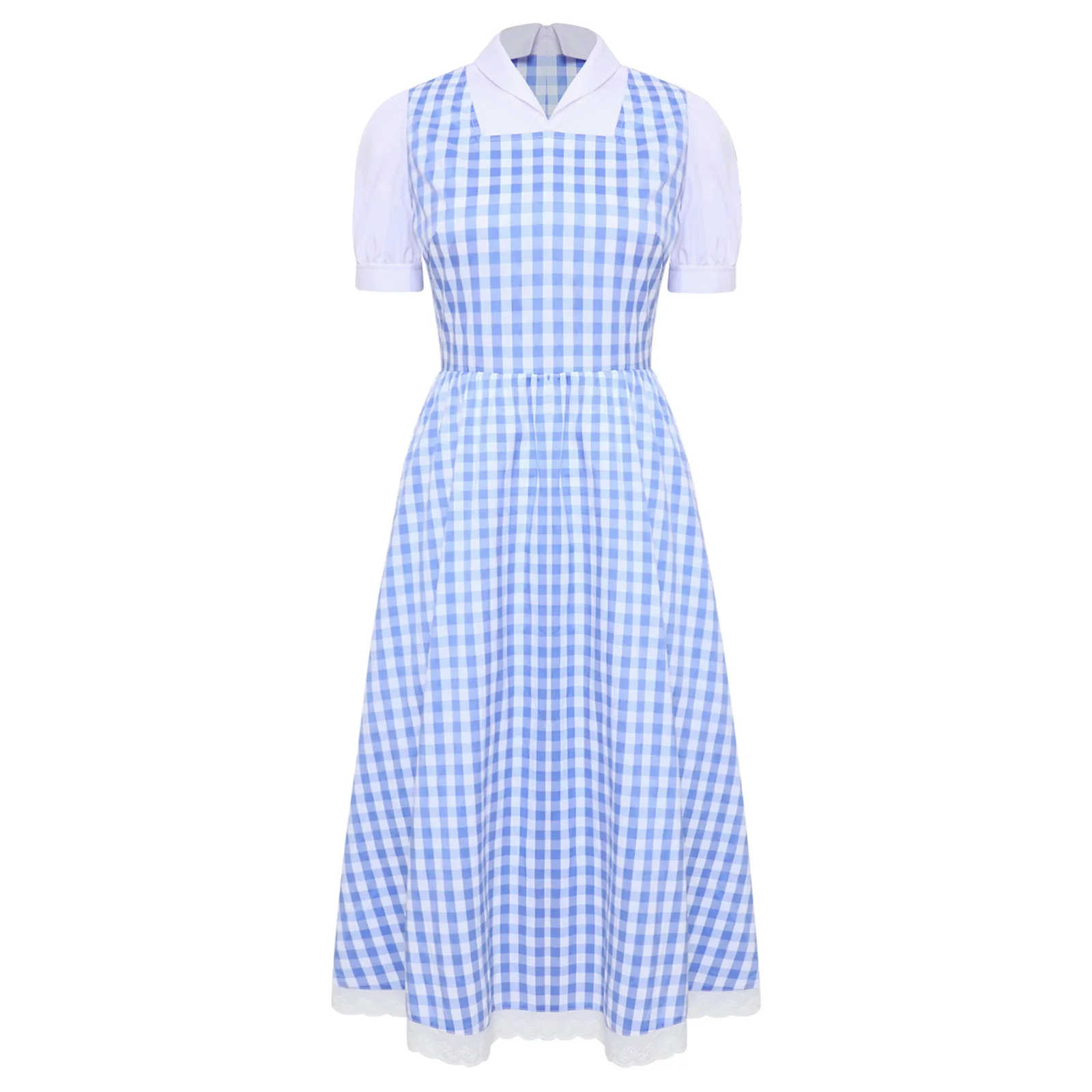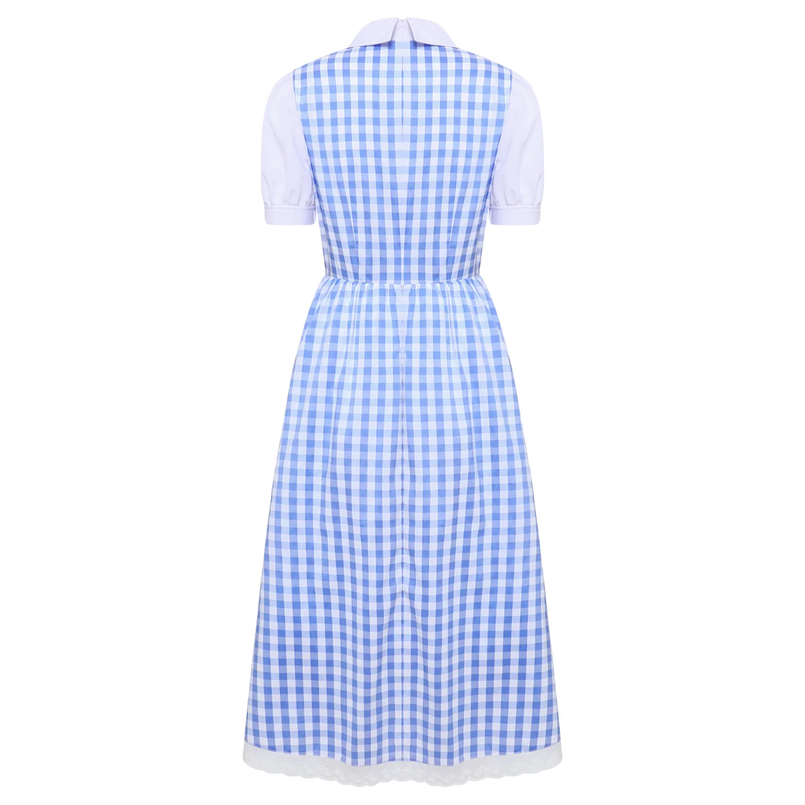 Womens Fairytale Maid Halloween Cosplay Costume Dress-up Checked Vintage Dress Lace Trim A-line Midi Length Plaid Tutu Dress