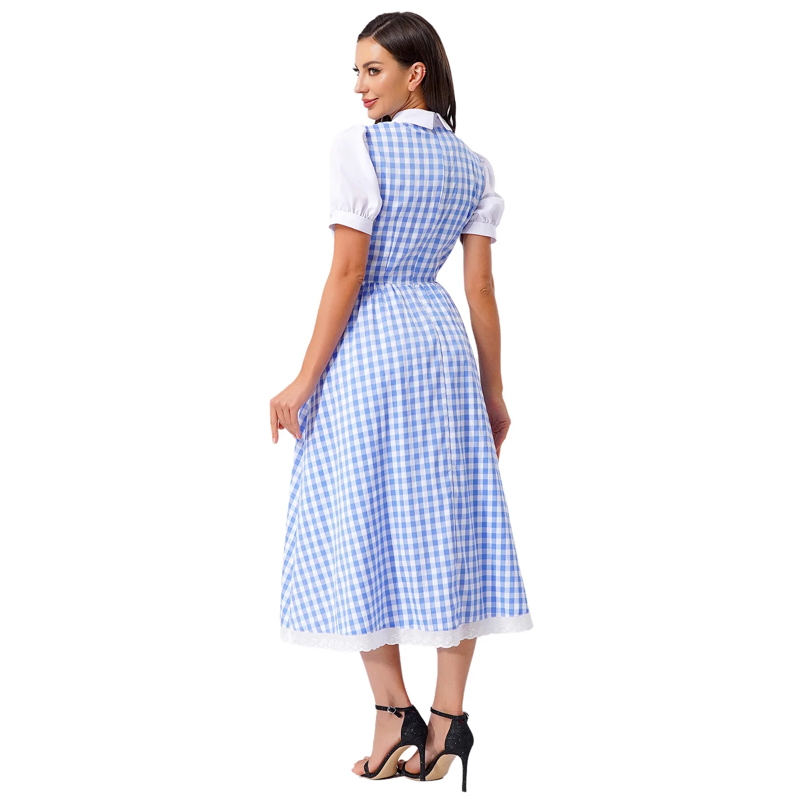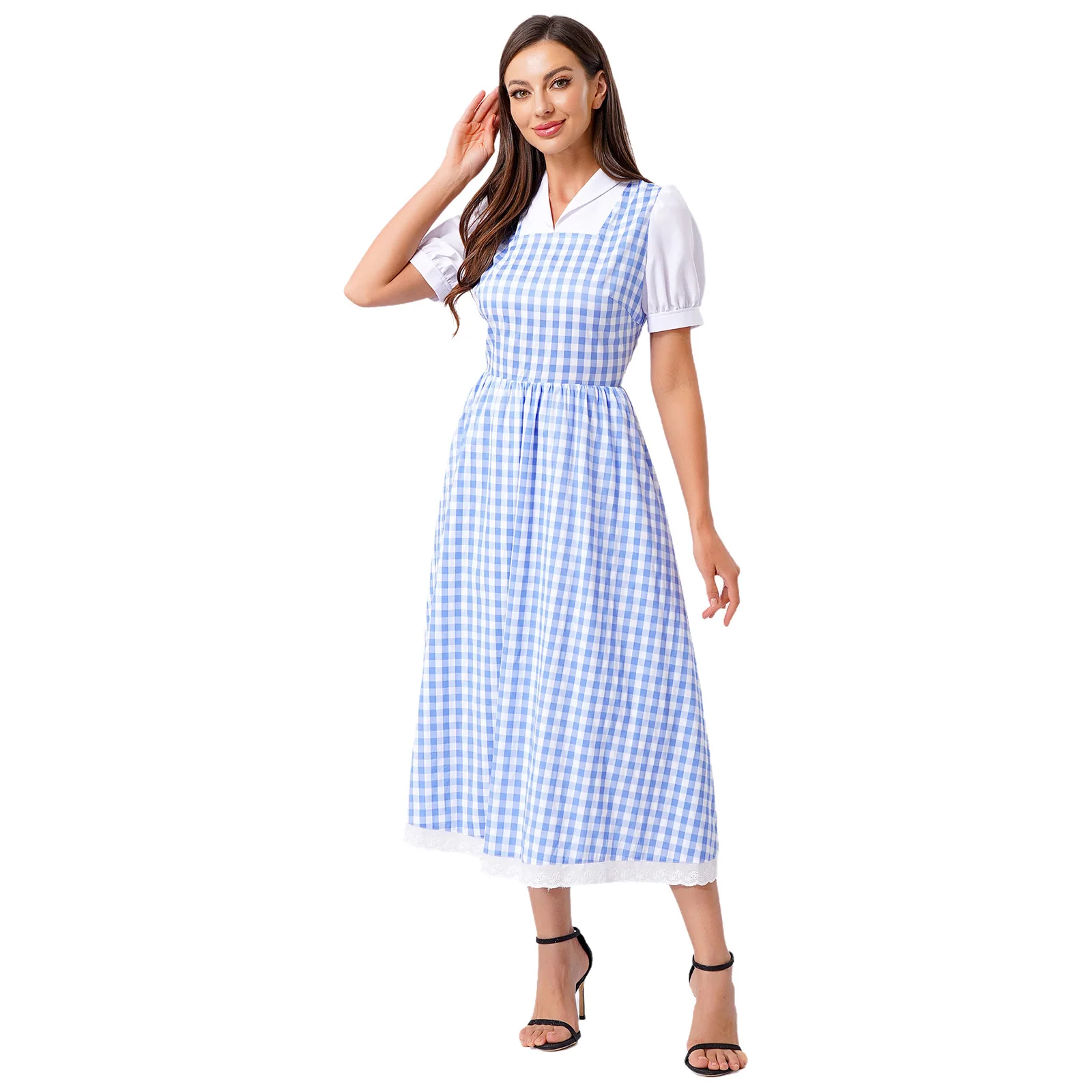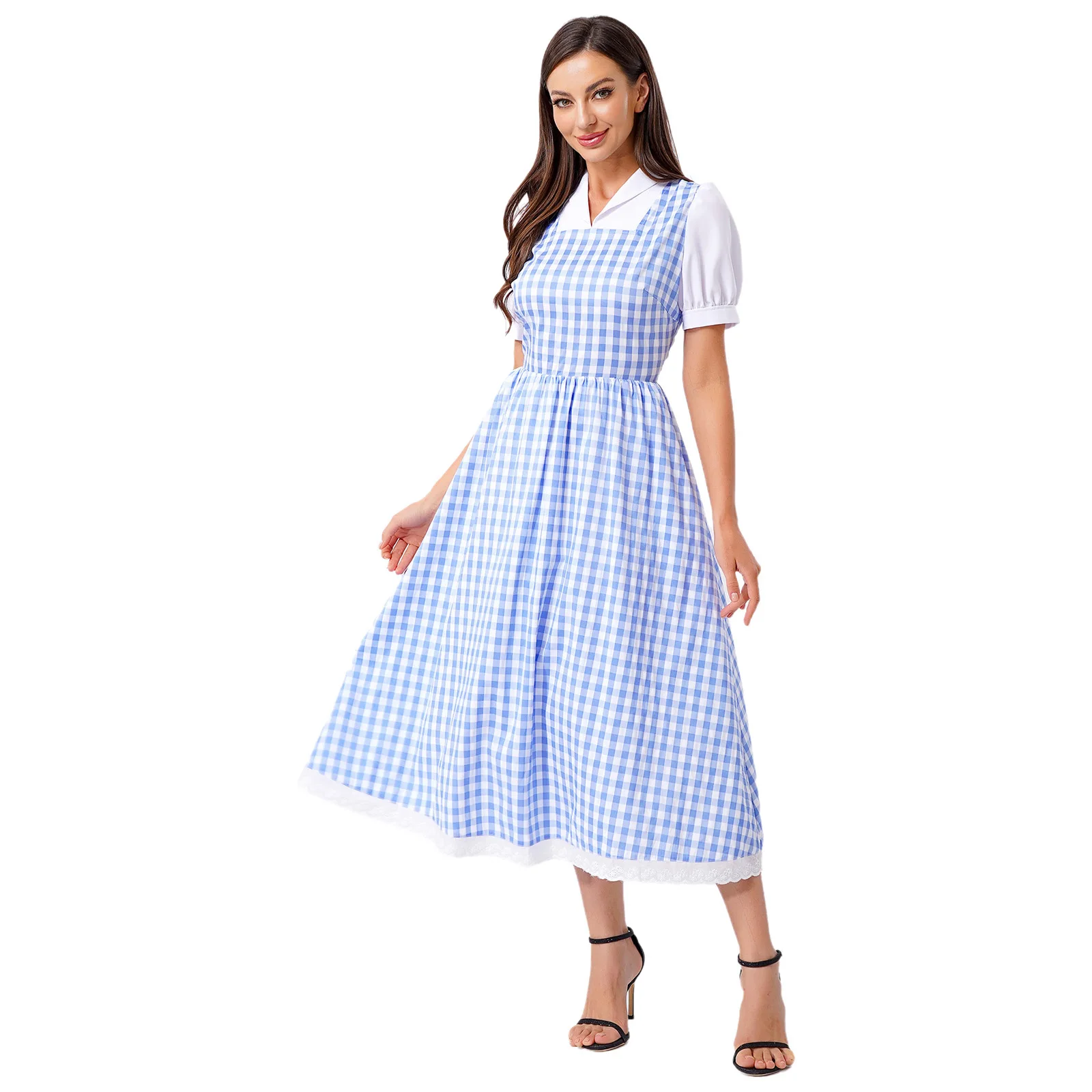 Womens Fairytale Maid Halloween Cosplay Costume Dress-up Checked Vintage Dress Lace Trim A-line Midi Length Plaid Tutu Dress