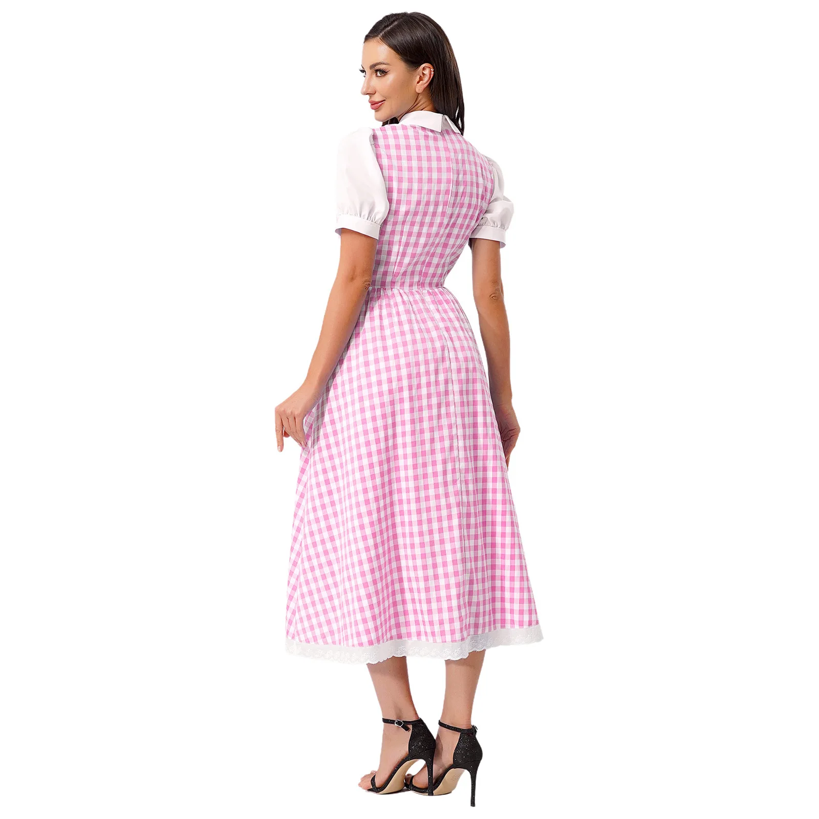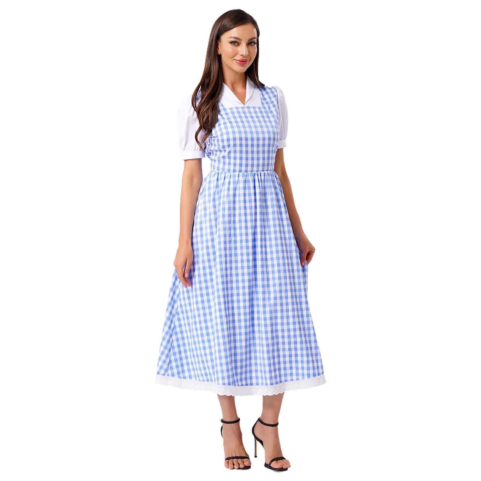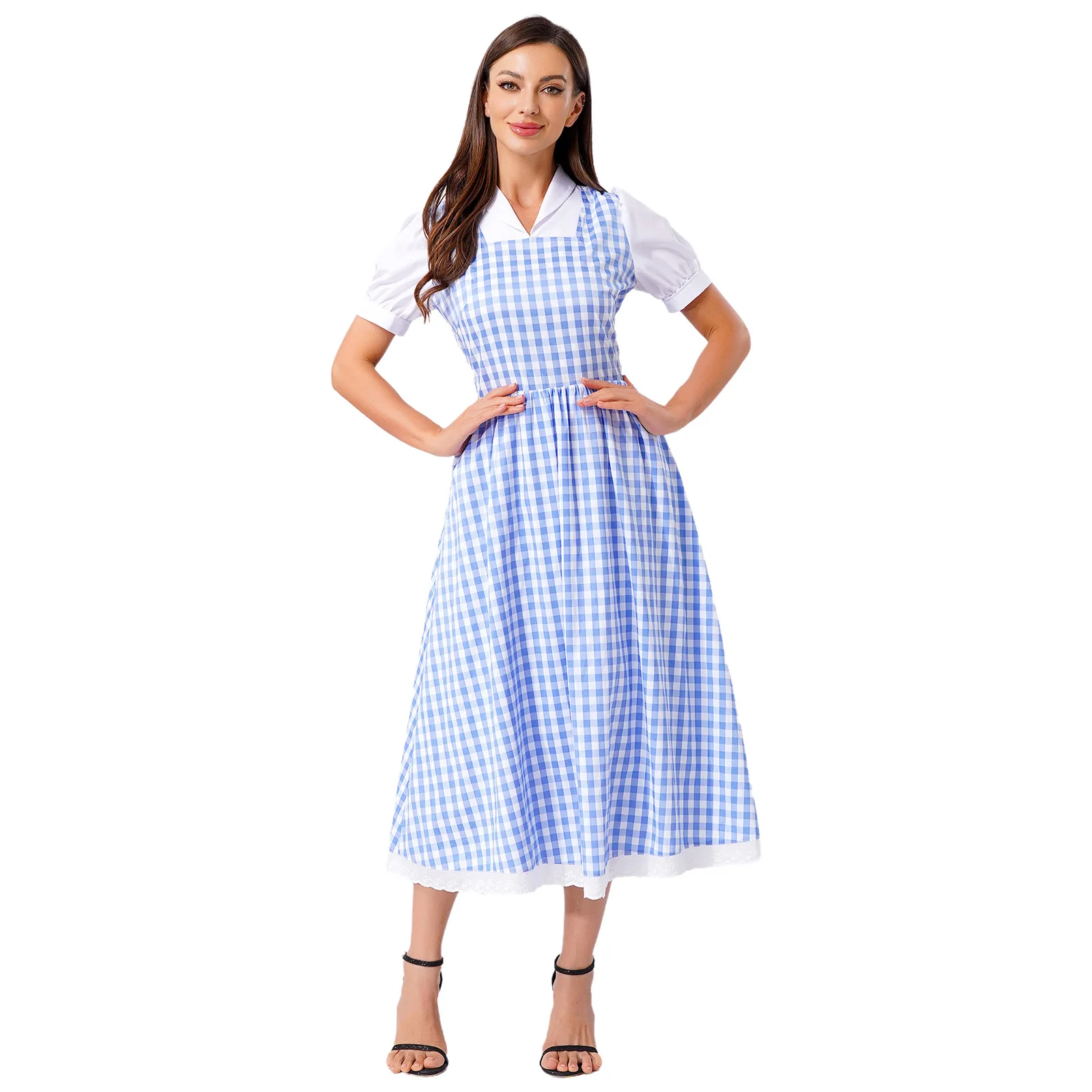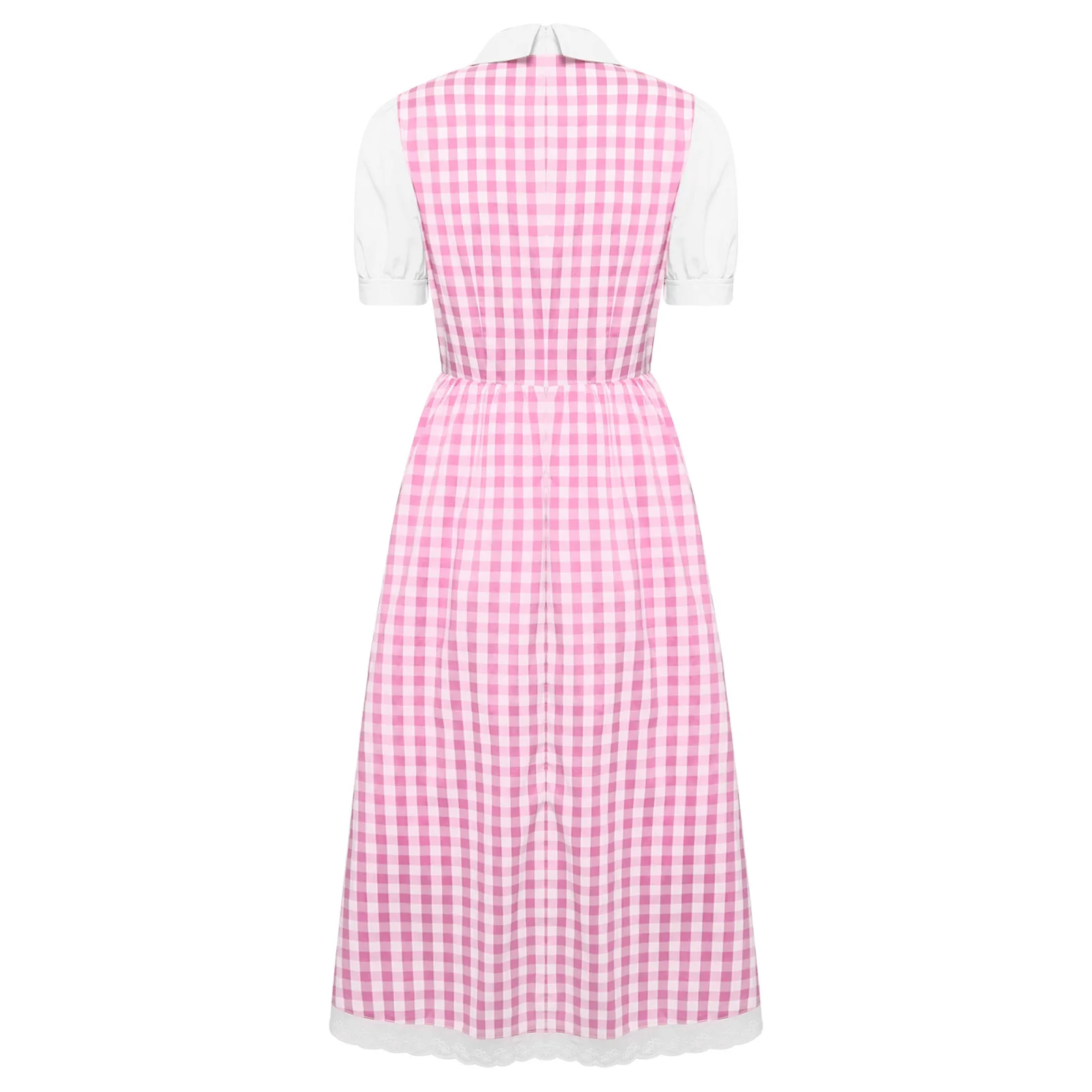 Womens Fairytale Maid Halloween Cosplay Costume Dress-up Checked Vintage Dress Lace Trim A-line Midi Length Plaid Tutu Dress