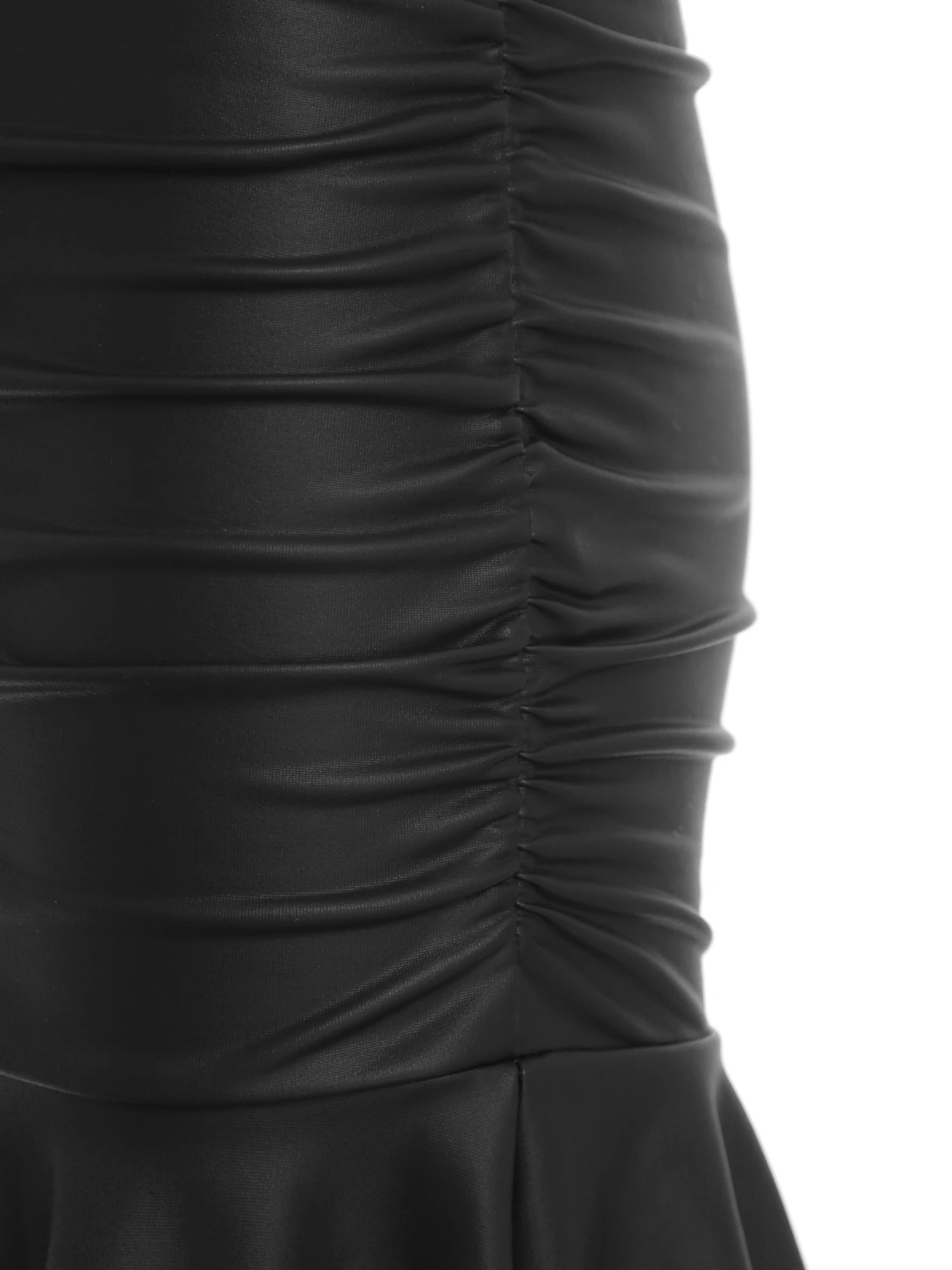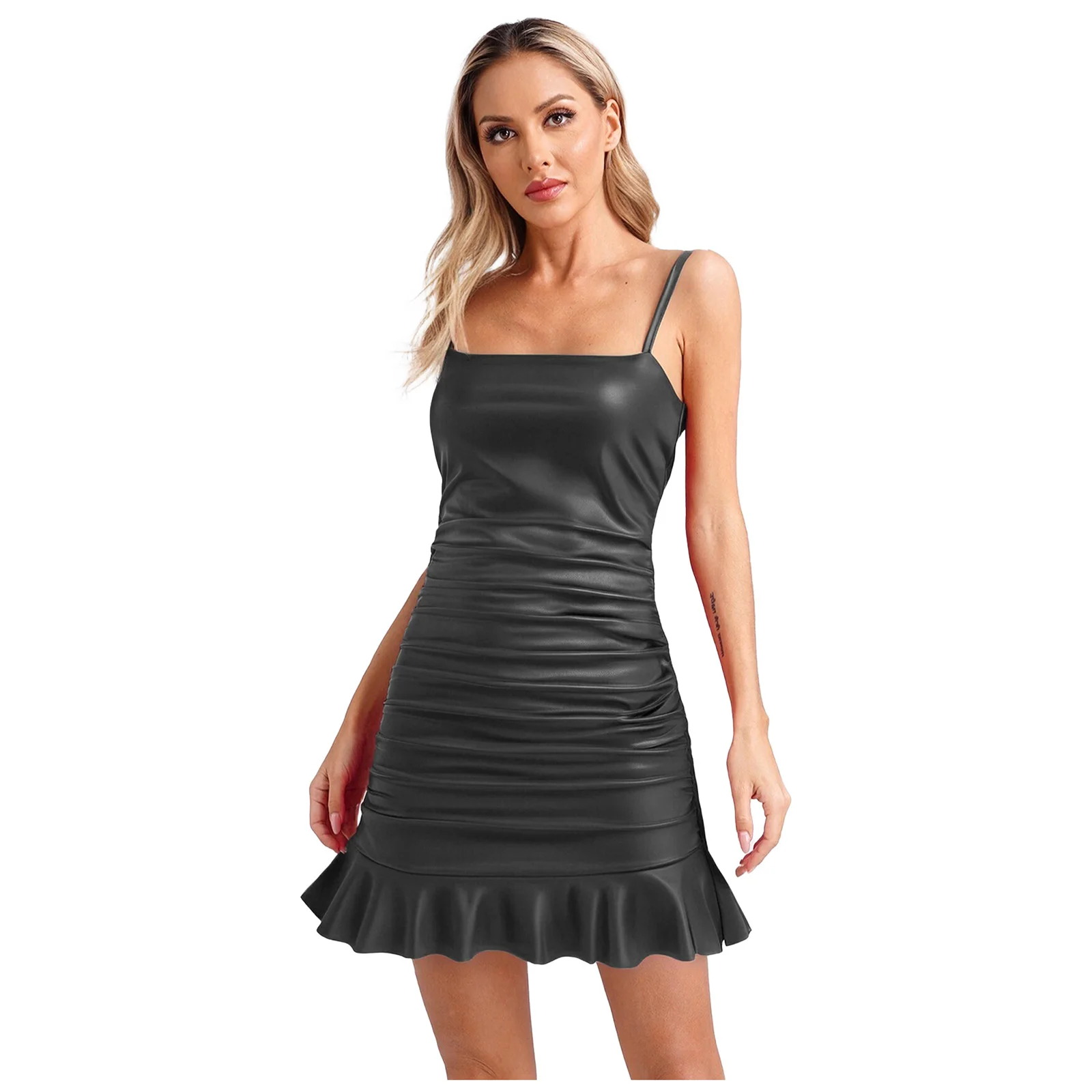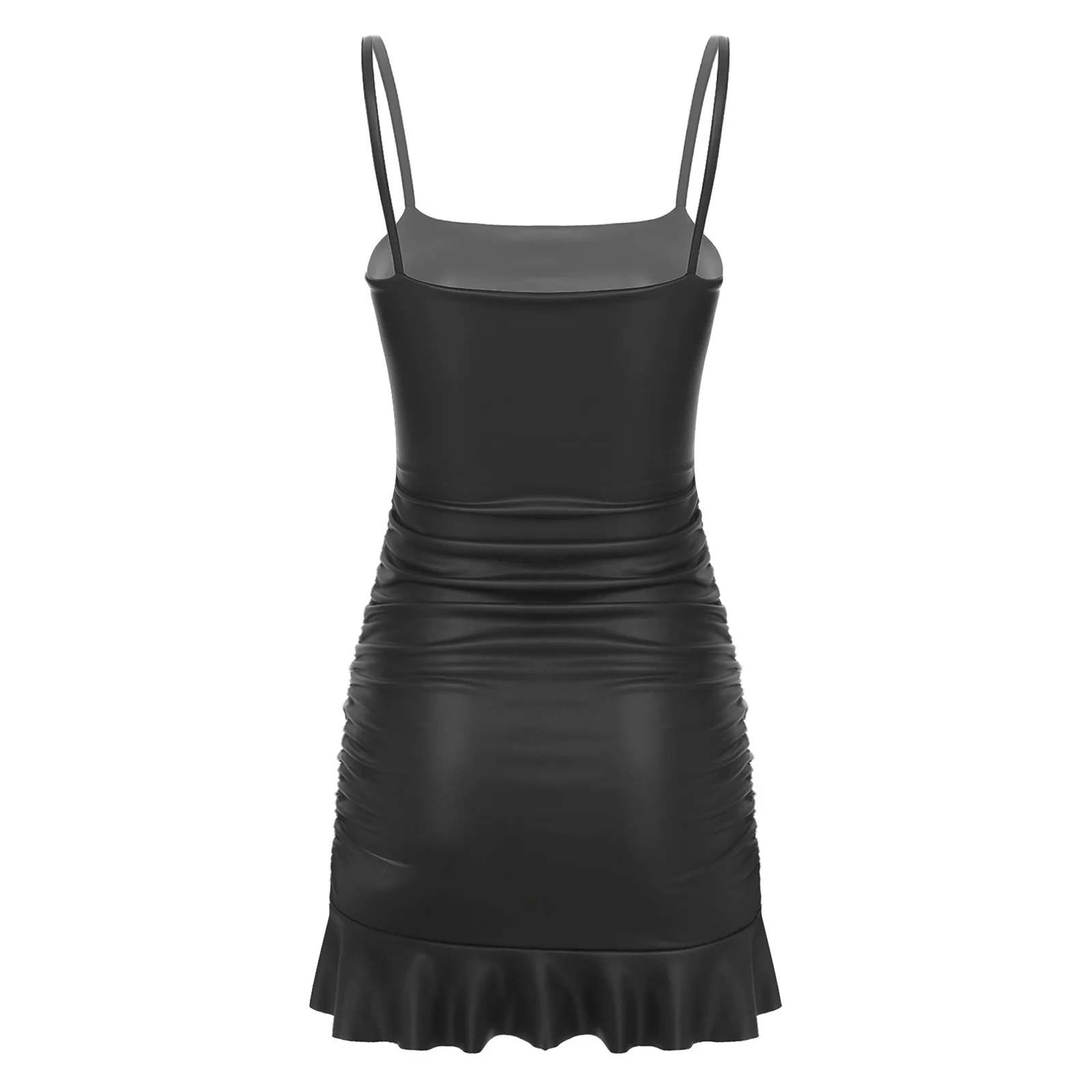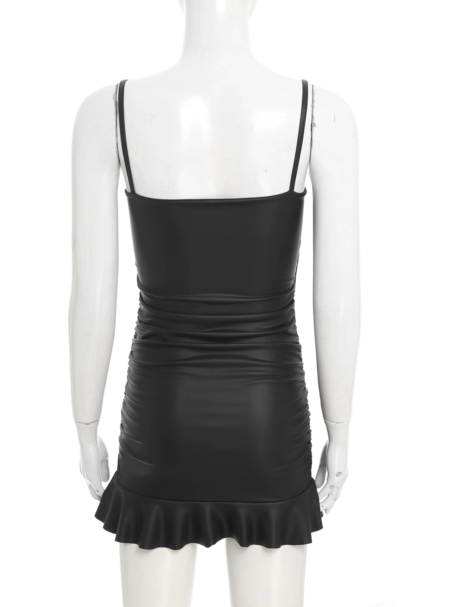 Womens Faux Leather Bodycon Mini Dress Side Ruched Ruffled Hem Slim Sling Hip Ruched Dress Spaghetti Strap Rave Party Clubwear