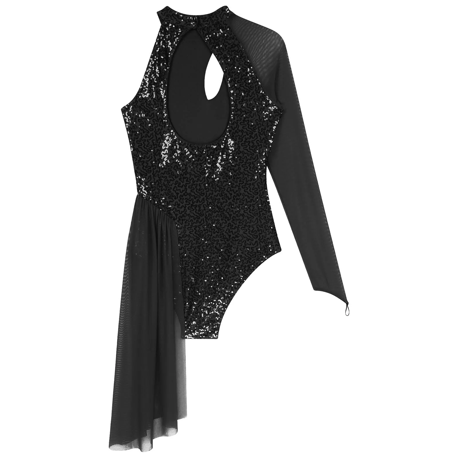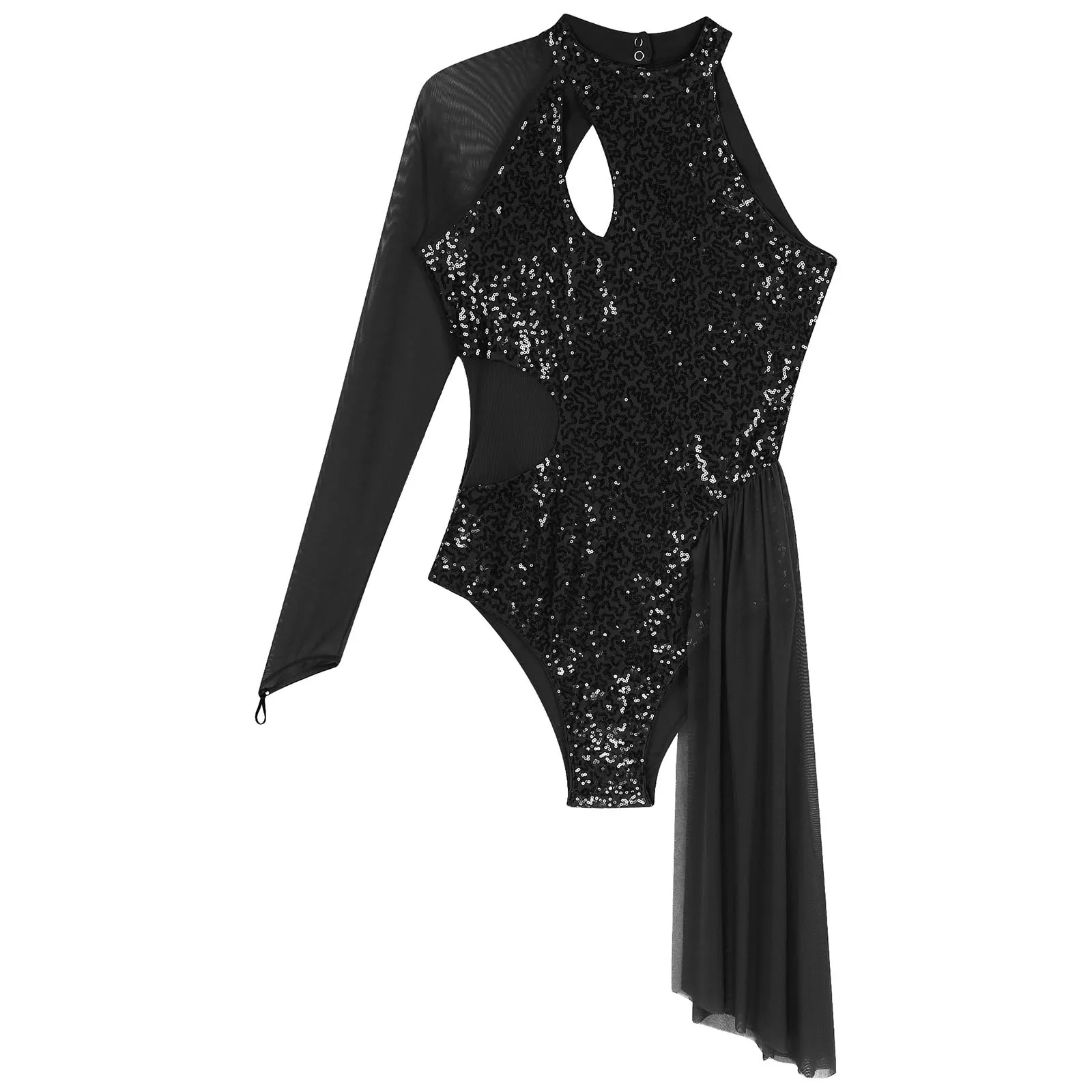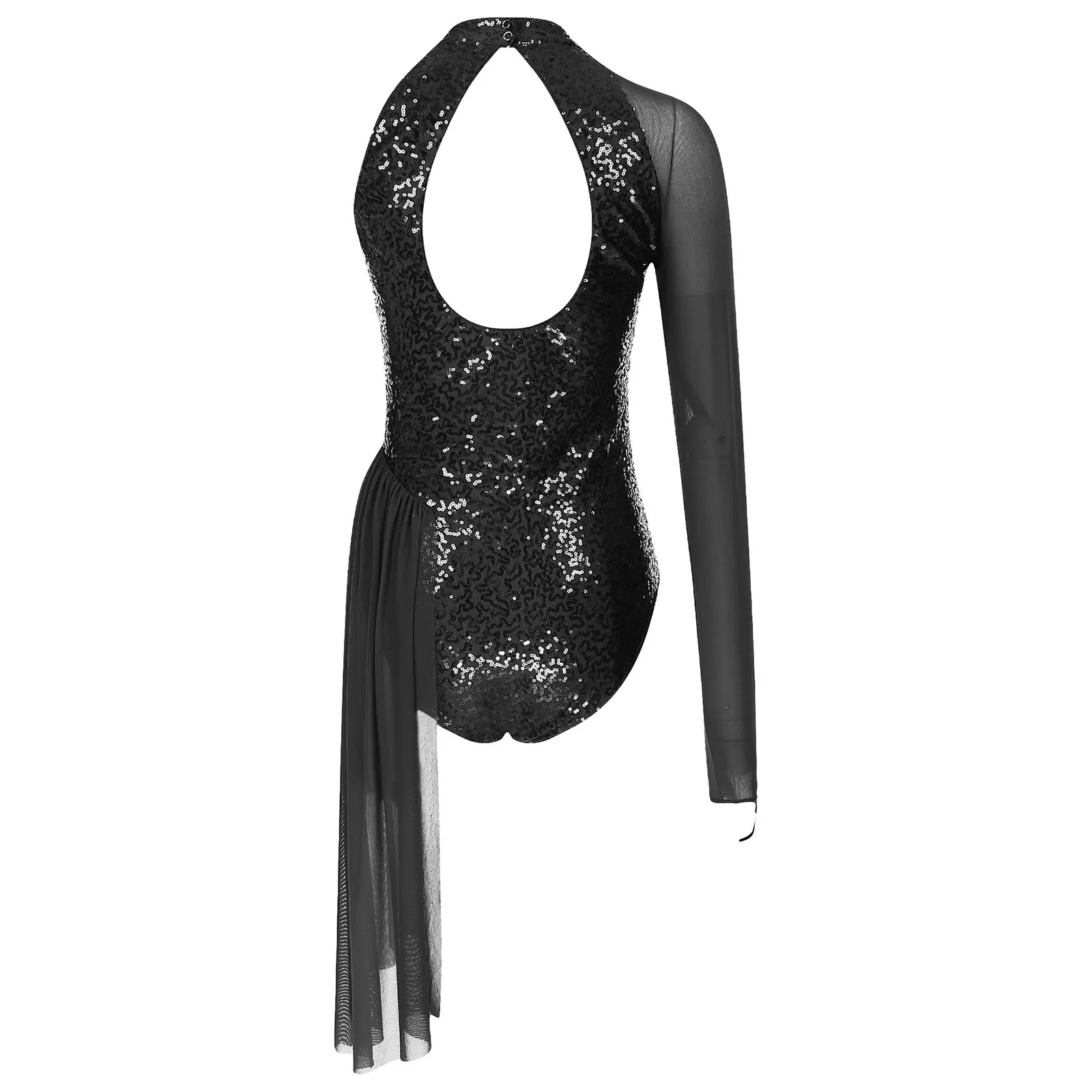 One shoulder, sheer mesh long sleeve, cutout design at the front and back, a layer of mesh skirt on one side.