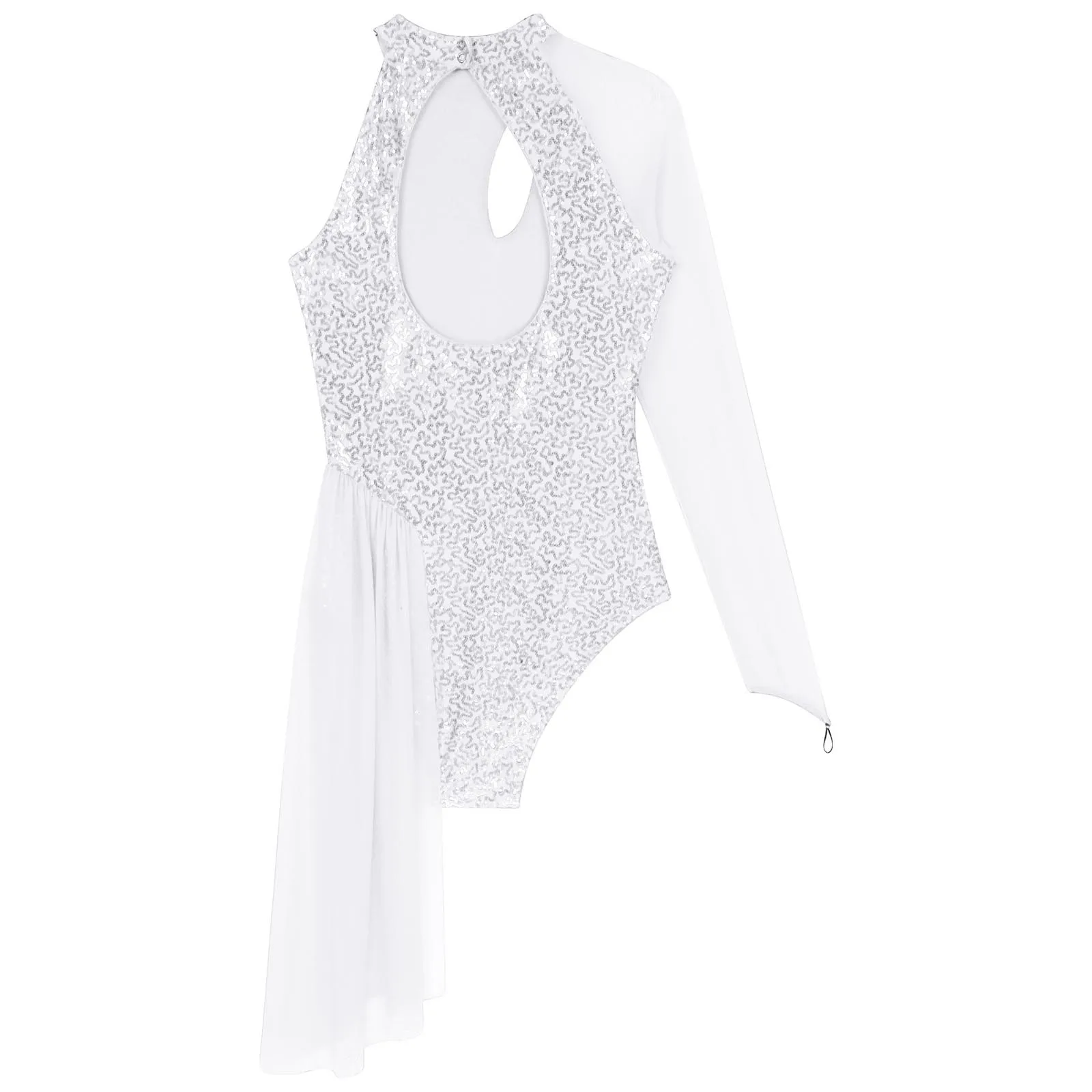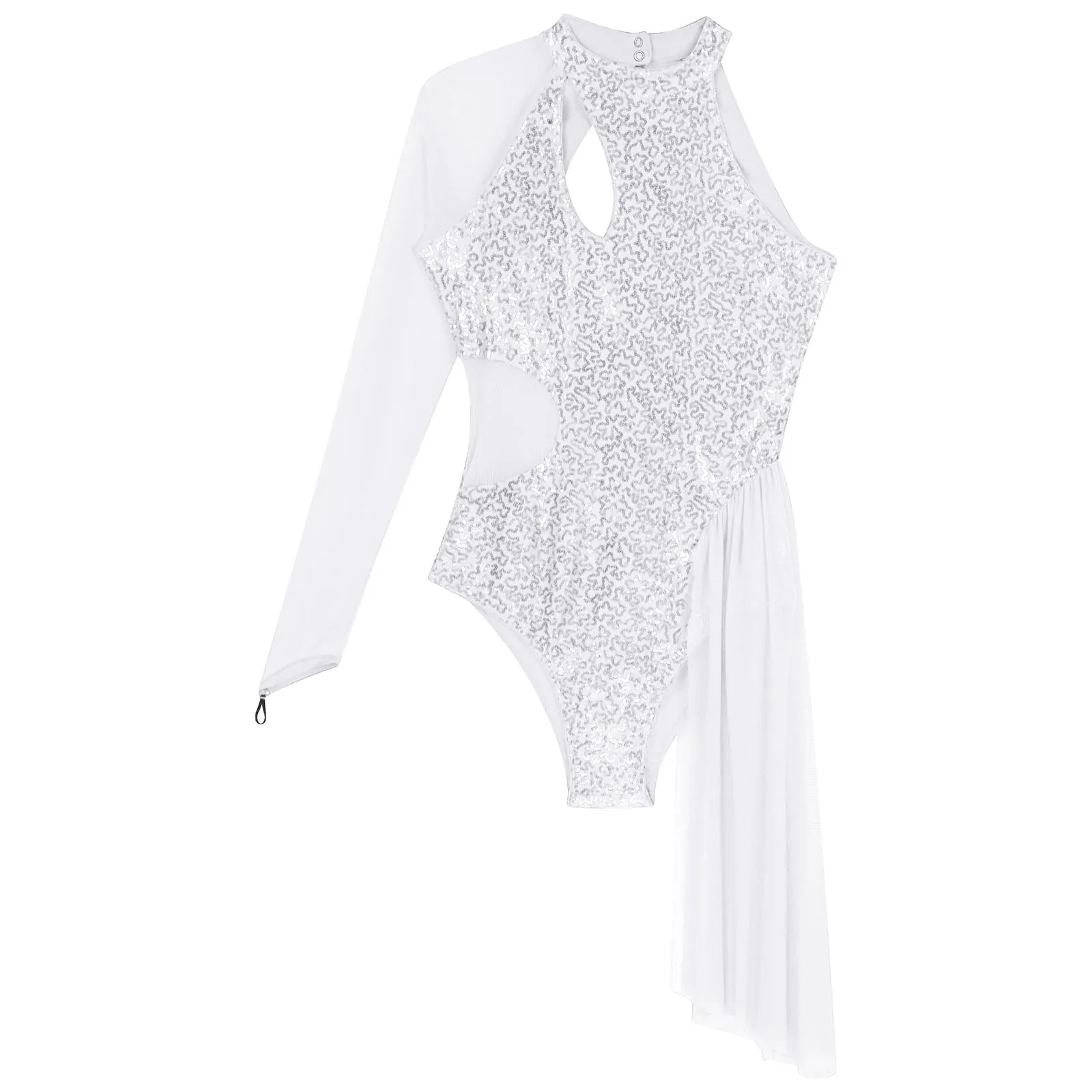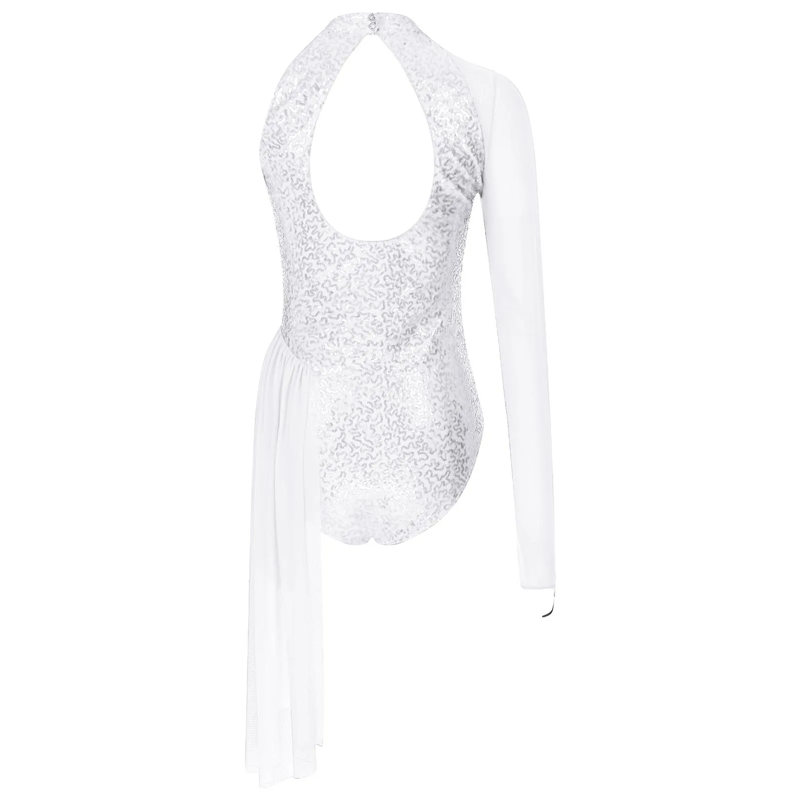 One shoulder, sheer mesh long sleeve, cutout design at the front and back, a layer of mesh skirt on one side.