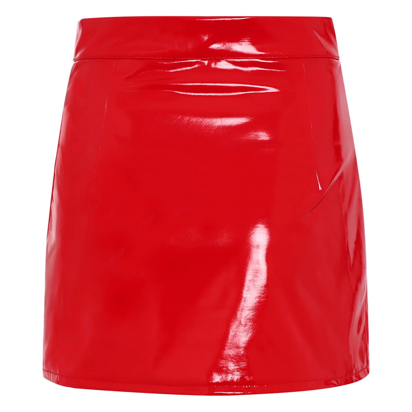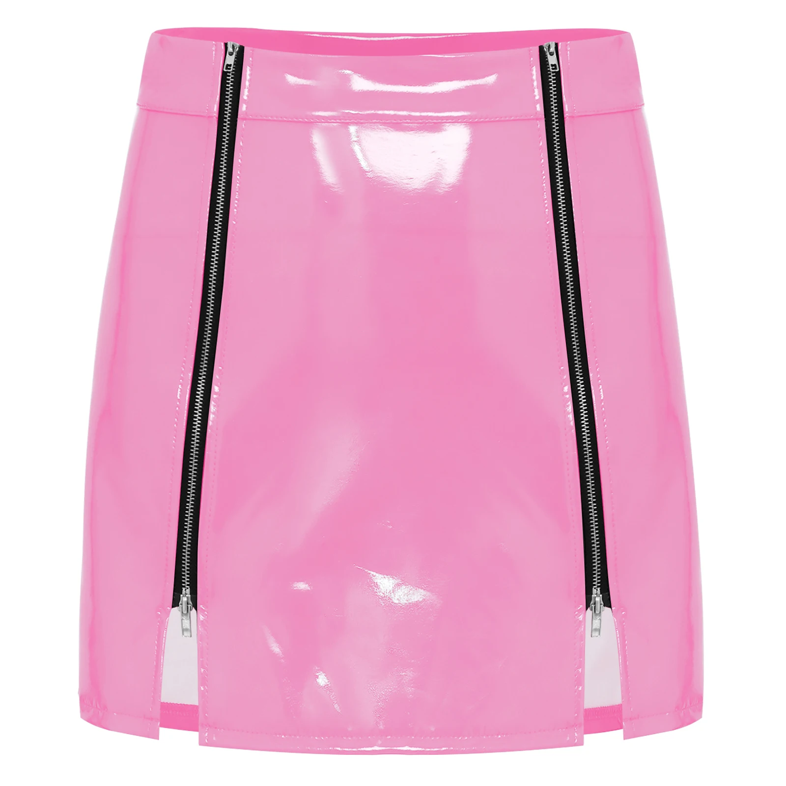 Womens Glossy PU Bodycon Skirt High Waist Front Double Zipper Slit A-line Skirt Wet Look Skirt Club Pole Dance Raves Costumes