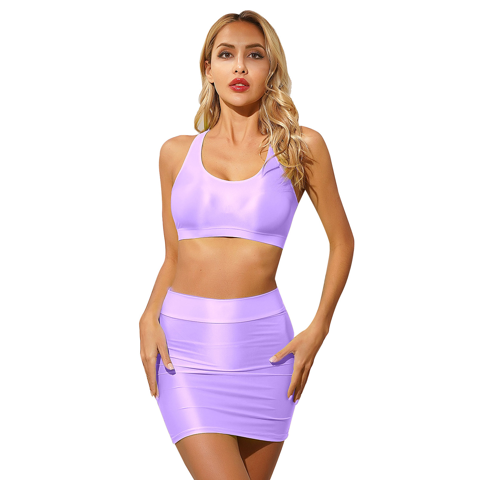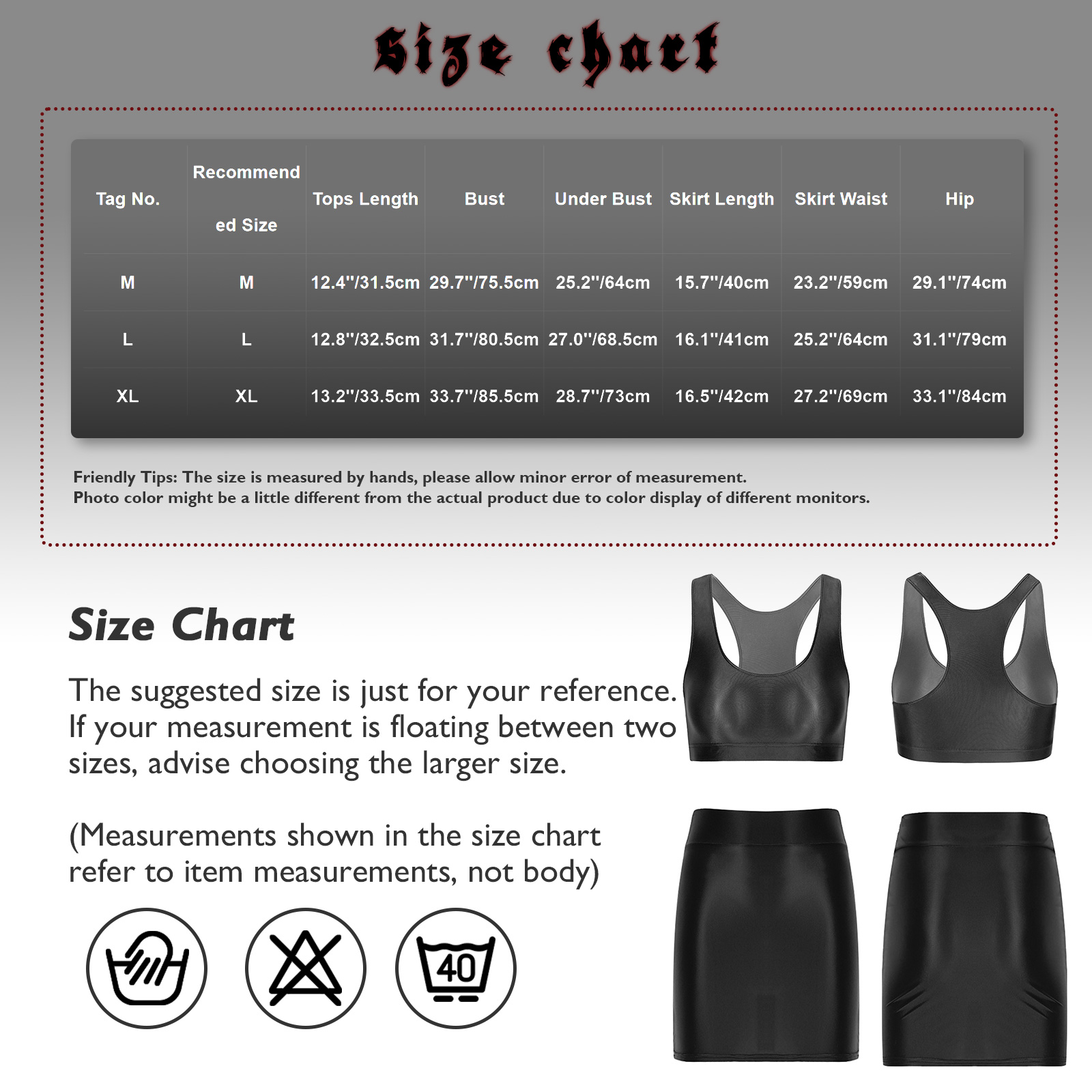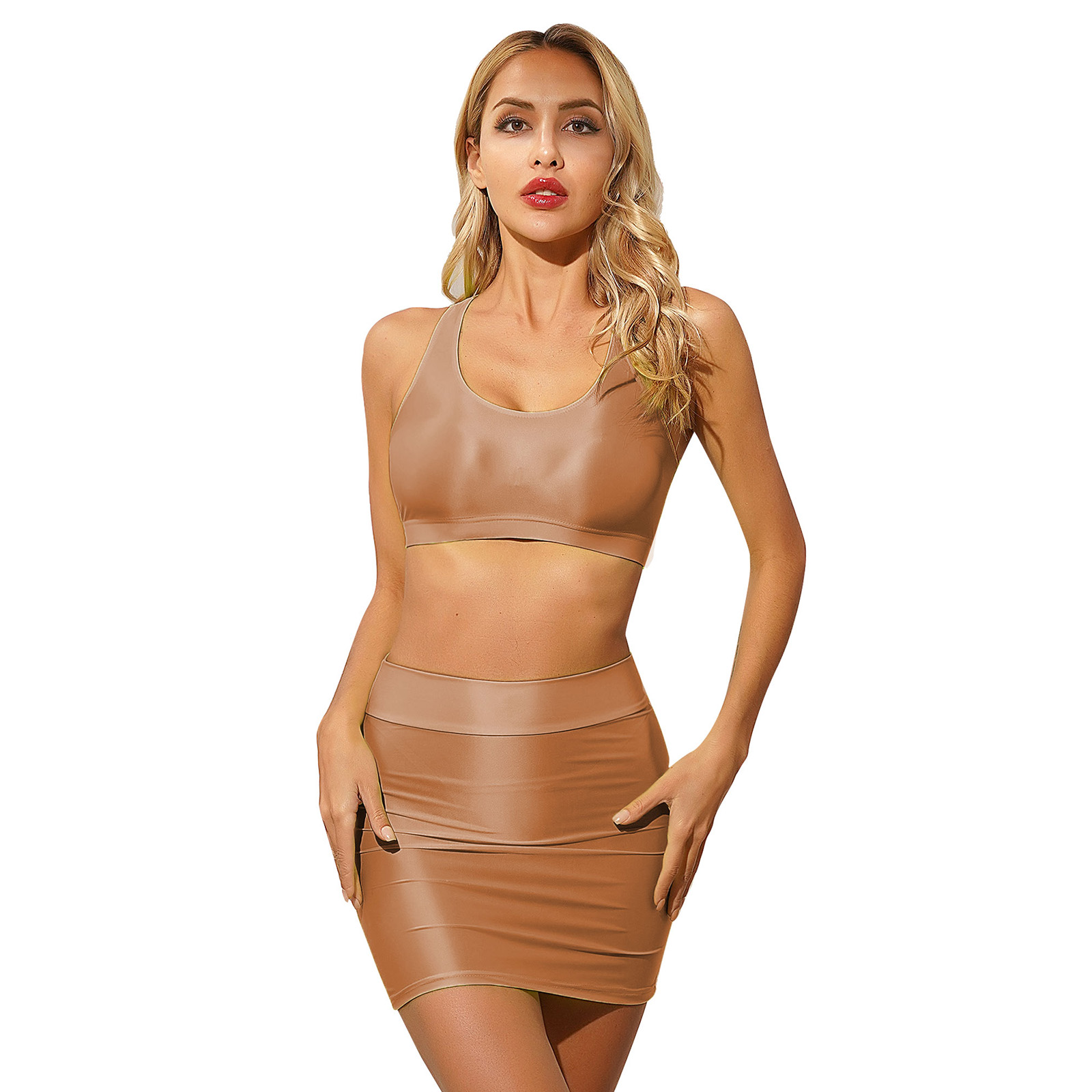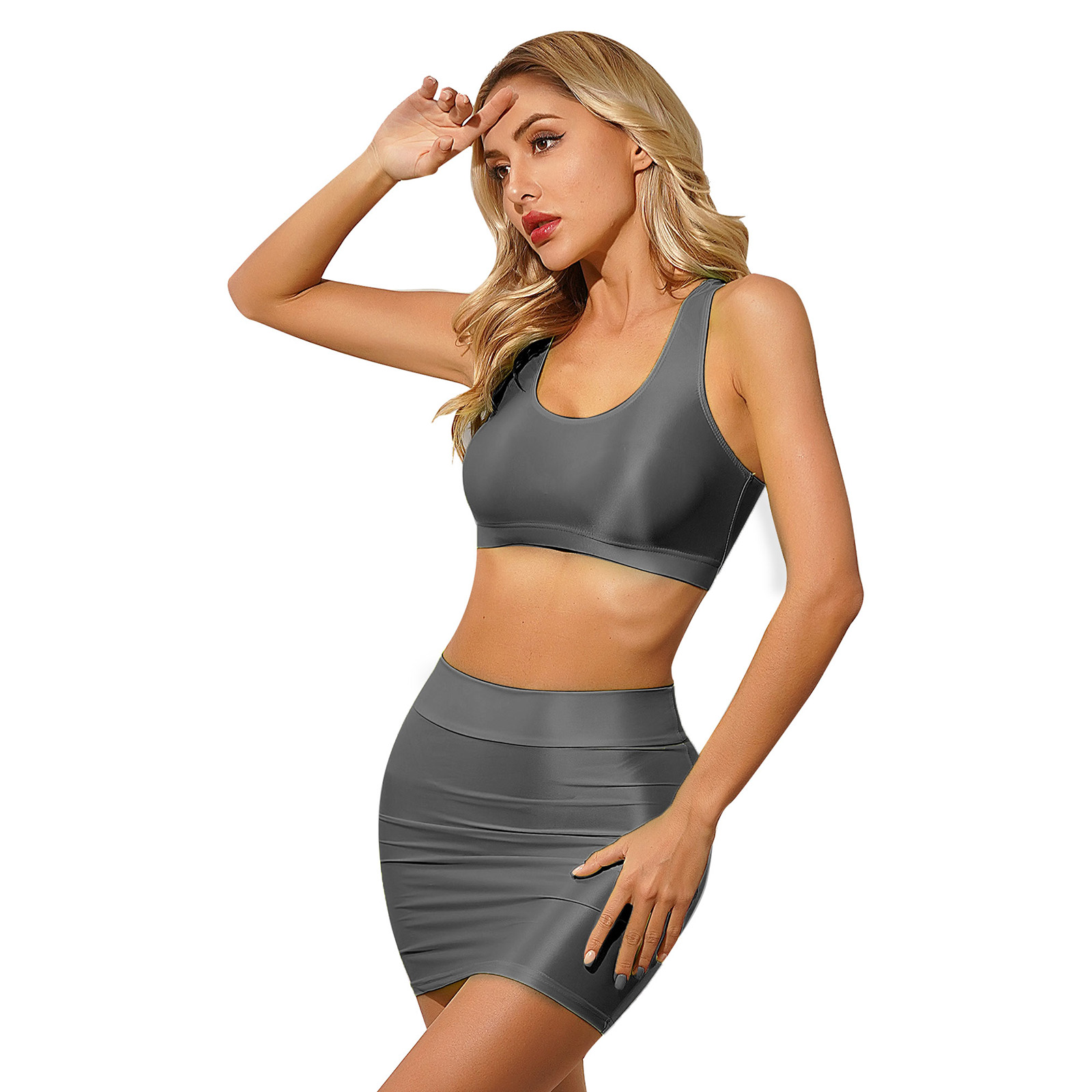 Womens Glossy U Neck Tank Tops Solid Color Sleeveless Crop Top Vest High Waist Elastic Waistband Pencil Skirt Rave Party Outfit