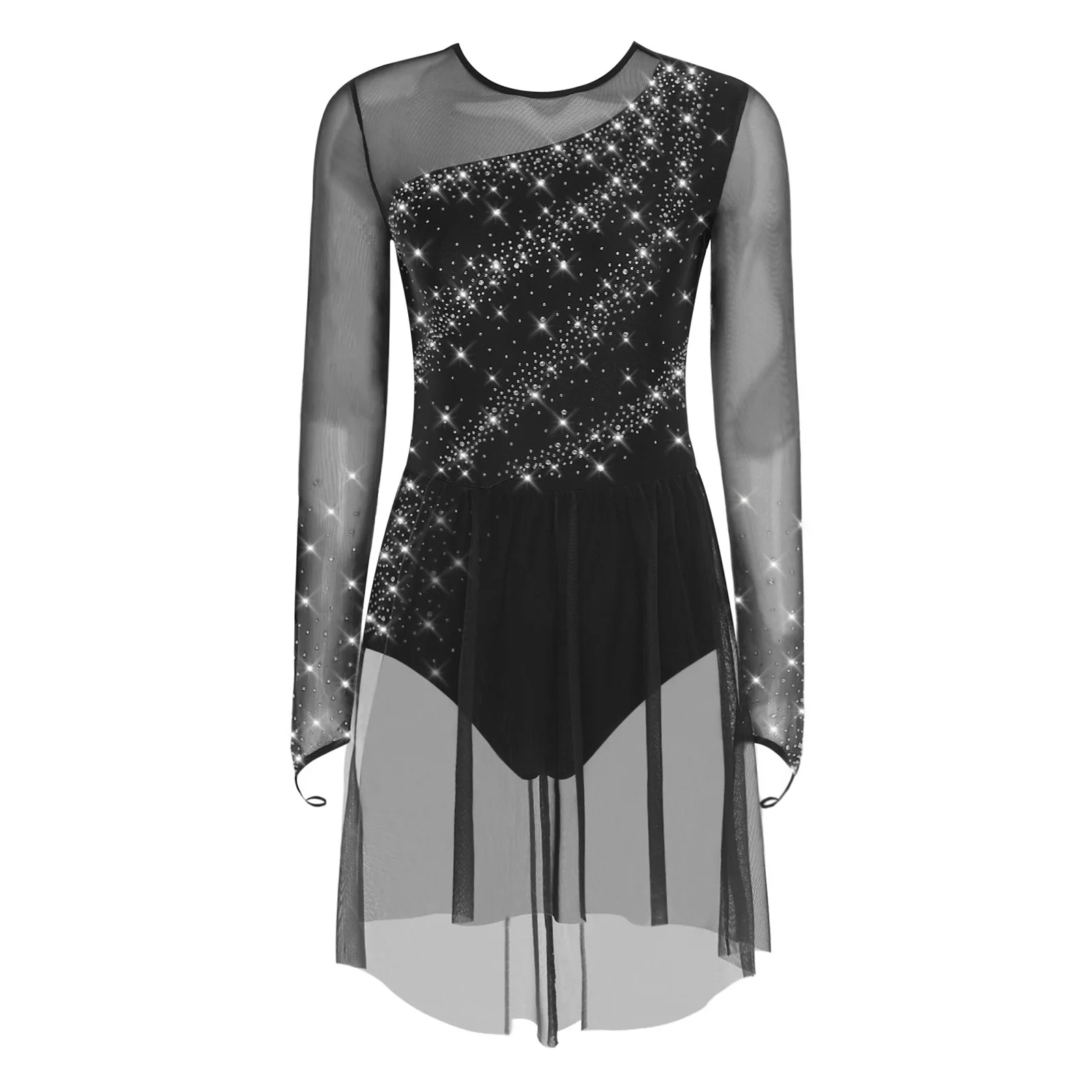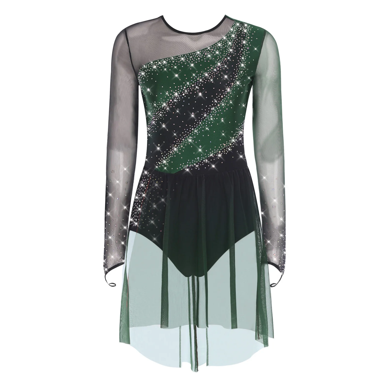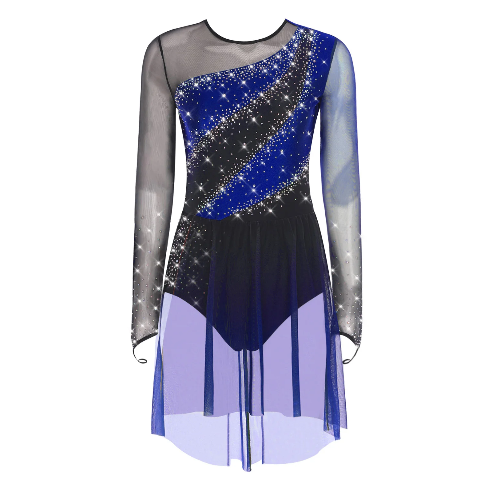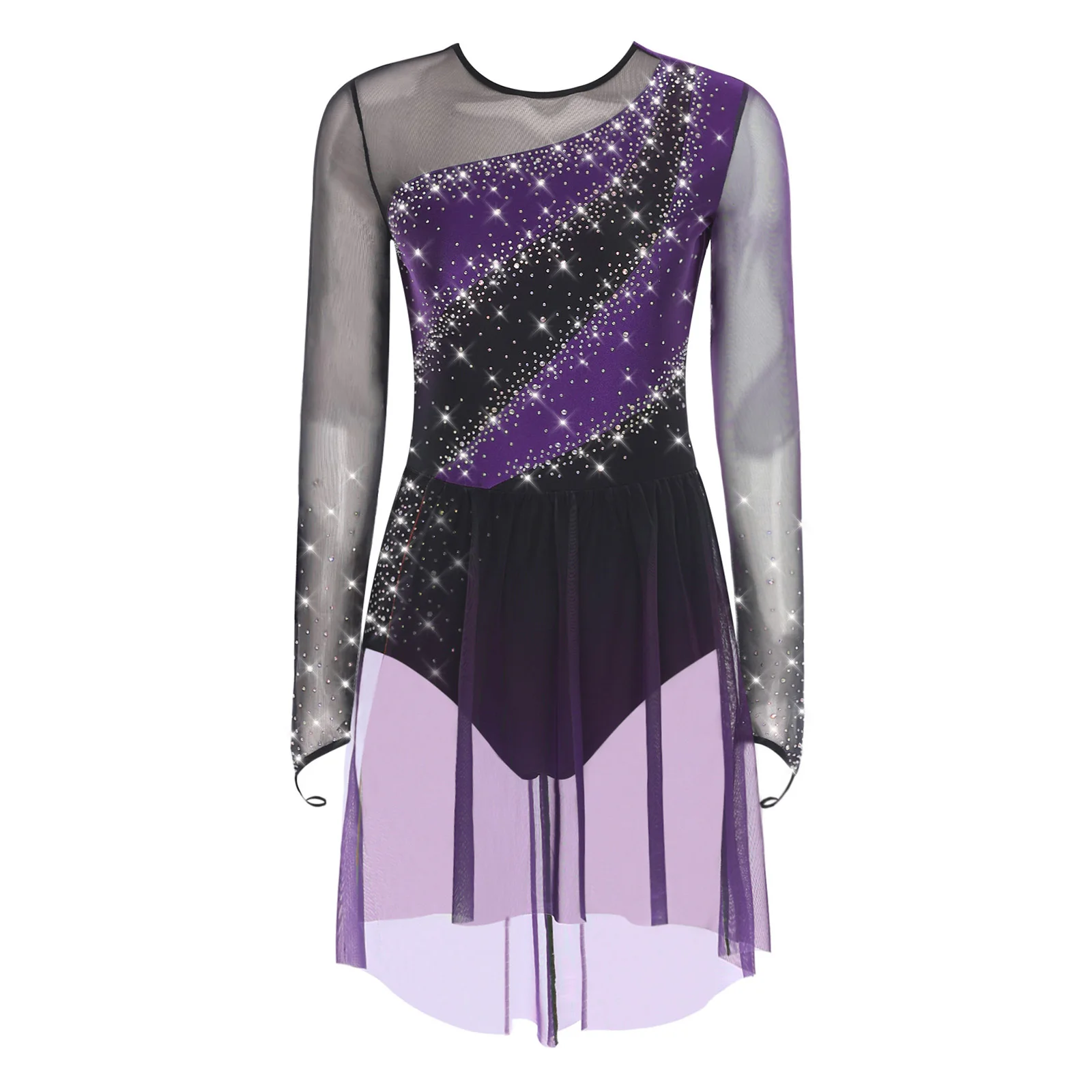 Womens Gymnastics Artistic Figure Skating Costume Shiny Ballet Lyrical Dance Leotard Dress Shiny Rhinestones Gradient Mesh Skirt