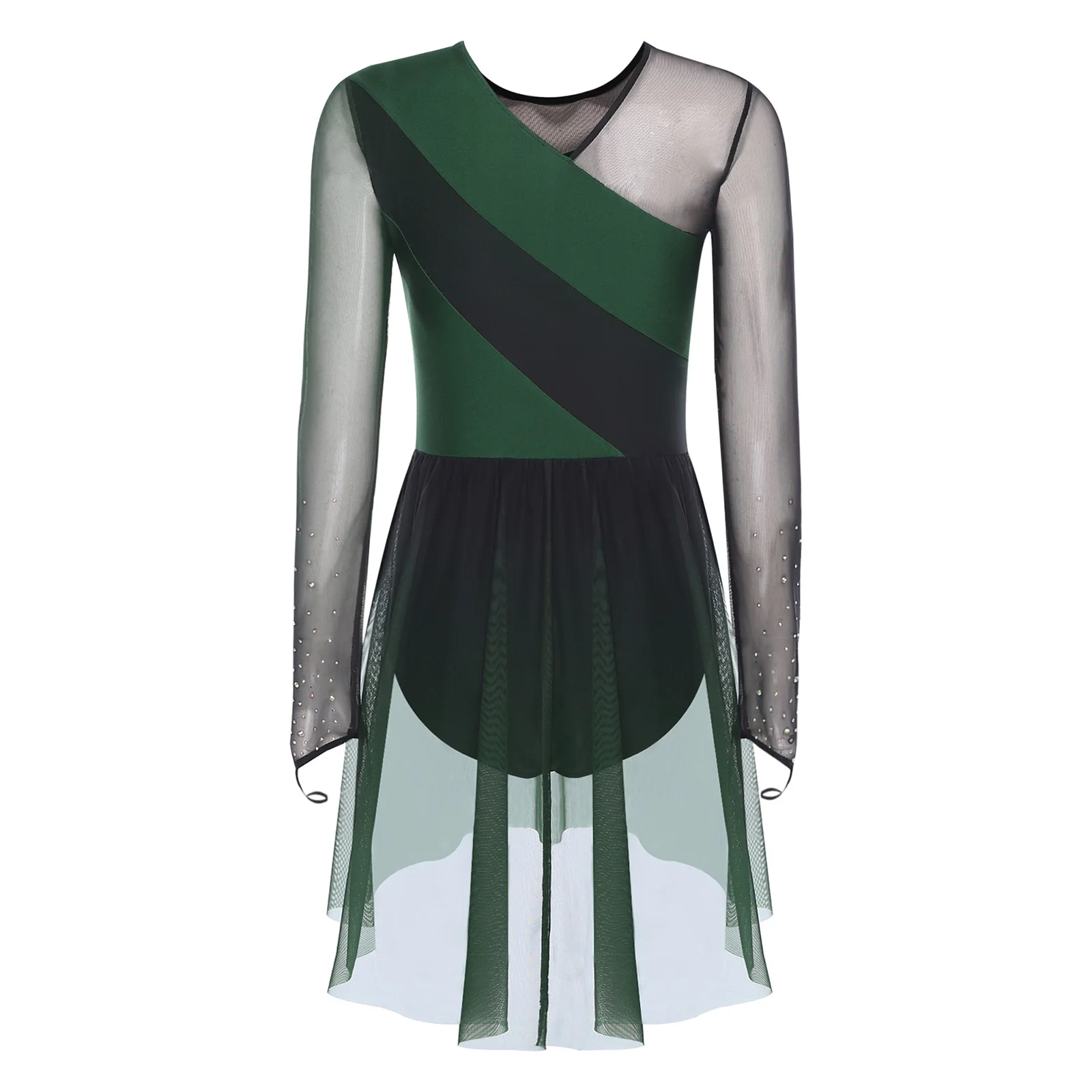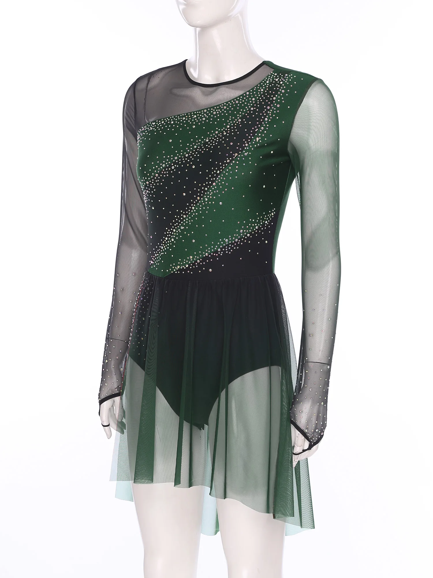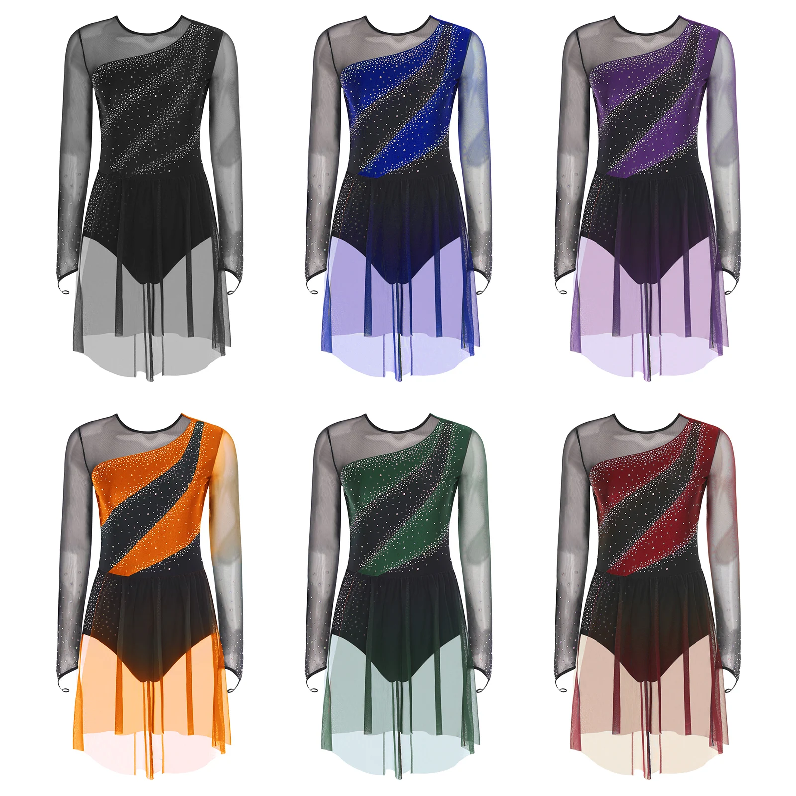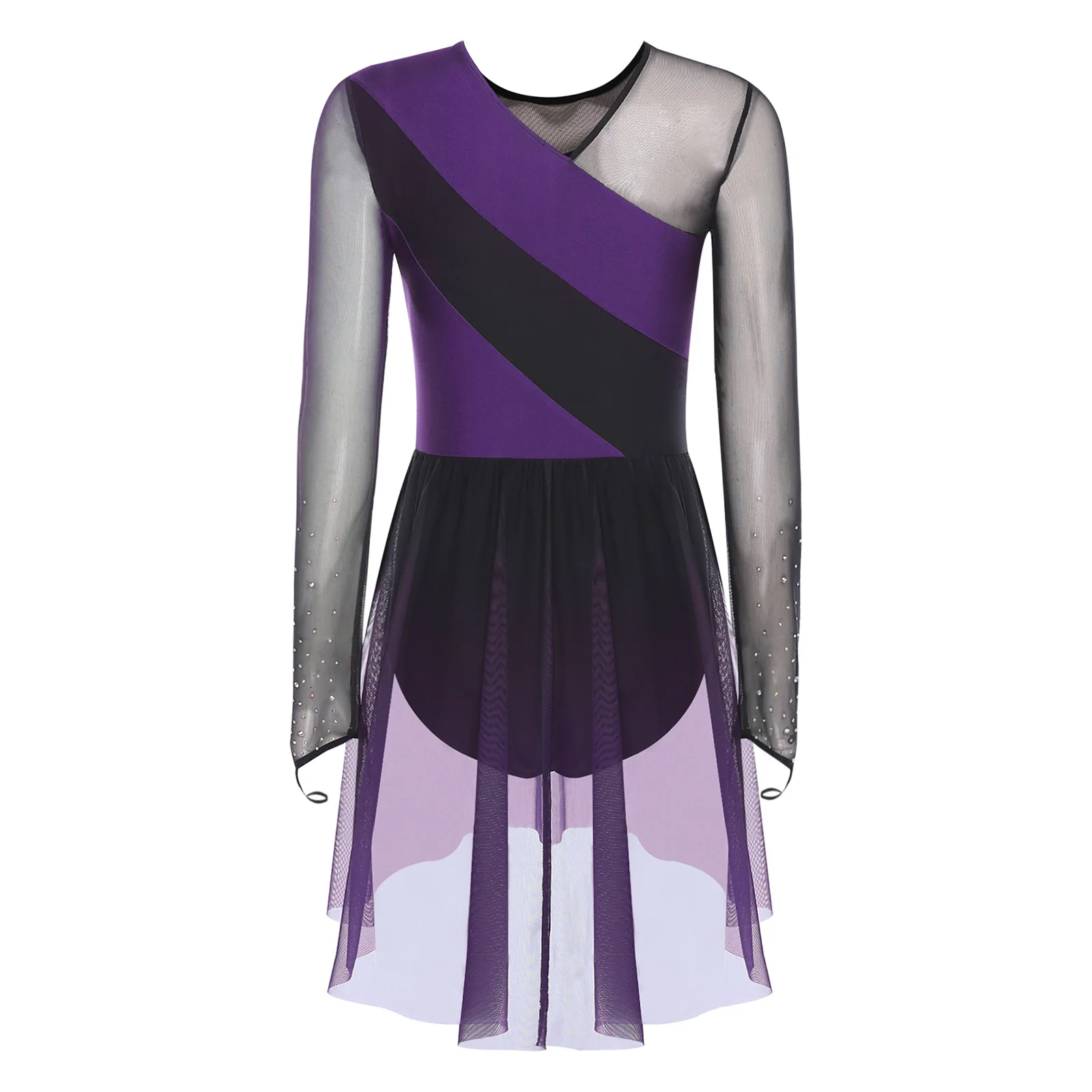 Womens Gymnastics Artistic Figure Skating Costume Shiny Ballet Lyrical Dance Leotard Dress Shiny Rhinestones Gradient Mesh Skirt