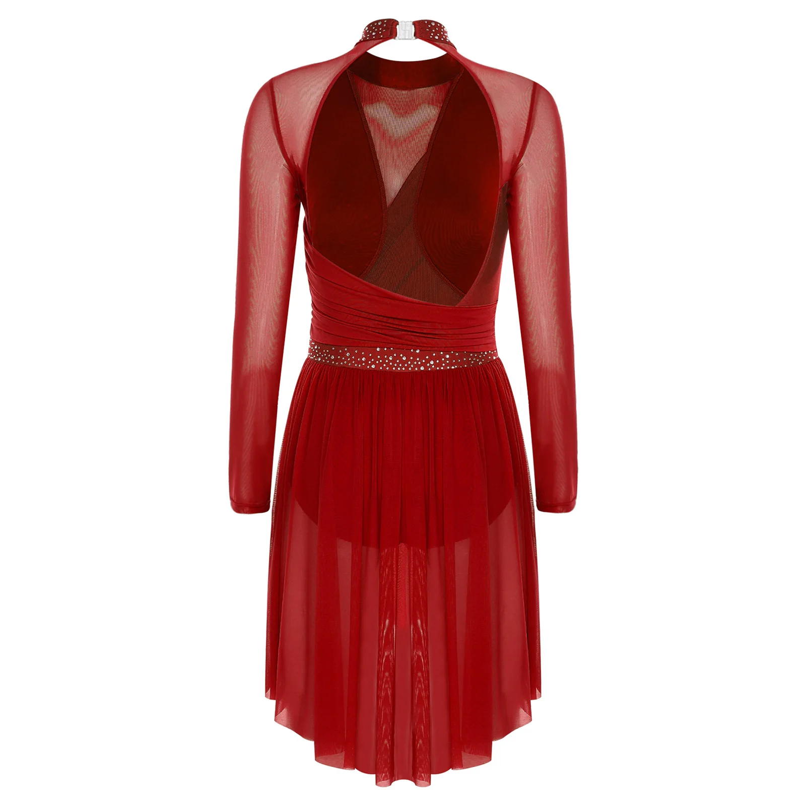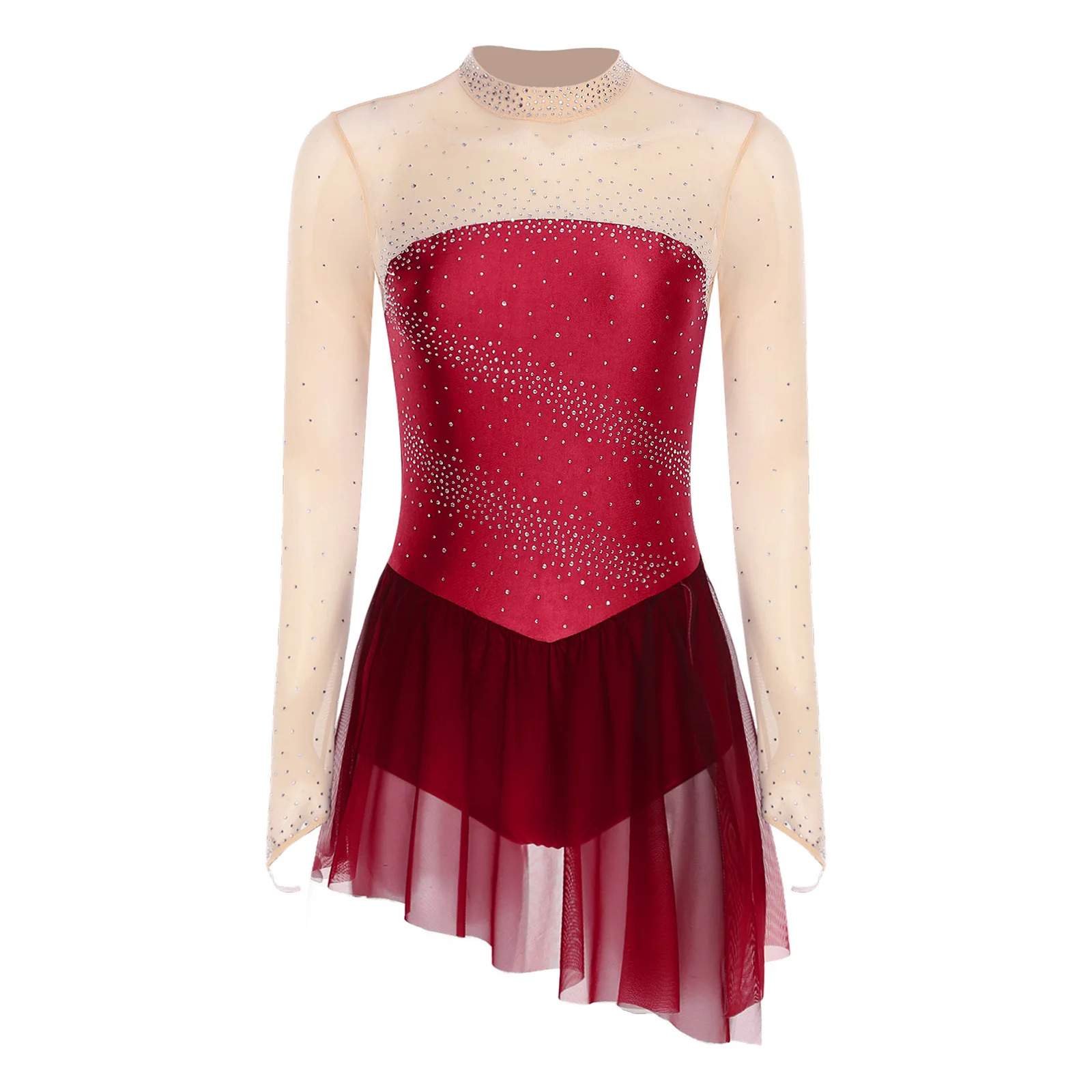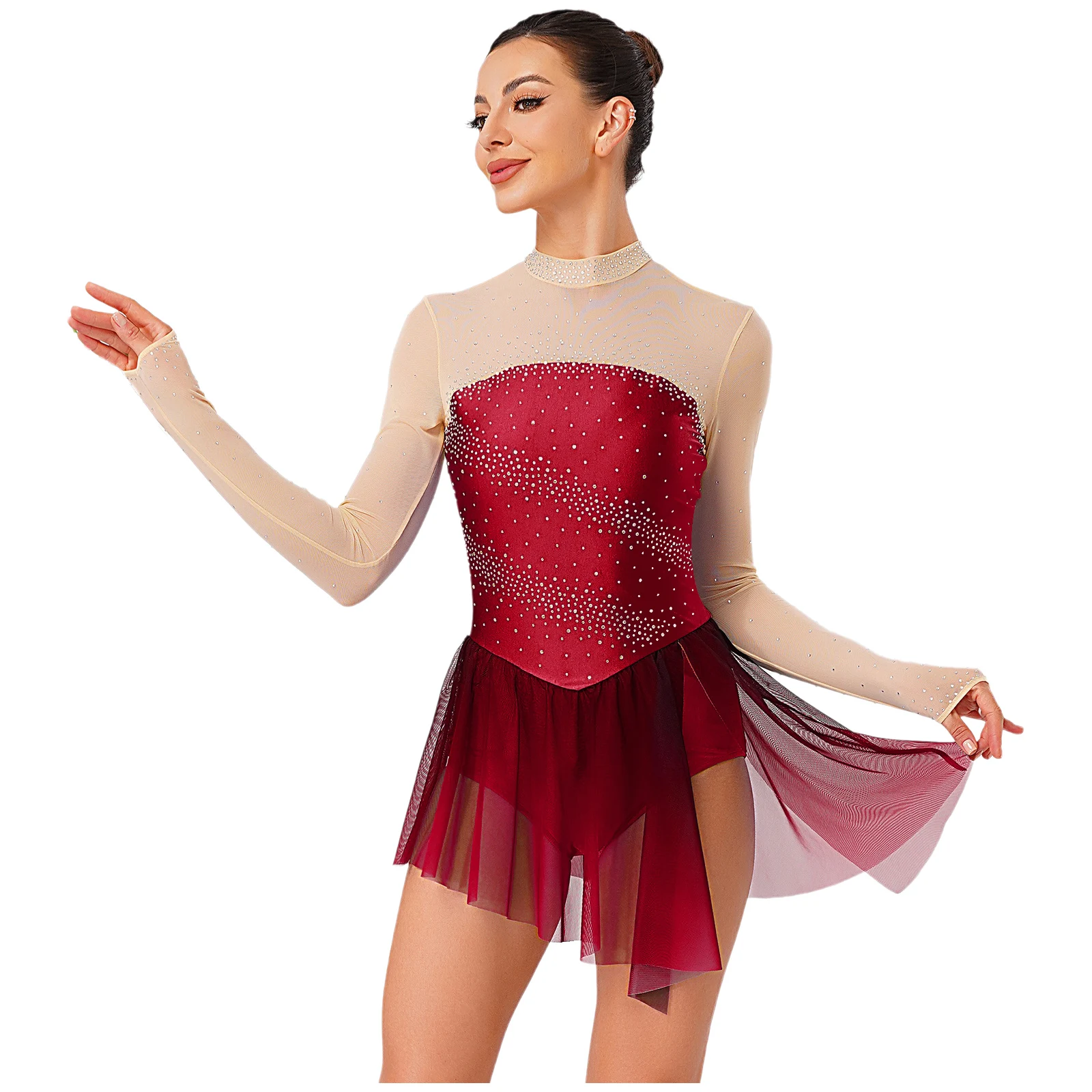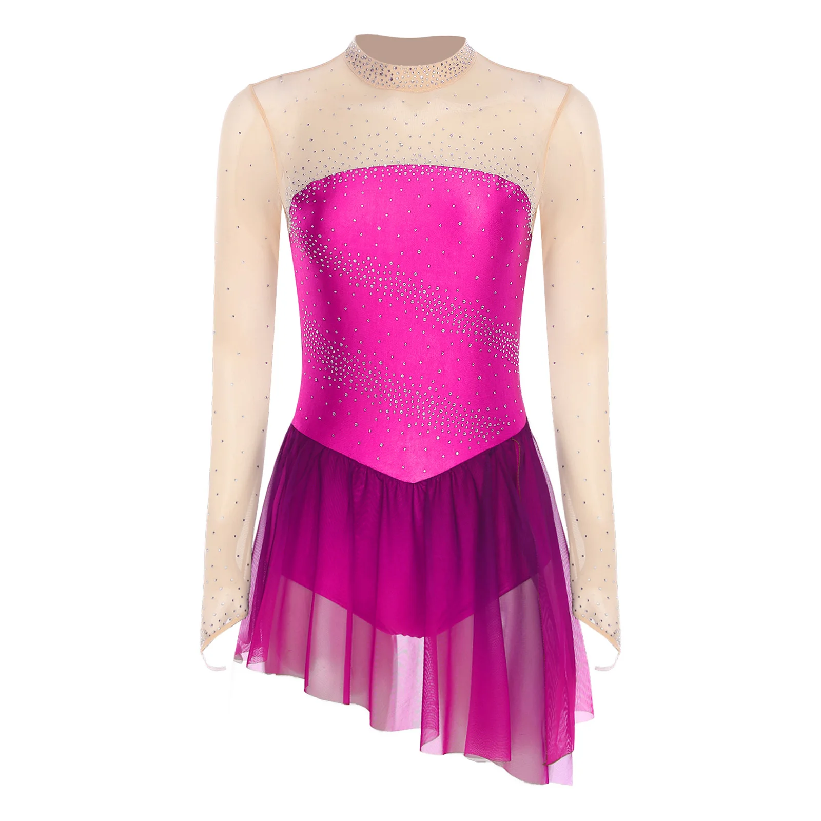 Womens Gymnastics Artistic Figure Skating Performance Costume Ballet Lyrical Dance Dress Shiny Rhinestones Ruched Leotard Dress