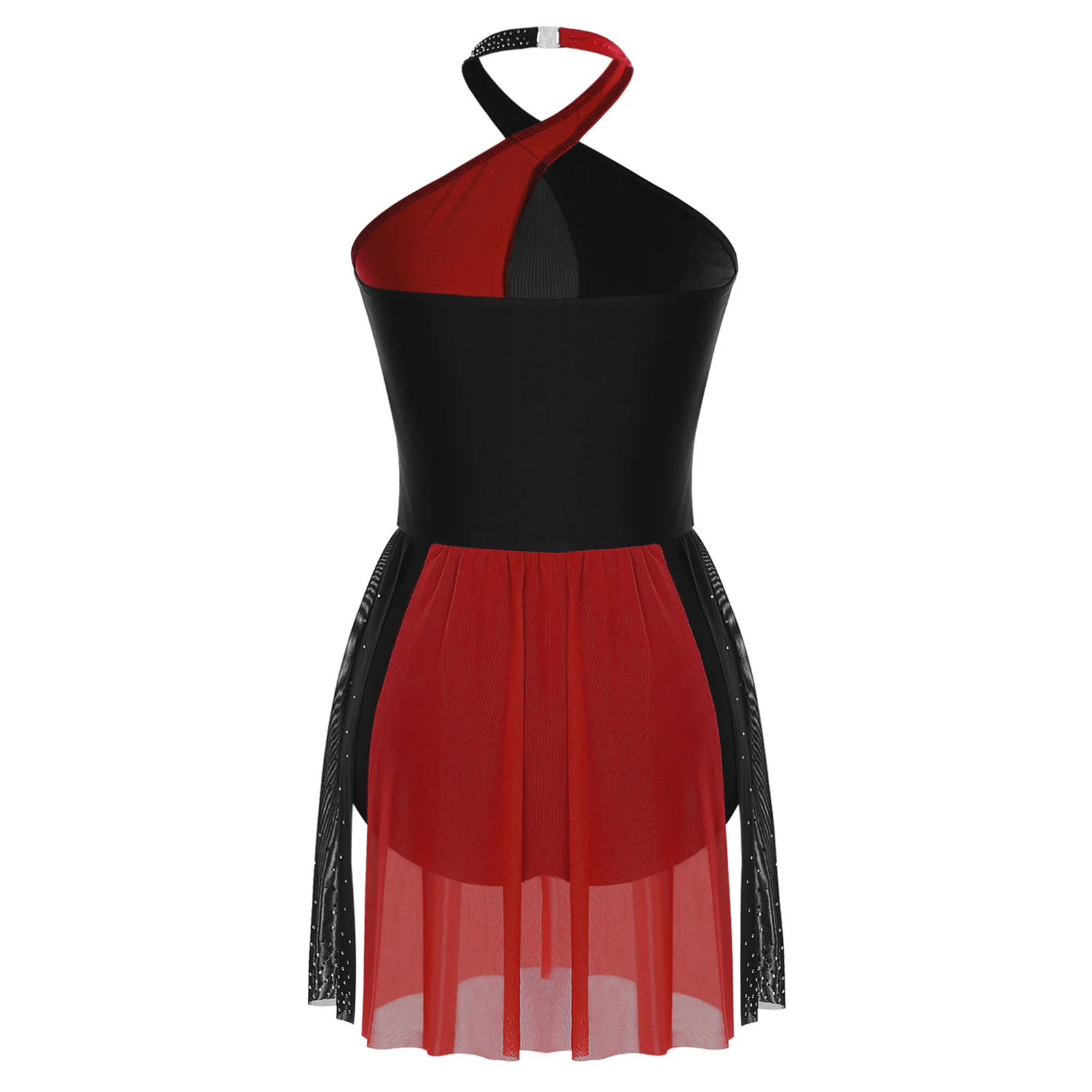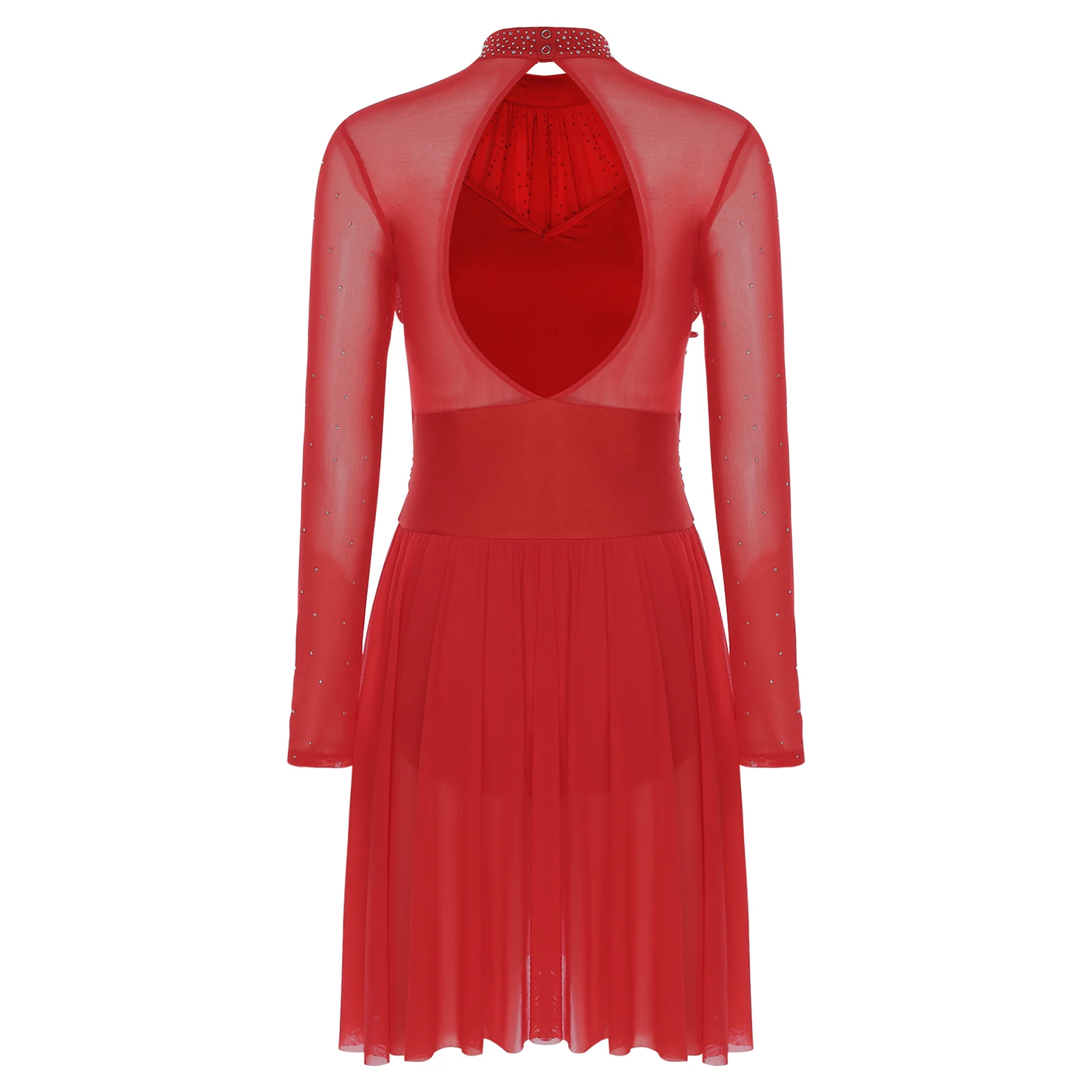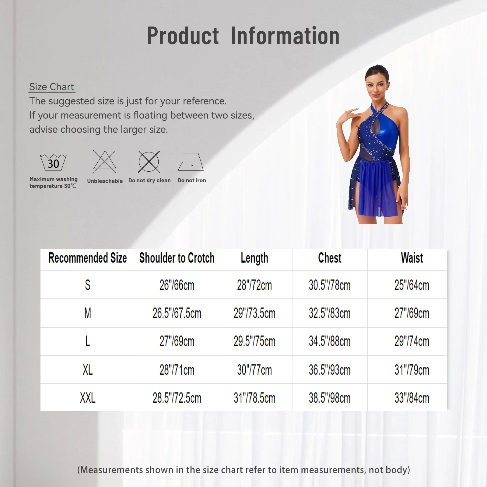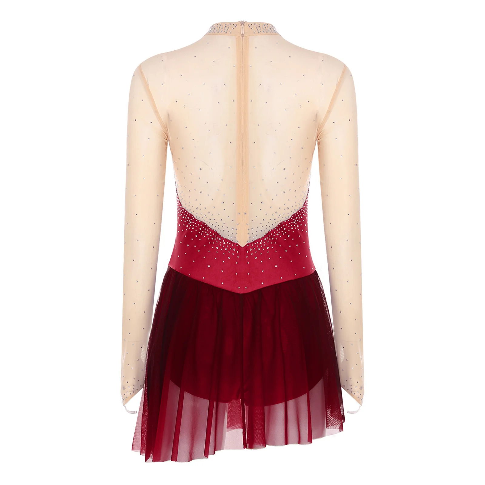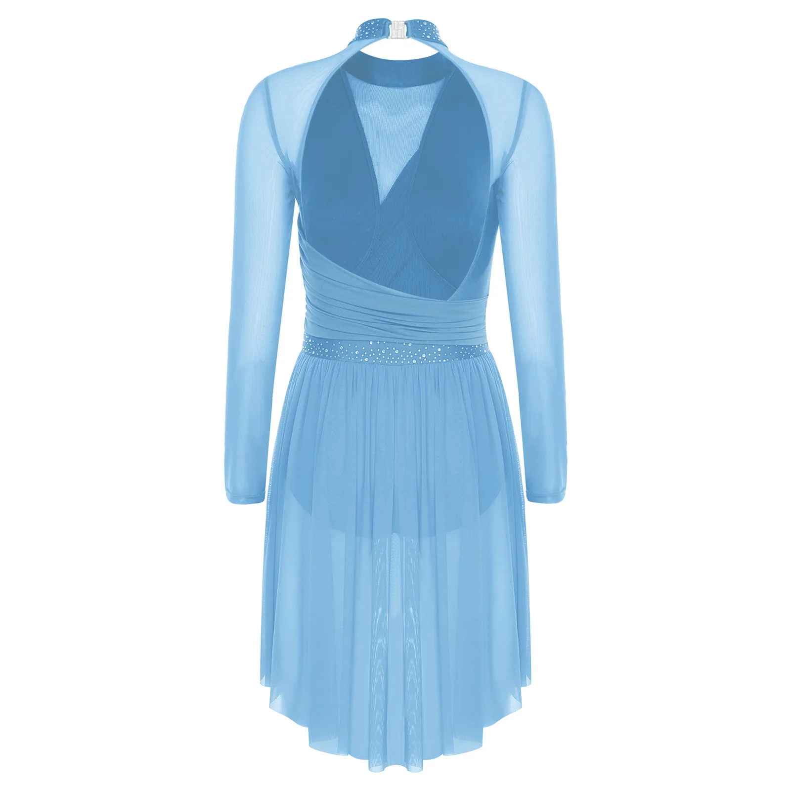 Womens Gymnastics Artistic Figure Skating Performance Costume Ballet Lyrical Dance Dress Shiny Rhinestones Ruched Leotard Dress