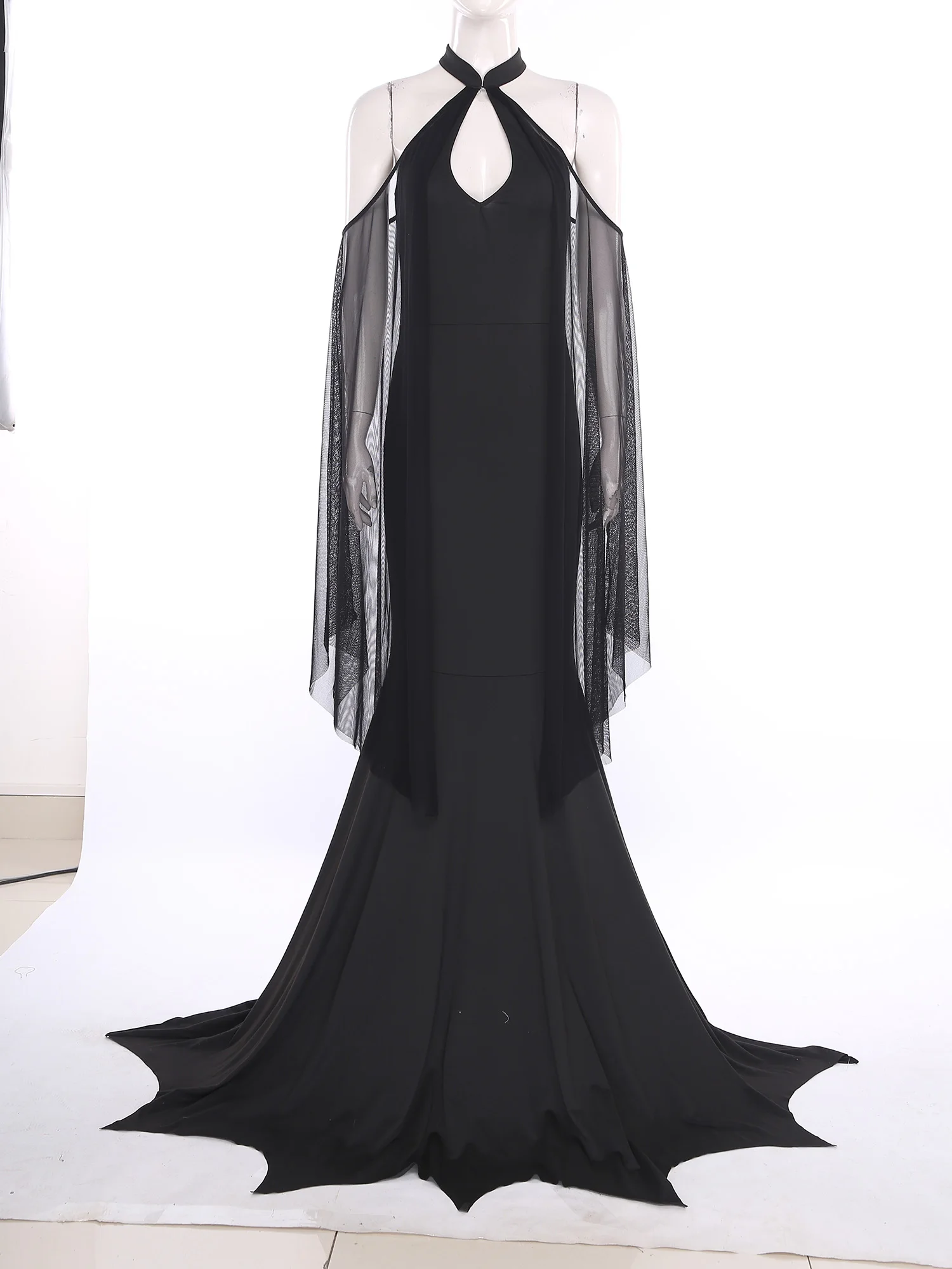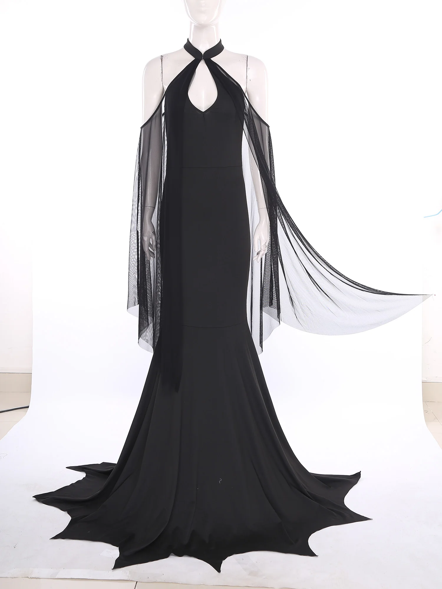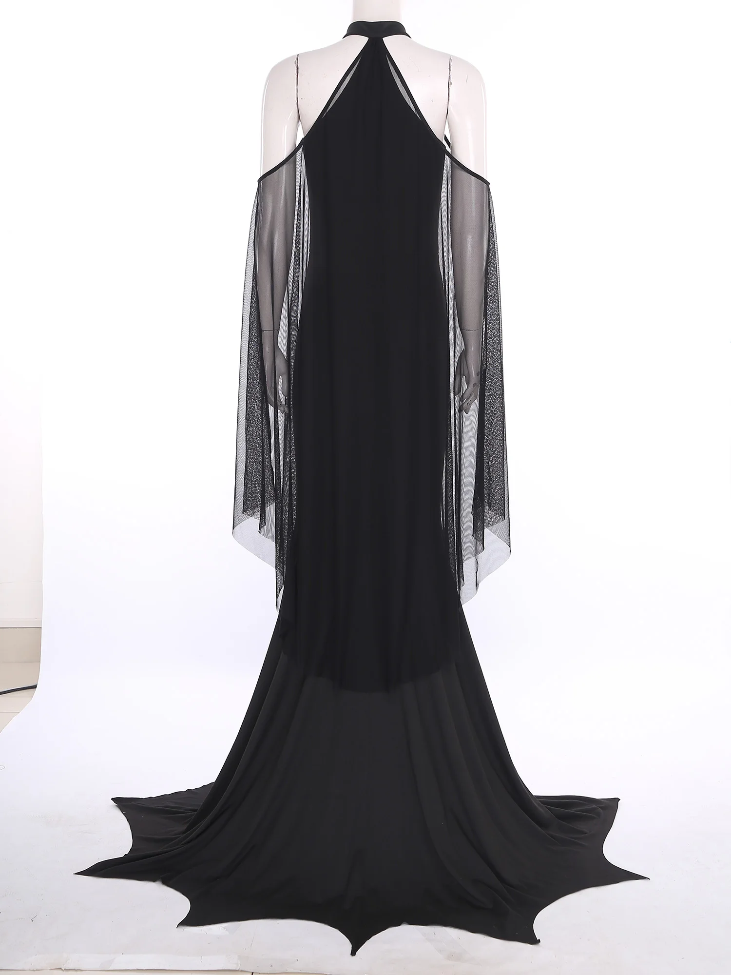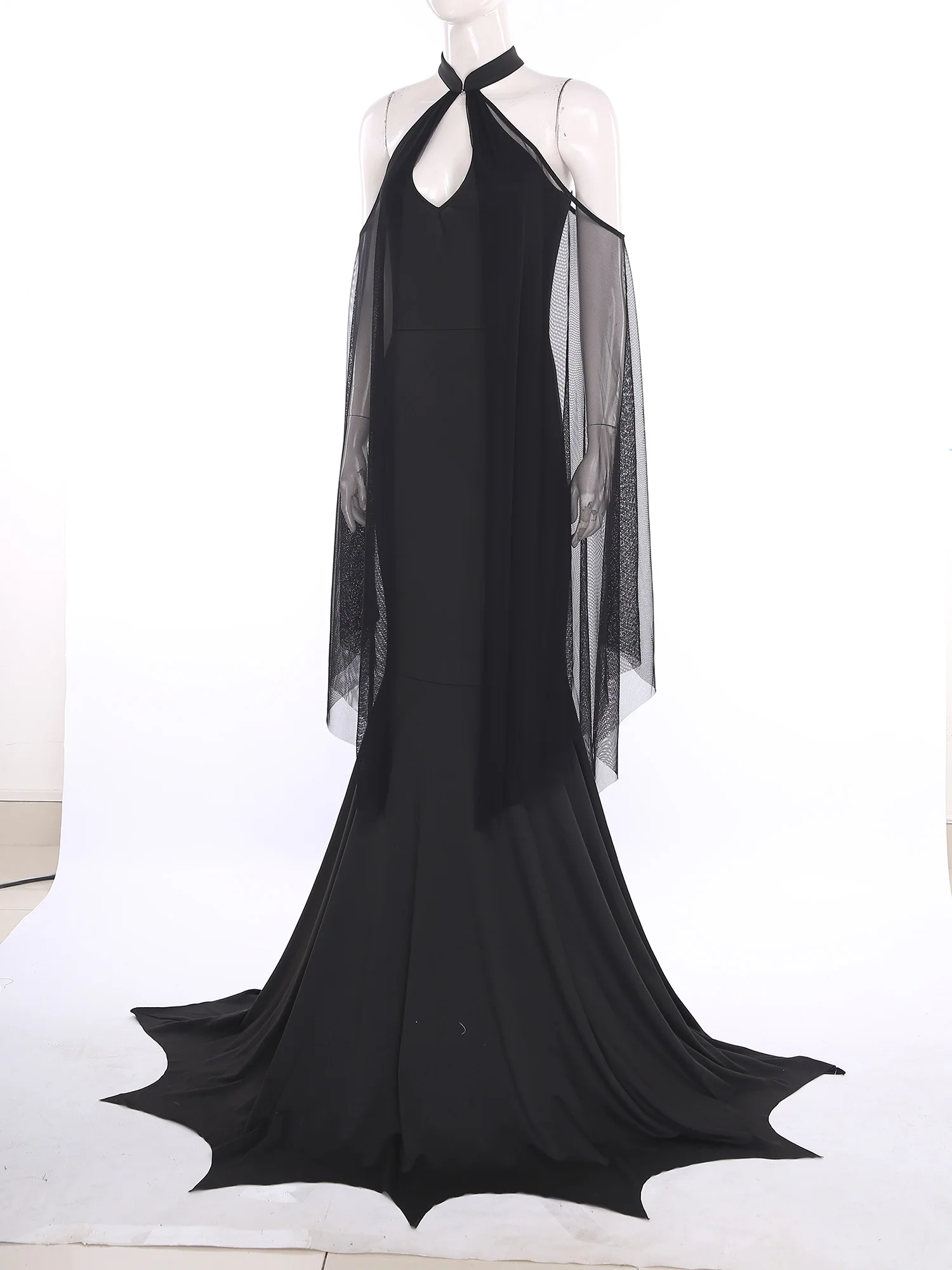 Womens Halloween Vampire Witch Long Dress Halter Keyhole Hollow-out Mesh Cape Jagged Hem Maxi Dress Gothic Mermaid Cosplay Dress