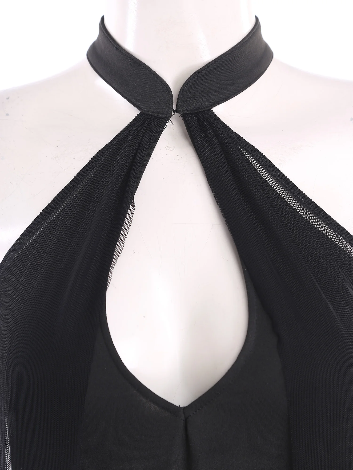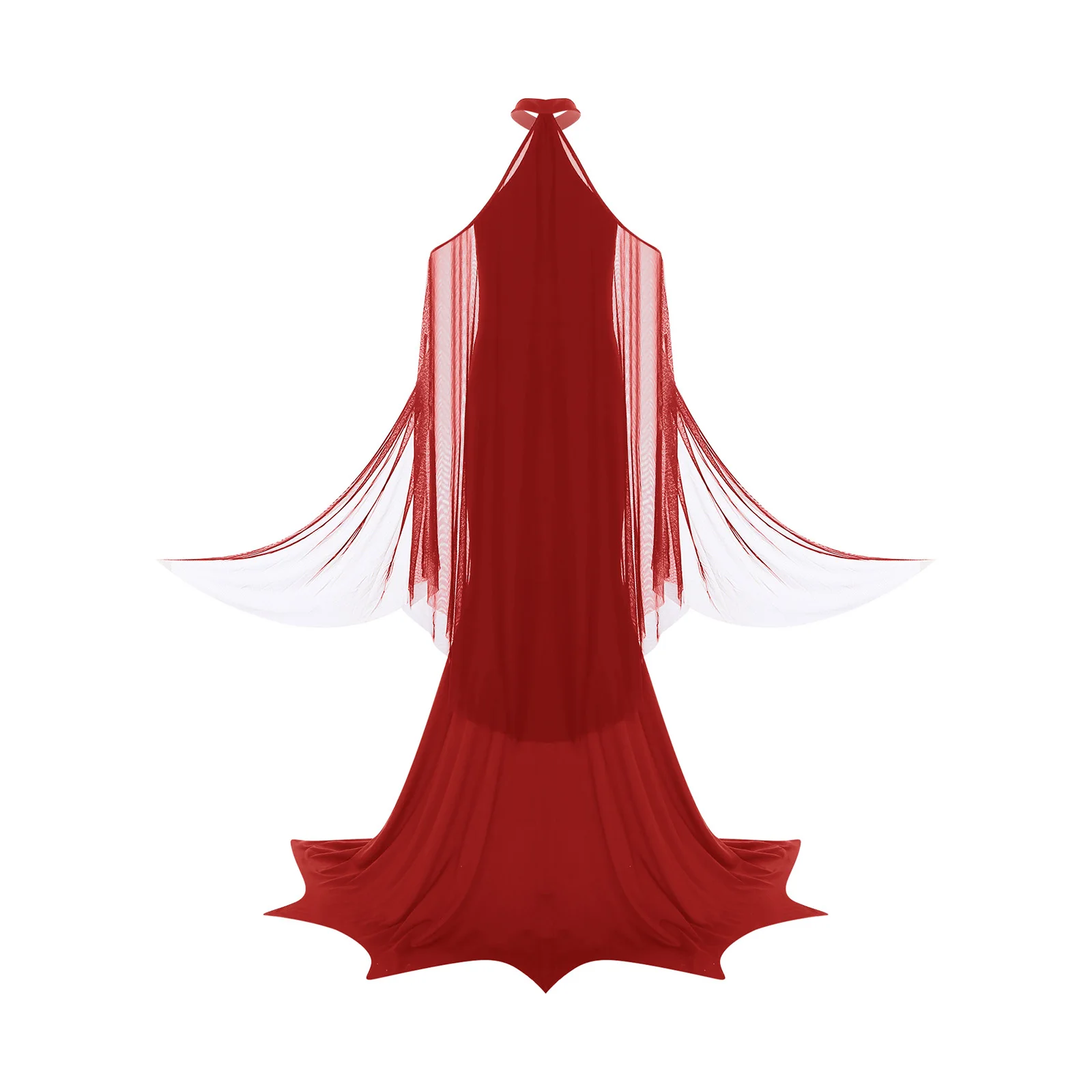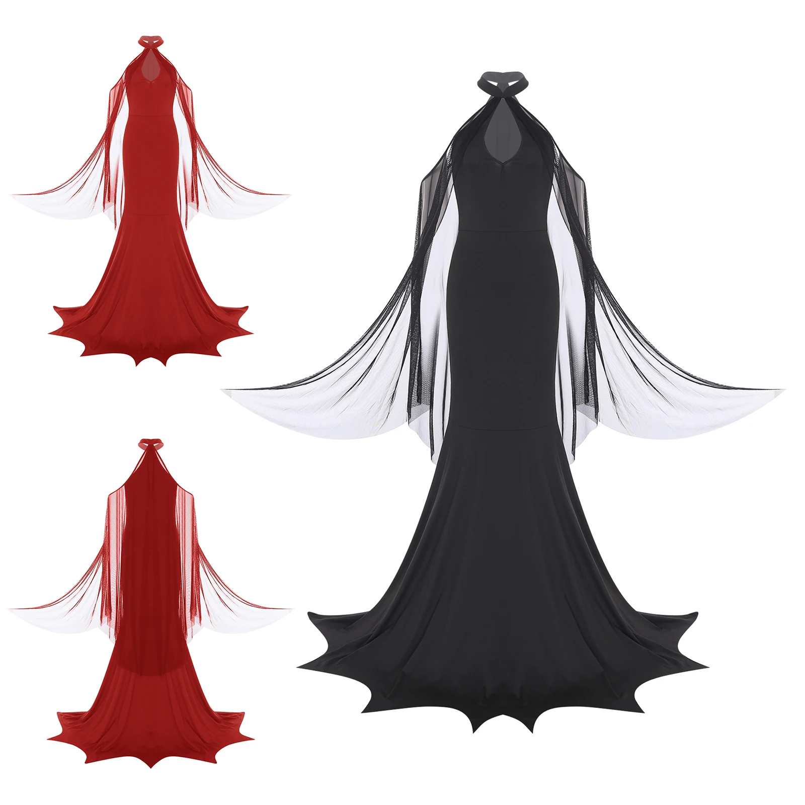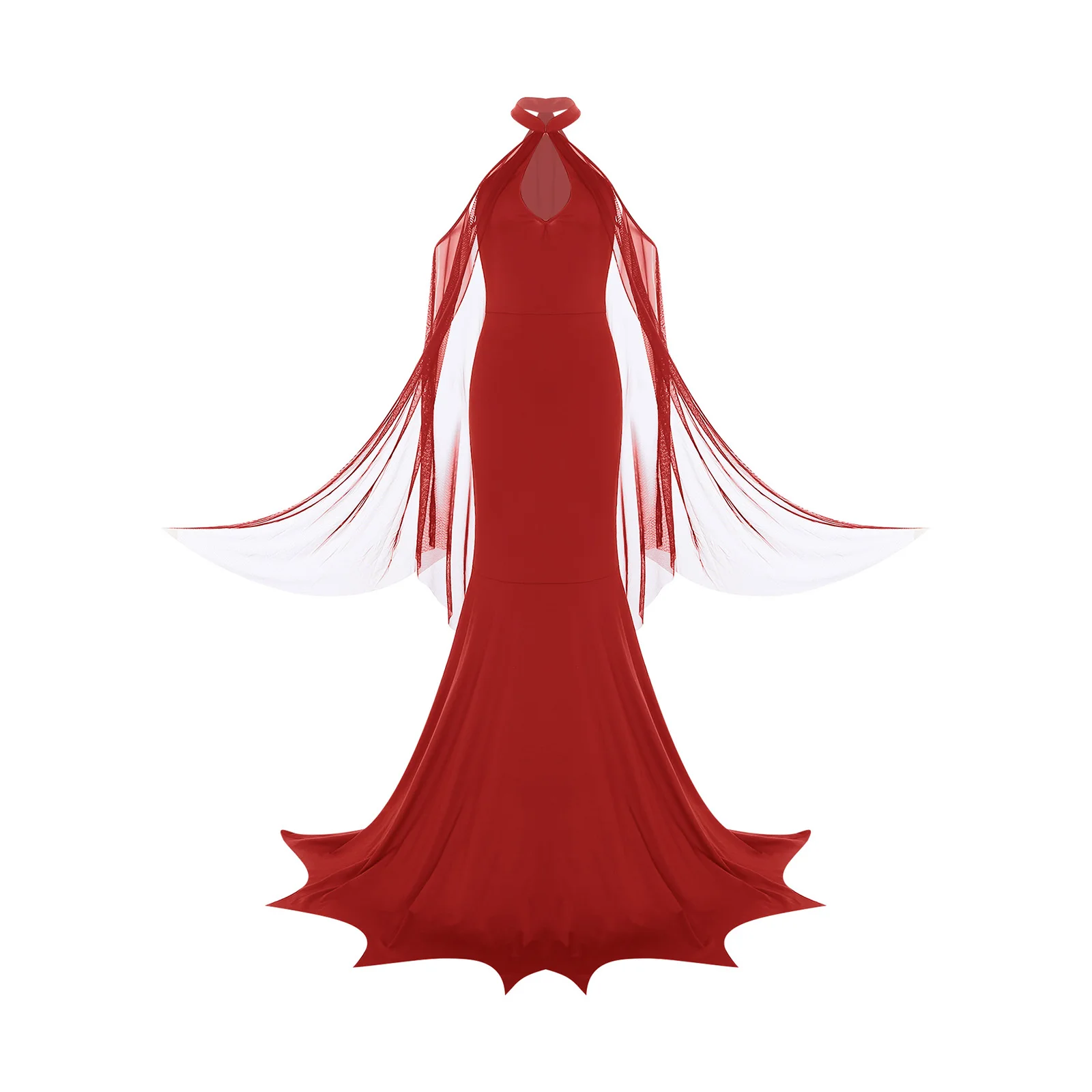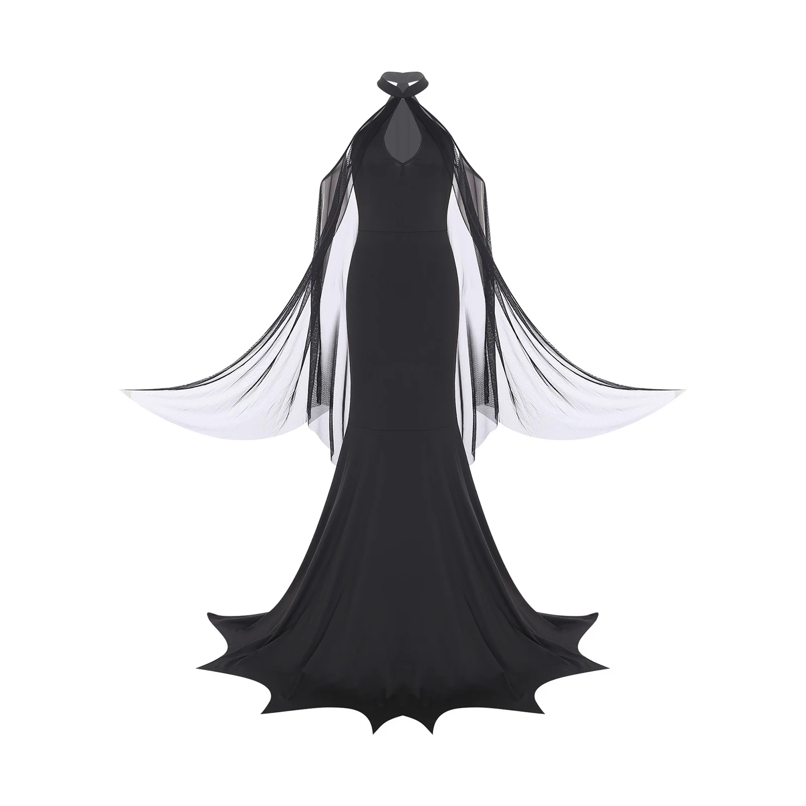 Womens Halloween Vampire Witch Long Dress Halter Keyhole Hollow-out Mesh Cape Jagged Hem Maxi Dress Gothic Mermaid Cosplay Dress