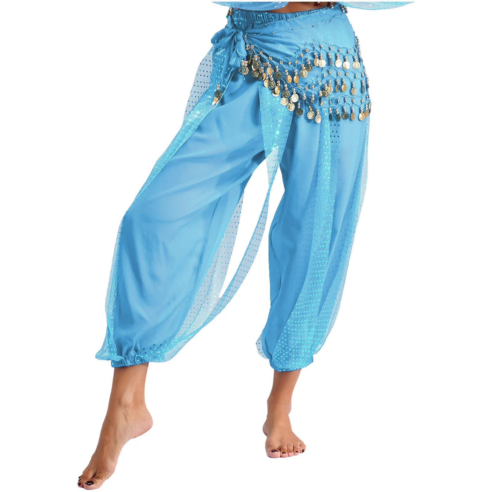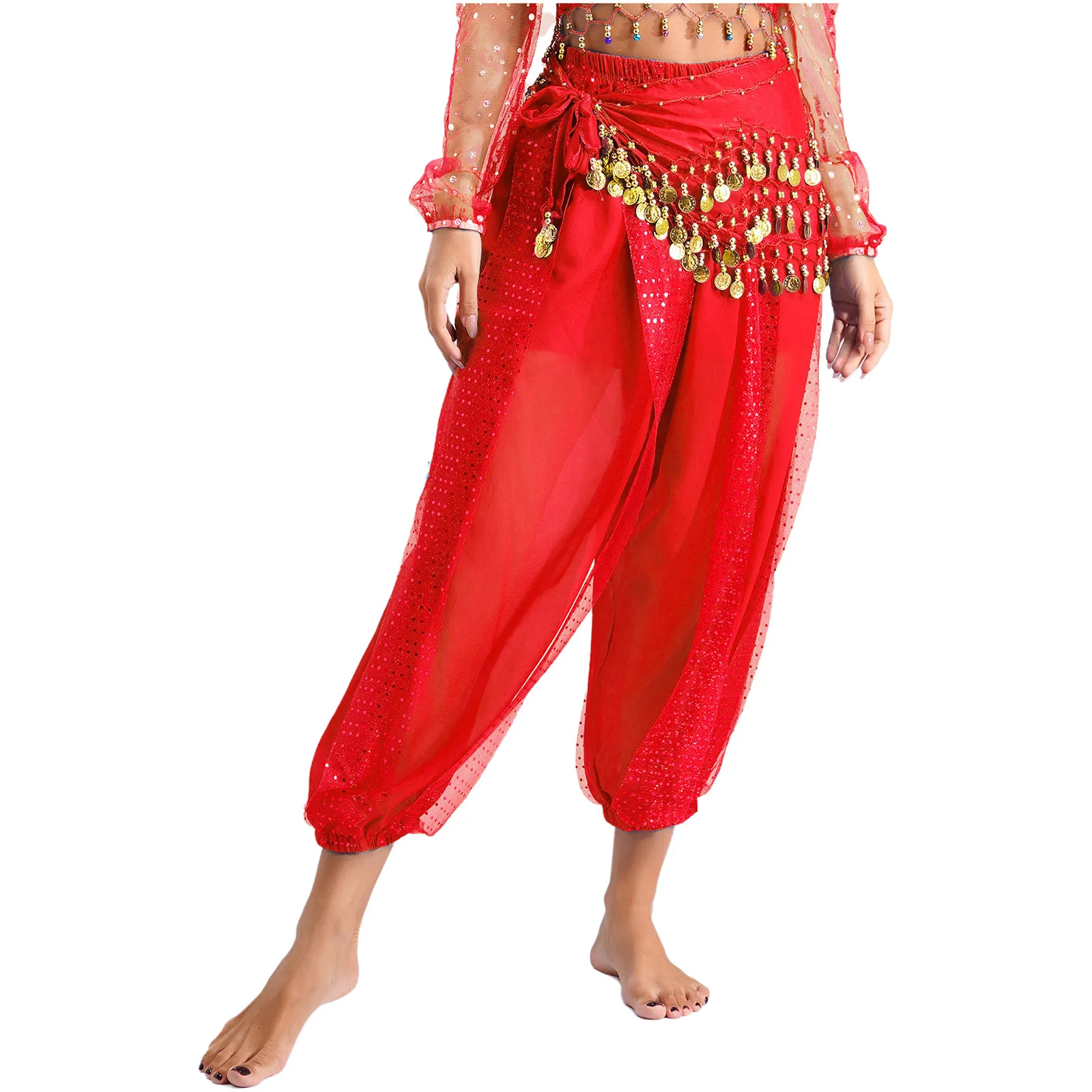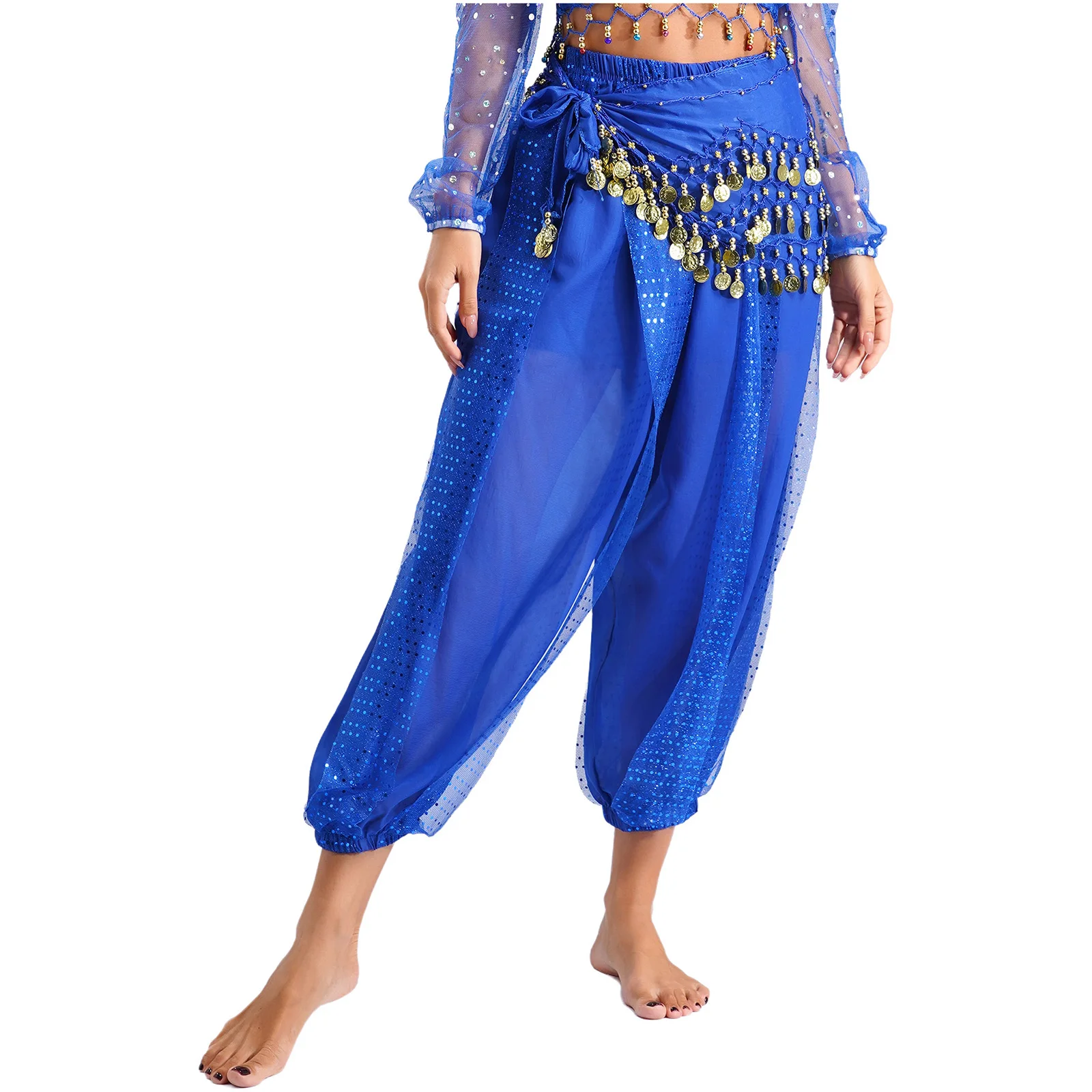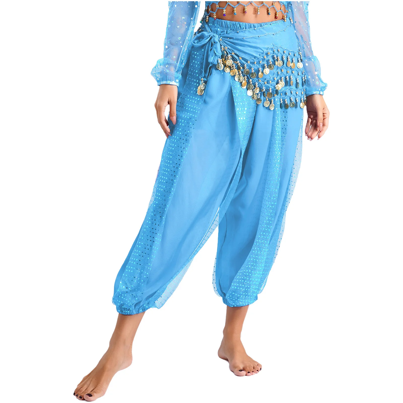 Womens Indian Belly Dance Costume Sequined Layer Bloomers Harem Belly Dance Pants with Lace-up Hip Scarf And Lace-up Hip Scarf
