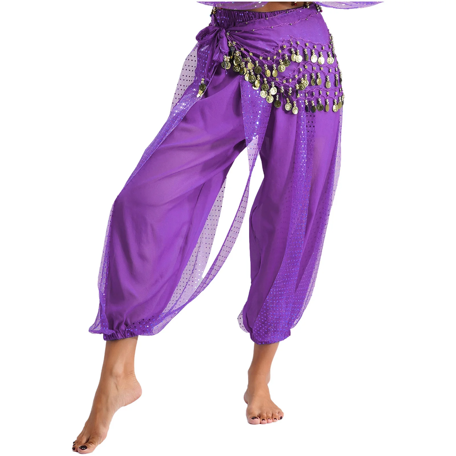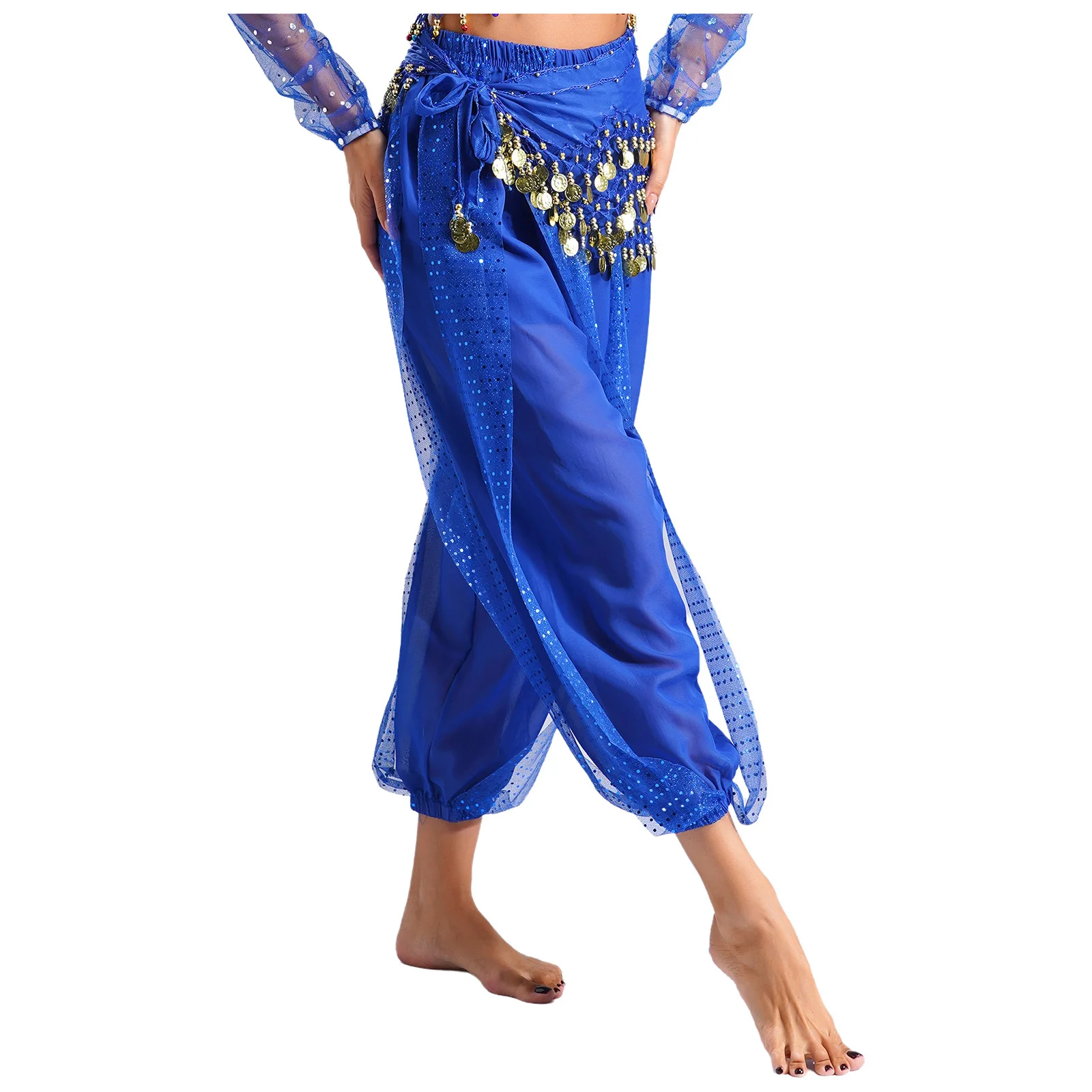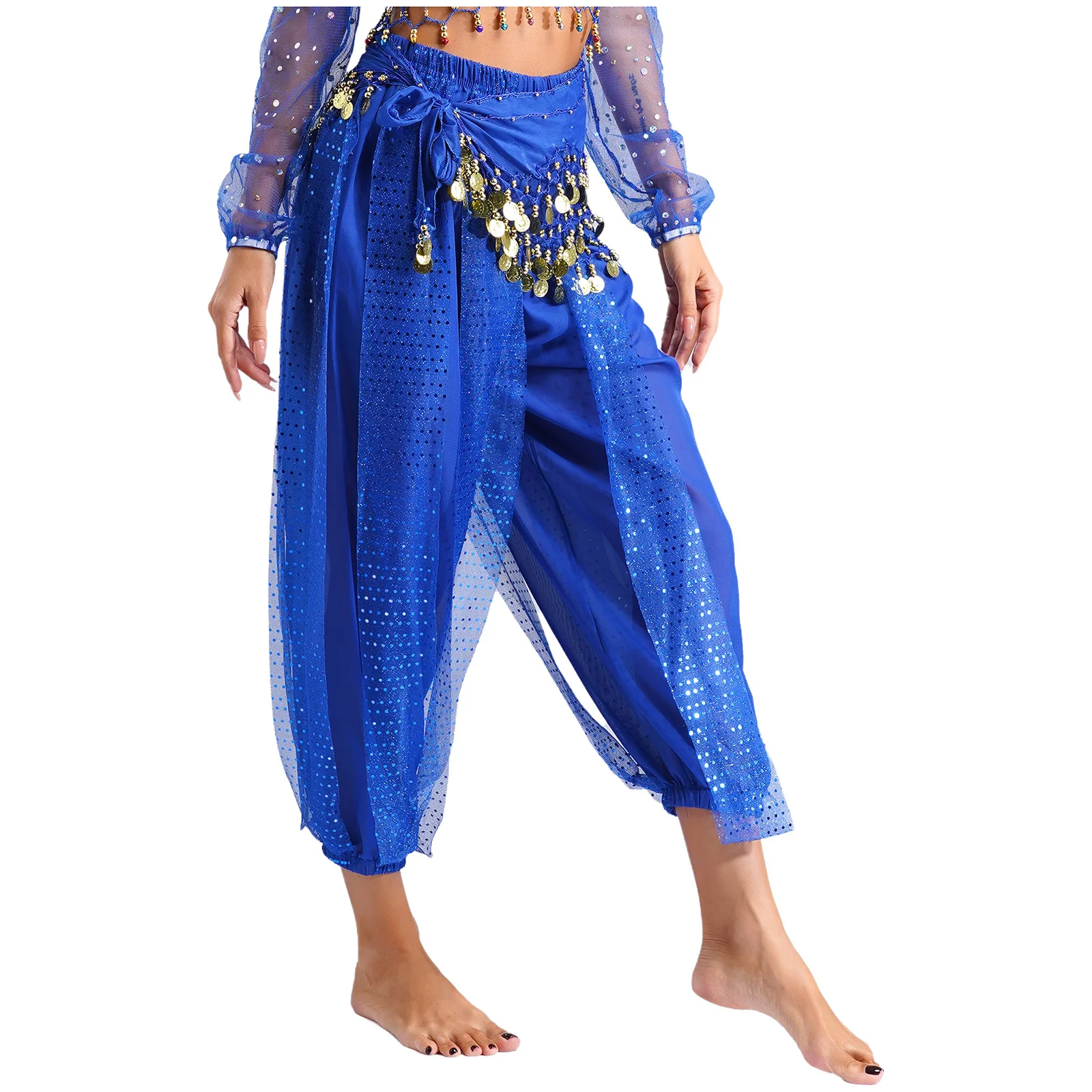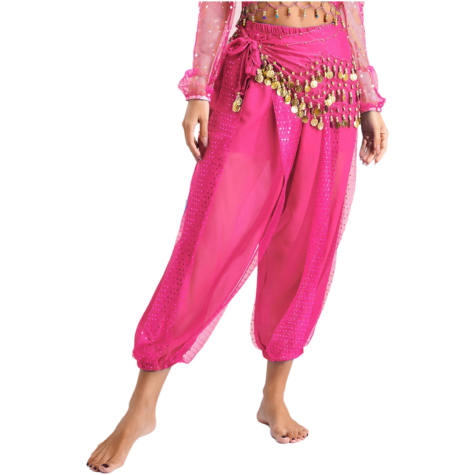 Womens Indian Belly Dance Costume Sequined Layer Bloomers Harem Belly Dance Pants with Lace-up Hip Scarf And Lace-up Hip Scarf