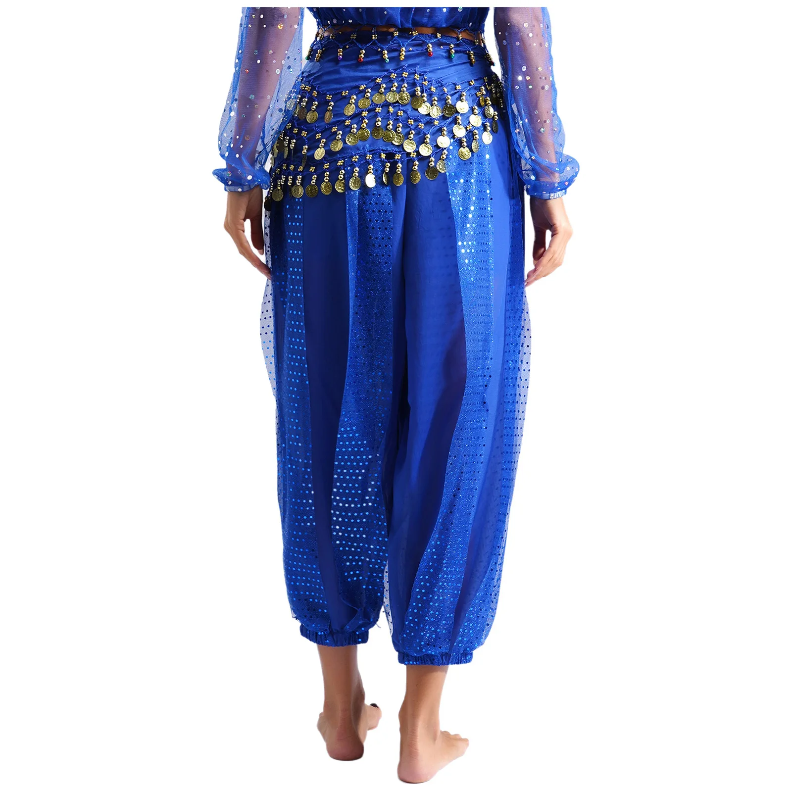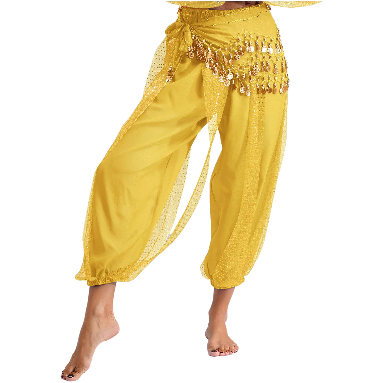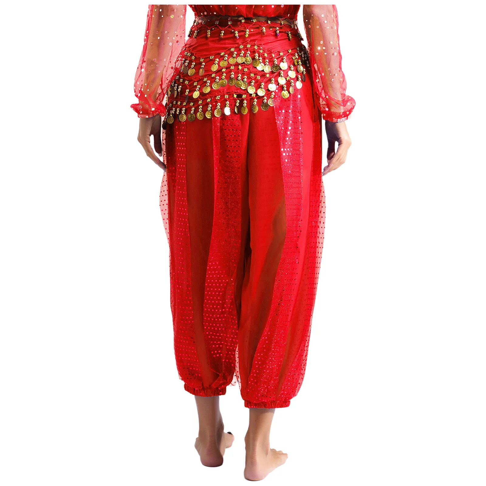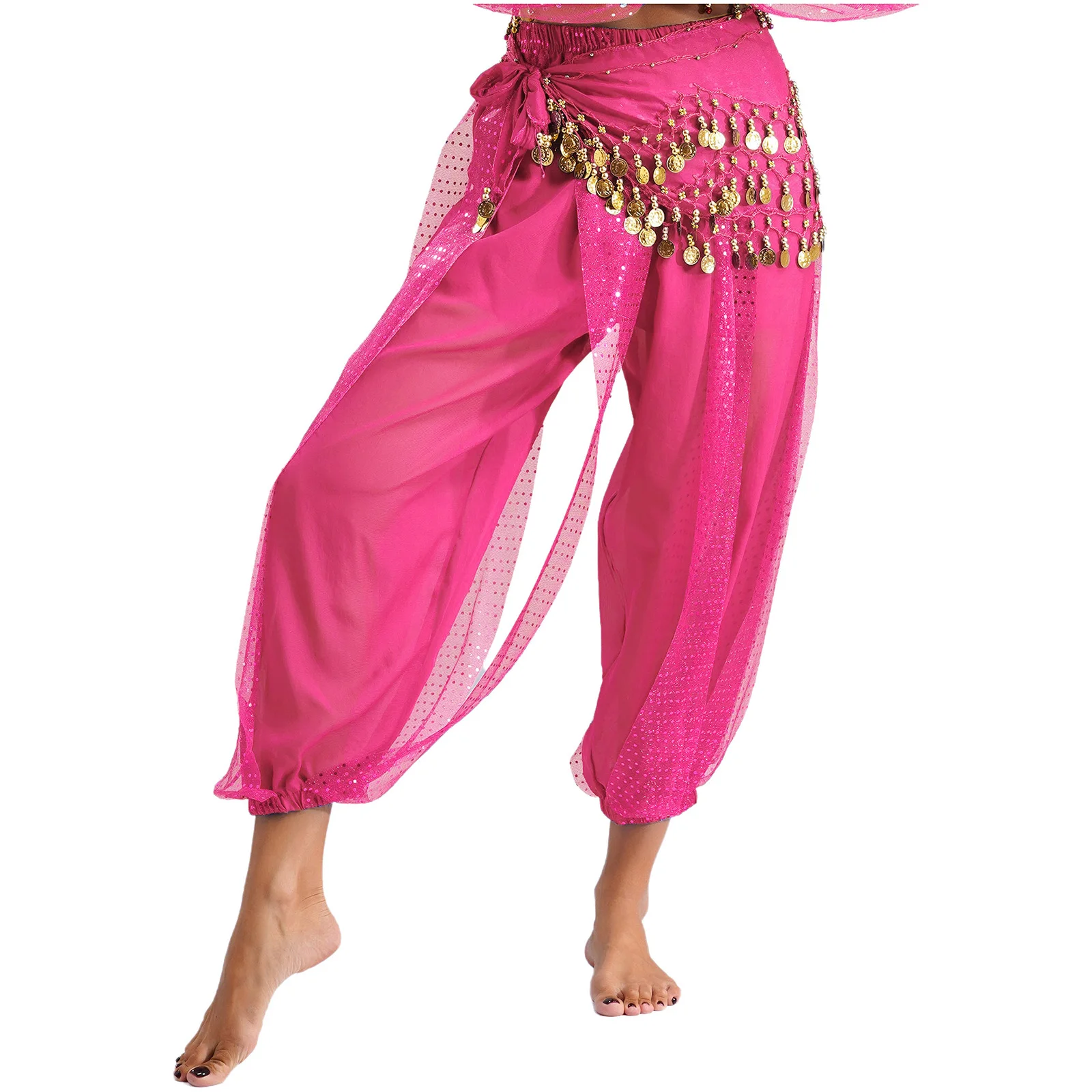 Womens Indian Belly Dance Costume Sequined Layer Bloomers Harem Belly Dance Pants with Lace-up Hip Scarf And Lace-up Hip Scarf