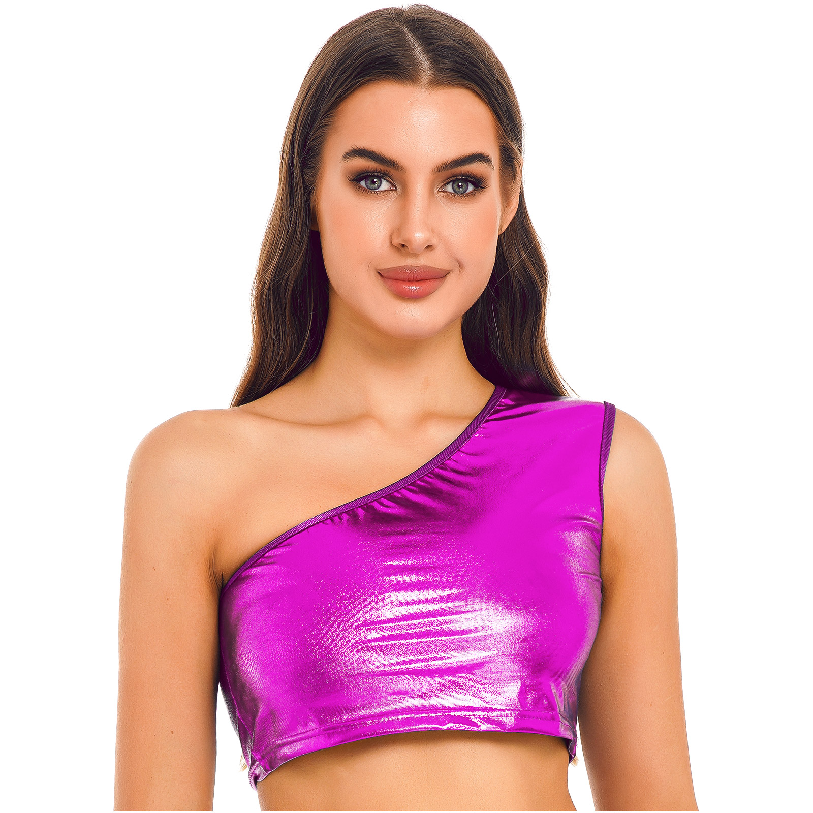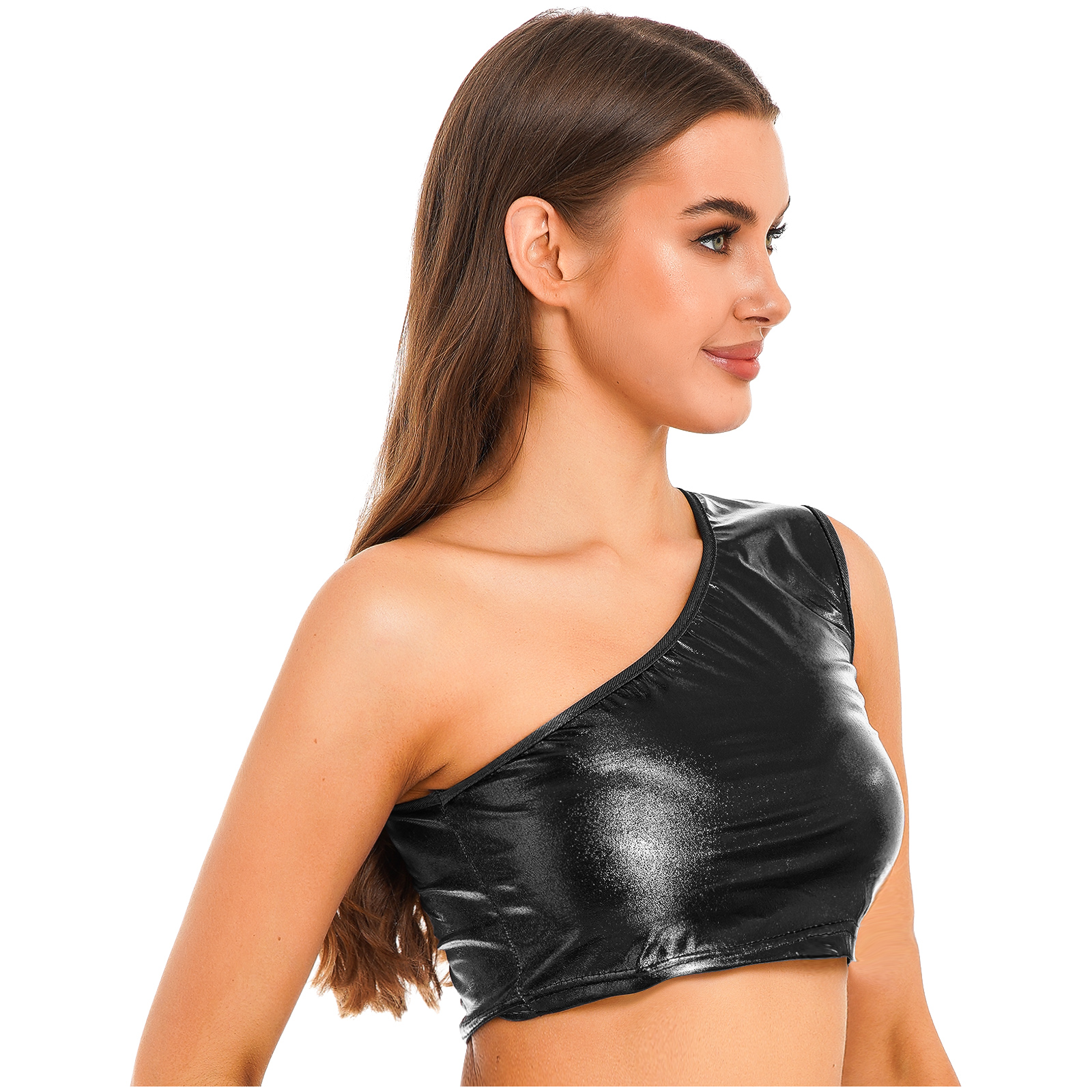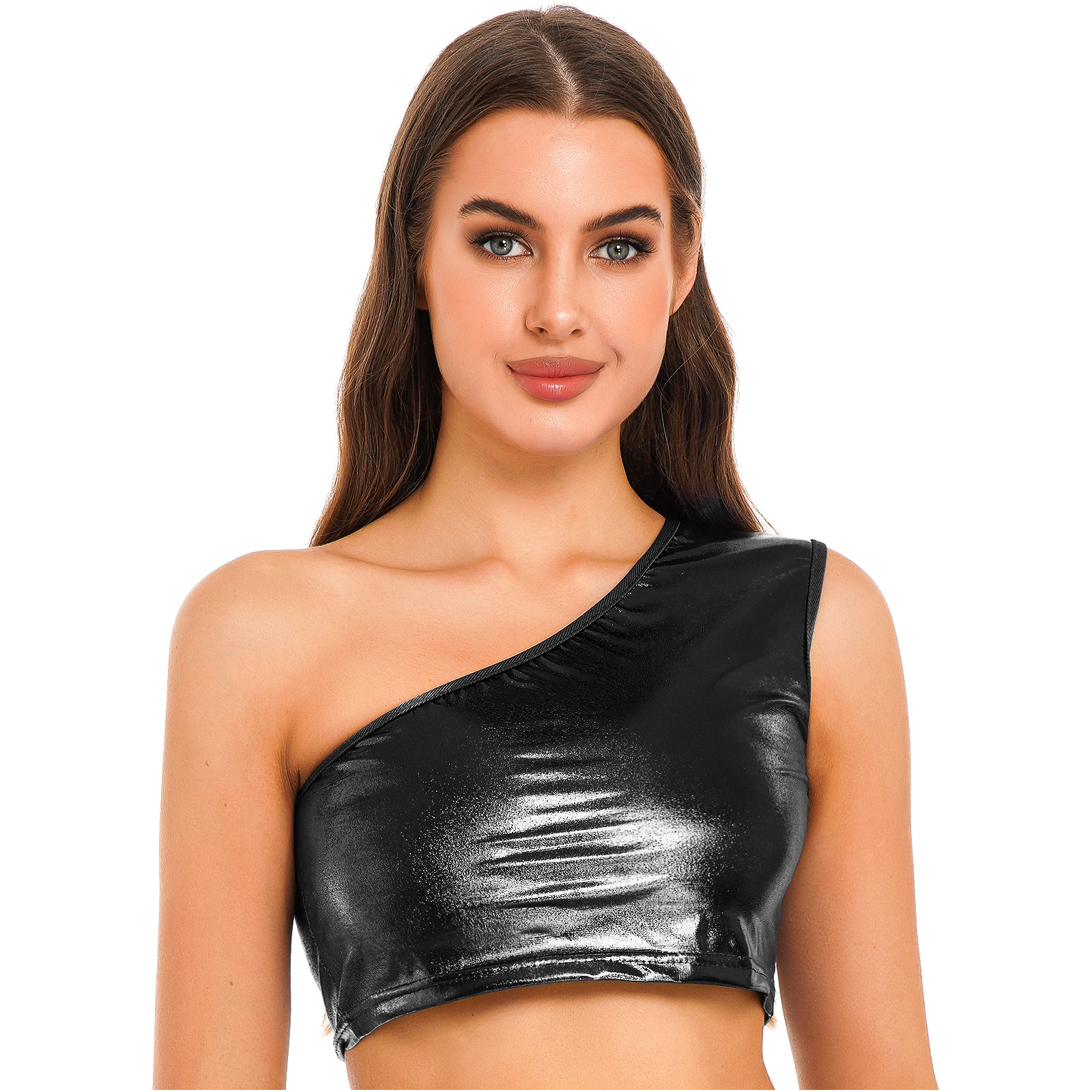 Sleeveless crop top, one shoulder design, metallic shiny surface, makes you eye-catching in the crowd.