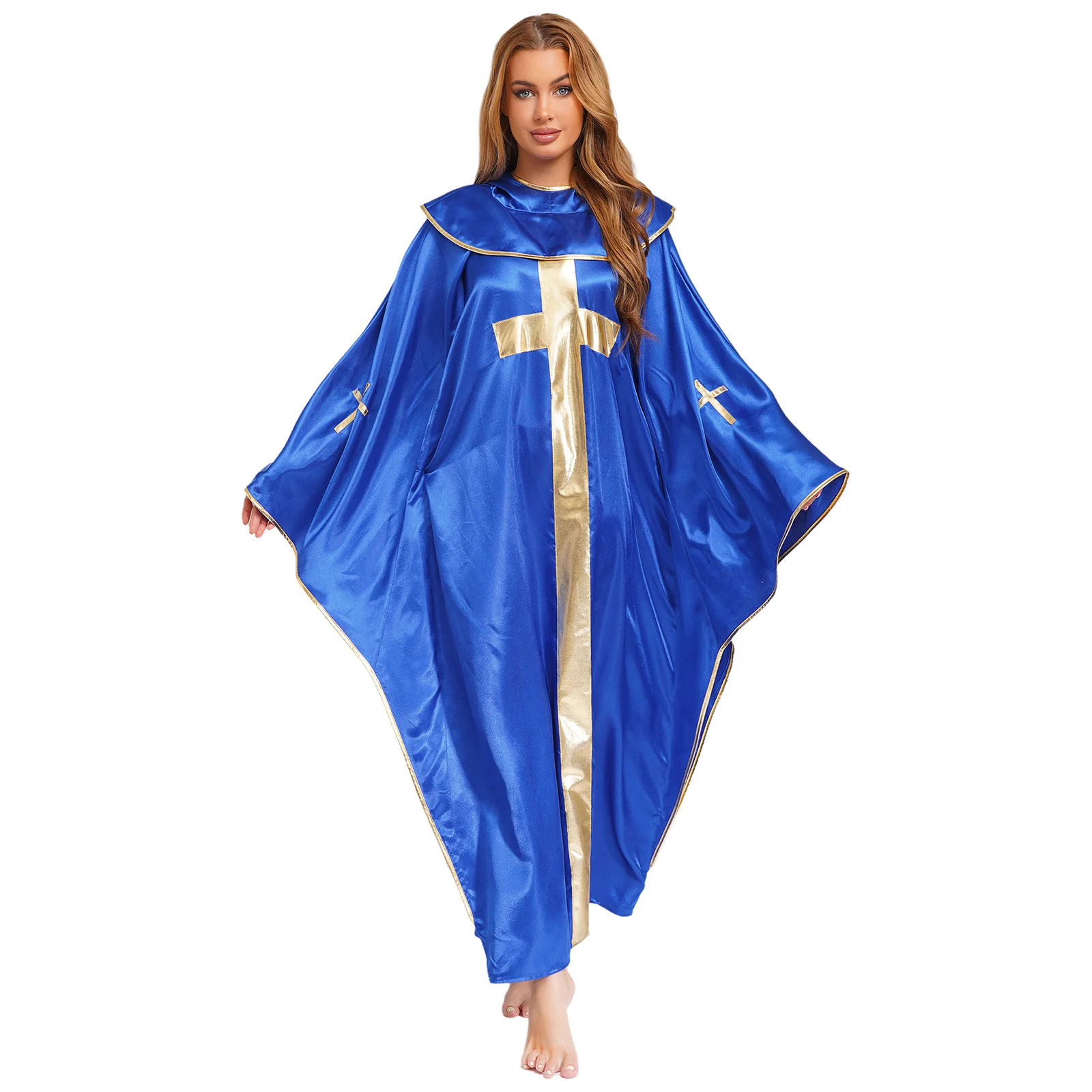 The metallic shiny trim and gold cross on the front add a touch of opulence and create a visually striking look, in line with the current trend of bold and eye-catching costumes.