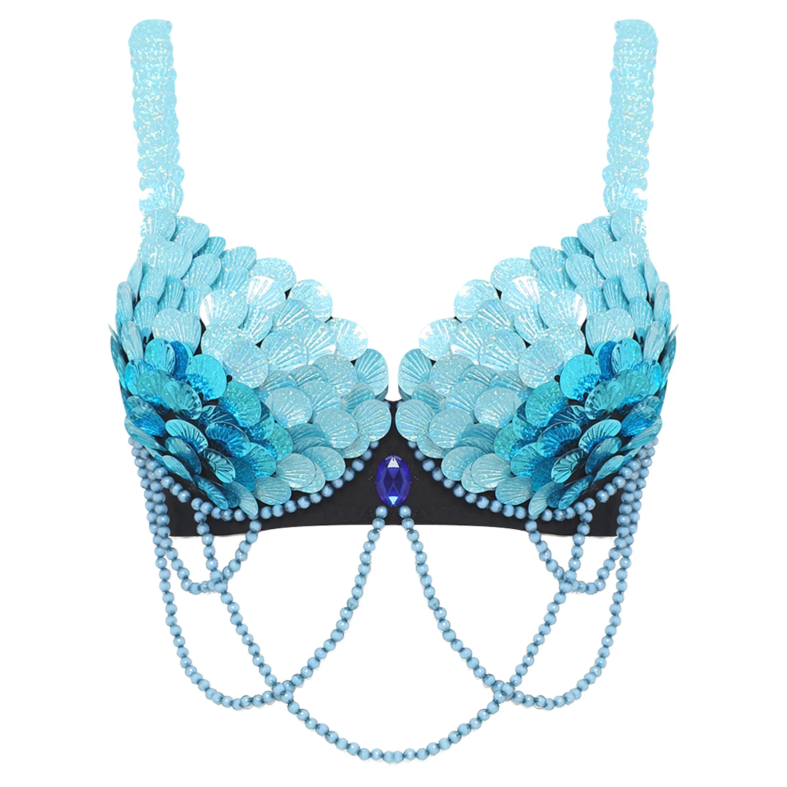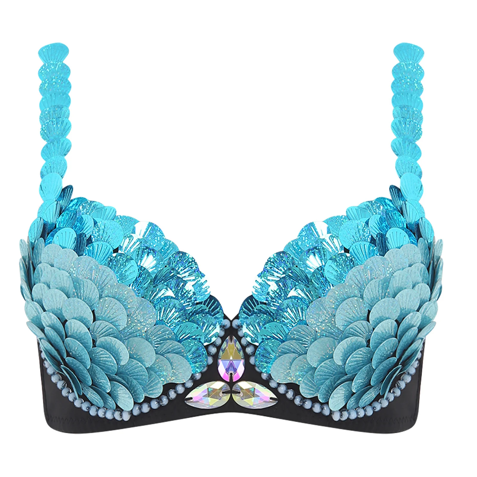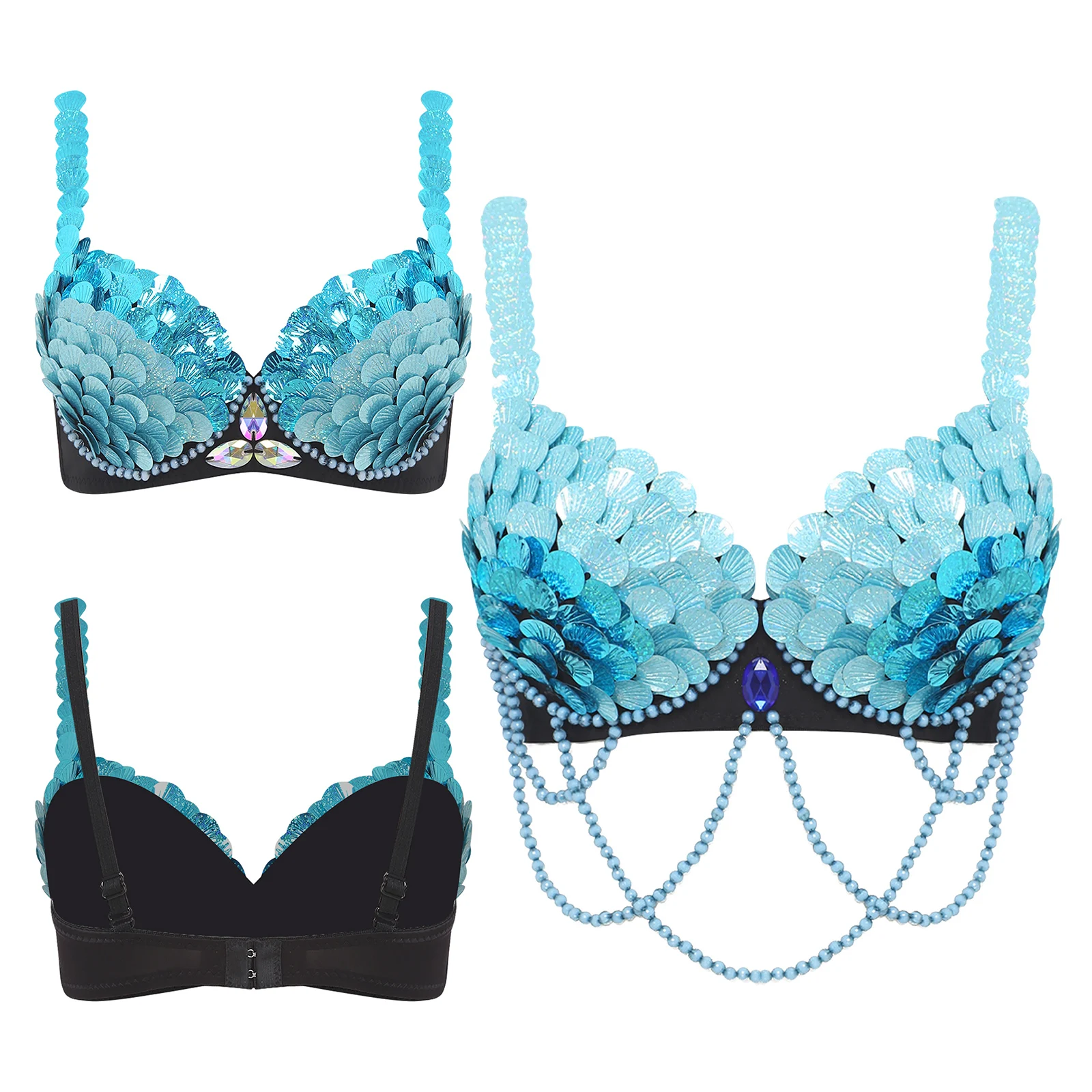 Womens Mermaid Belly Dance Cosplay Costume Raves Festival Bra Top Fish-scale Sequins Decor Push-up Underwire Bralette Balconette