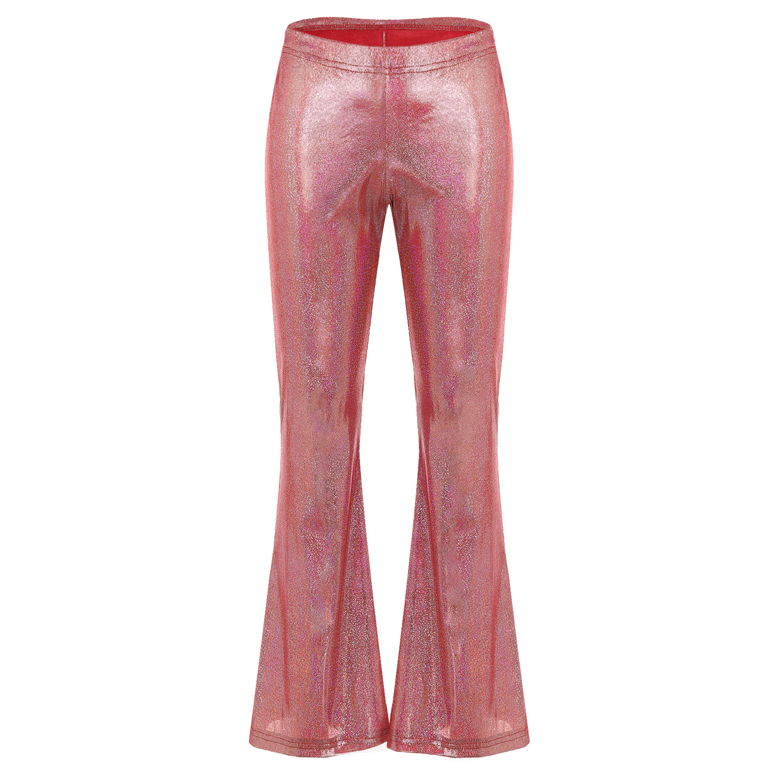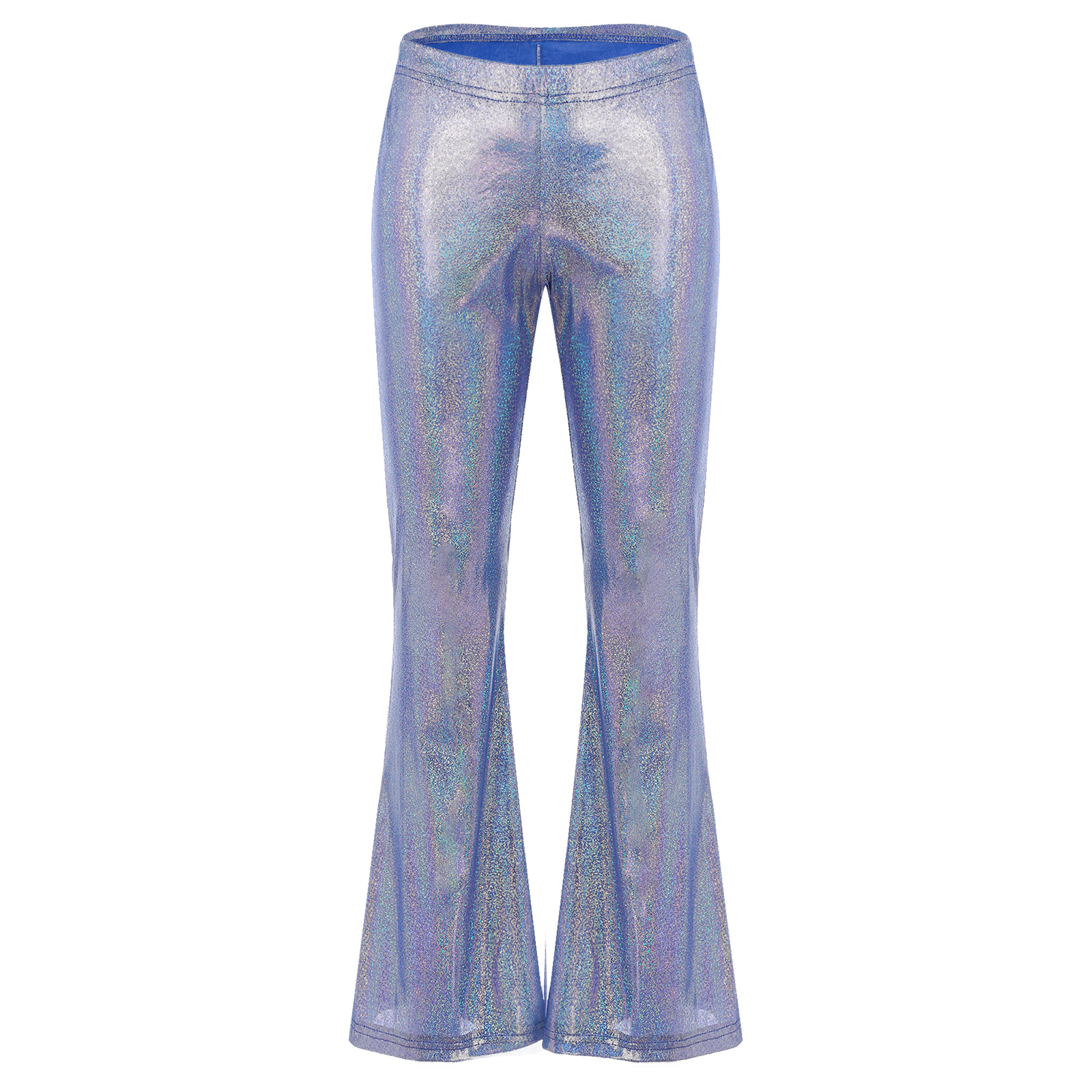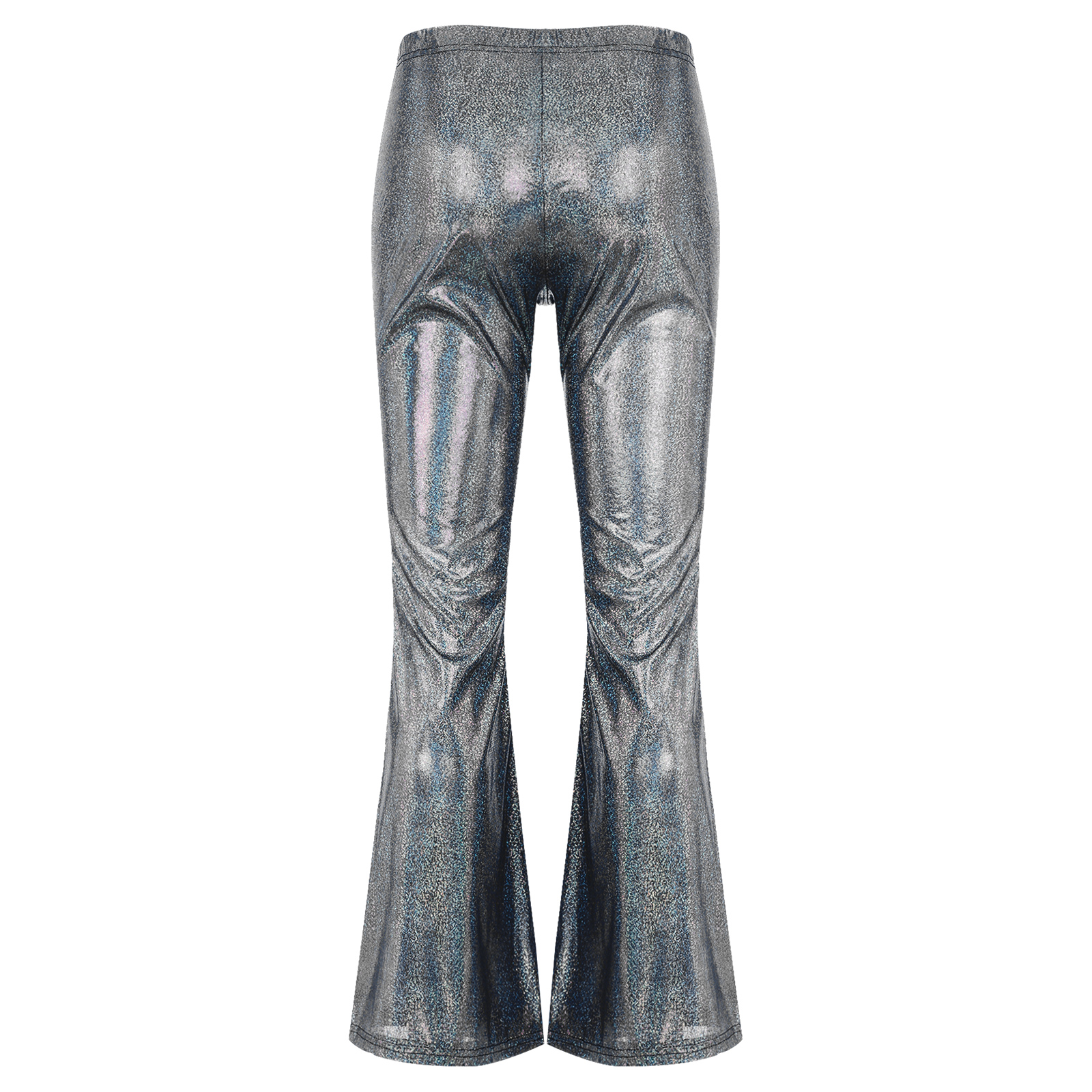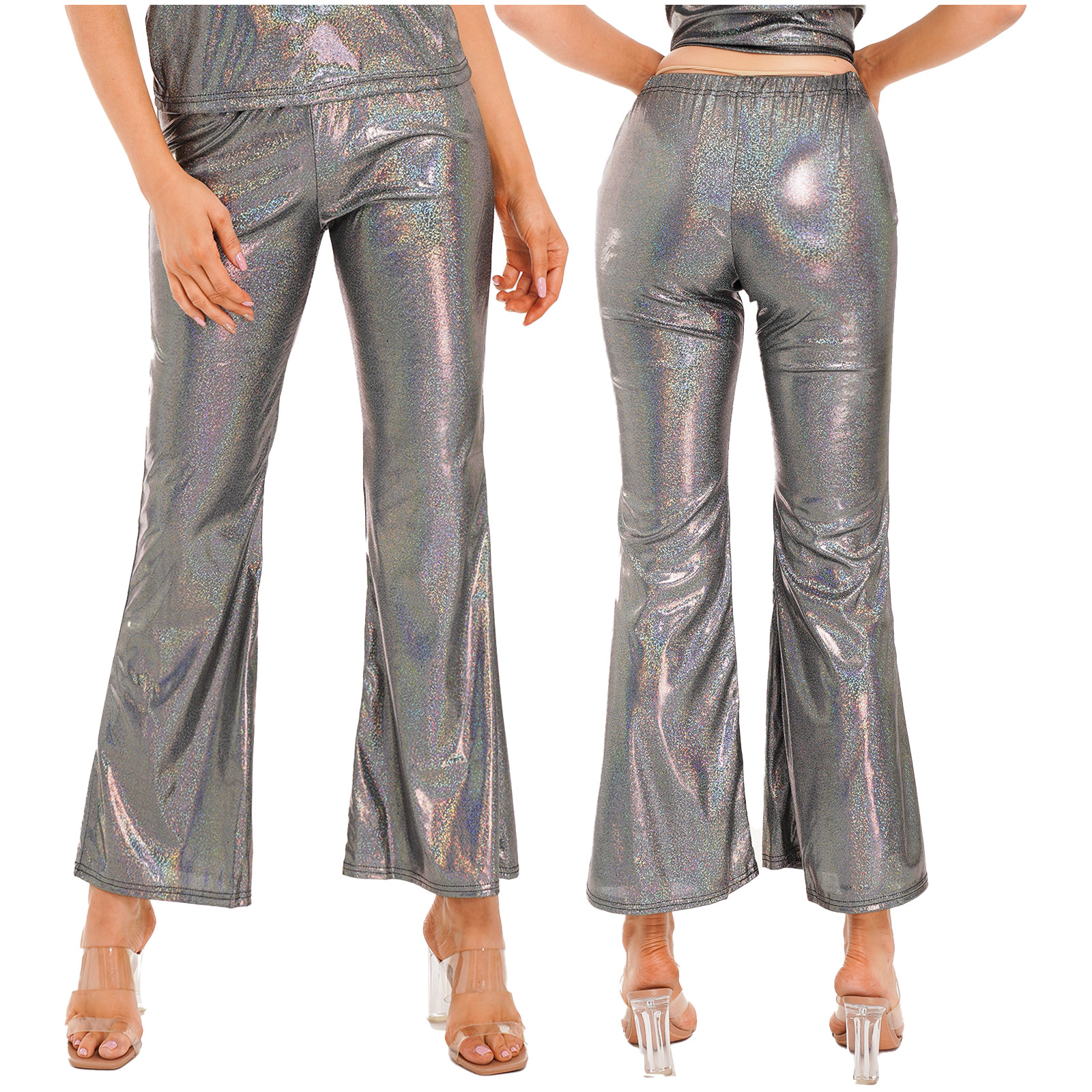 Womens New Fashion Shiny Holographic Flared Pants Elastic Waistband Bell-Bottomed Trousers for Dance Party Club Music Festival